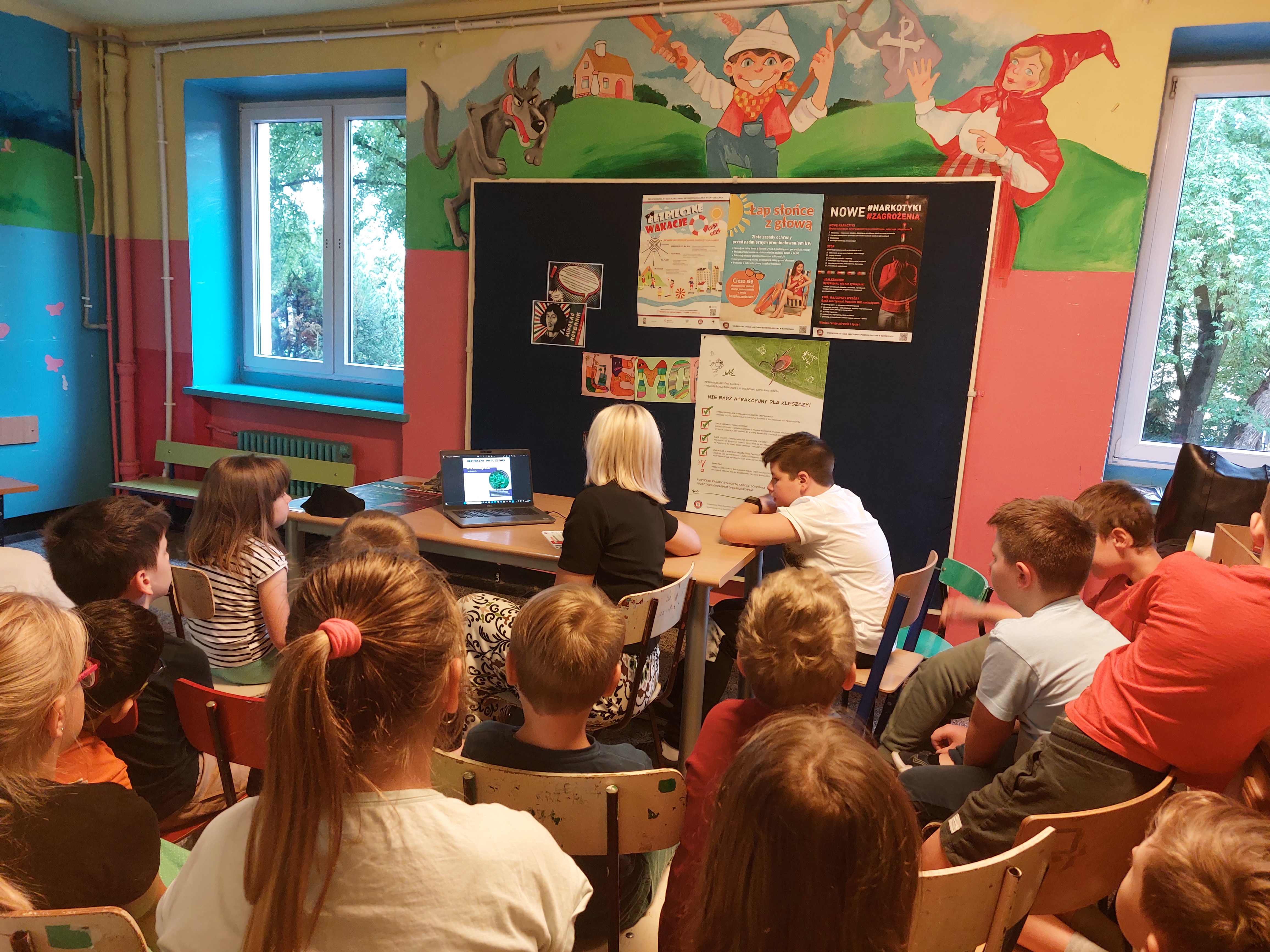 Na terenie Szkoły Podstawowej nr 18 w Sosnowcu, pracownik Oświaty Zdrowotnej Państwowej Powiatowej Stacji Sanitarno - Epidemiologicznej w Sosnowcu zrealizował zajęcia profilaktyczno - informacyjne skierowane do uczestników półkolonii.