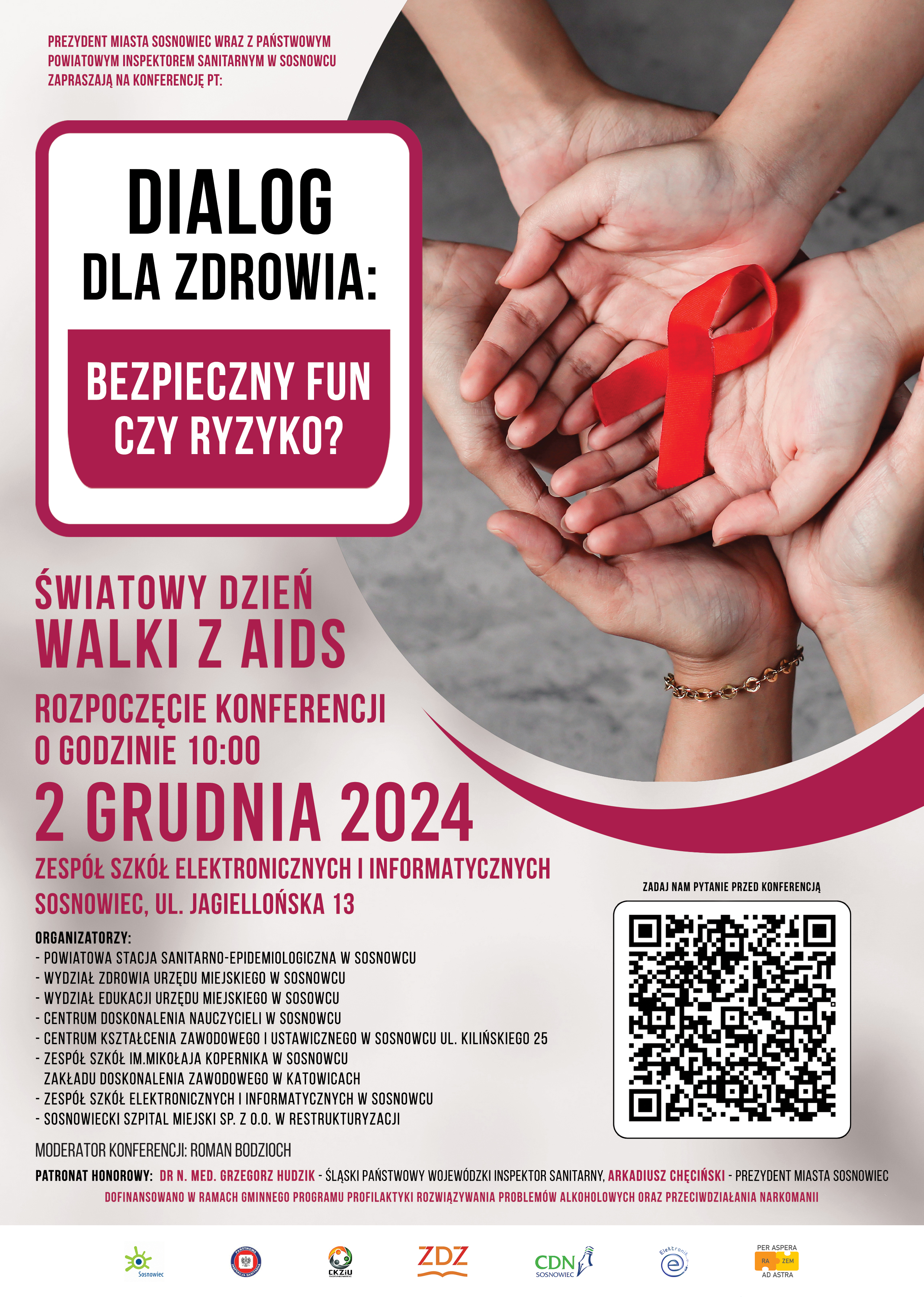 zapraszają w ramach Światowego Dnia Walki z Aids uczniów ósmych klas szkół podstawowych i pierwszych oraz drugich klas szkół ponadpodstawowych w Sosnowcu, pedagogów, psychologów, nauczycieli sosnowieckich szkół, władze miejskie i samorządowe do udziału w konferencji, której celem jest edukacja i budowanie świadomości młodzieży w obszarze profilaktyki HIV i AIDS. Dodatkowo pragniemy zapoznać uczestników z zasadami profilaktyki integralnej oraz promować zdrowy styl życia.