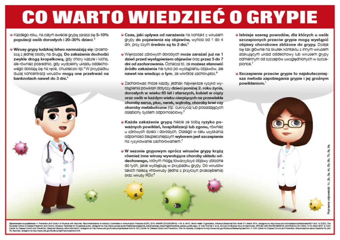 Państwowy Powiatowy Inspektor Sanitarny przypomina, że jesień i zima to okres wzmożonych zachorowań na grypę. Najskuteczniejszą metodą uniknięcia zachorowania i związanych z nim powikłań jest profilaktyka pod postacią corocznego szczepienia. Szczepienia zalecane są szczególnie osobom z obniżoną odpornością, osobom z przewlekłymi chorobami krążenia oraz układu oddechowego, dzieciom powyżej 6-tego miesiąca życia, osobom powyżej 50-tego roku życia, kobietom w ciąży, pracownikom służby zdrowia oraz osobom narażonym na kontakt z dużą liczbą ludzi.