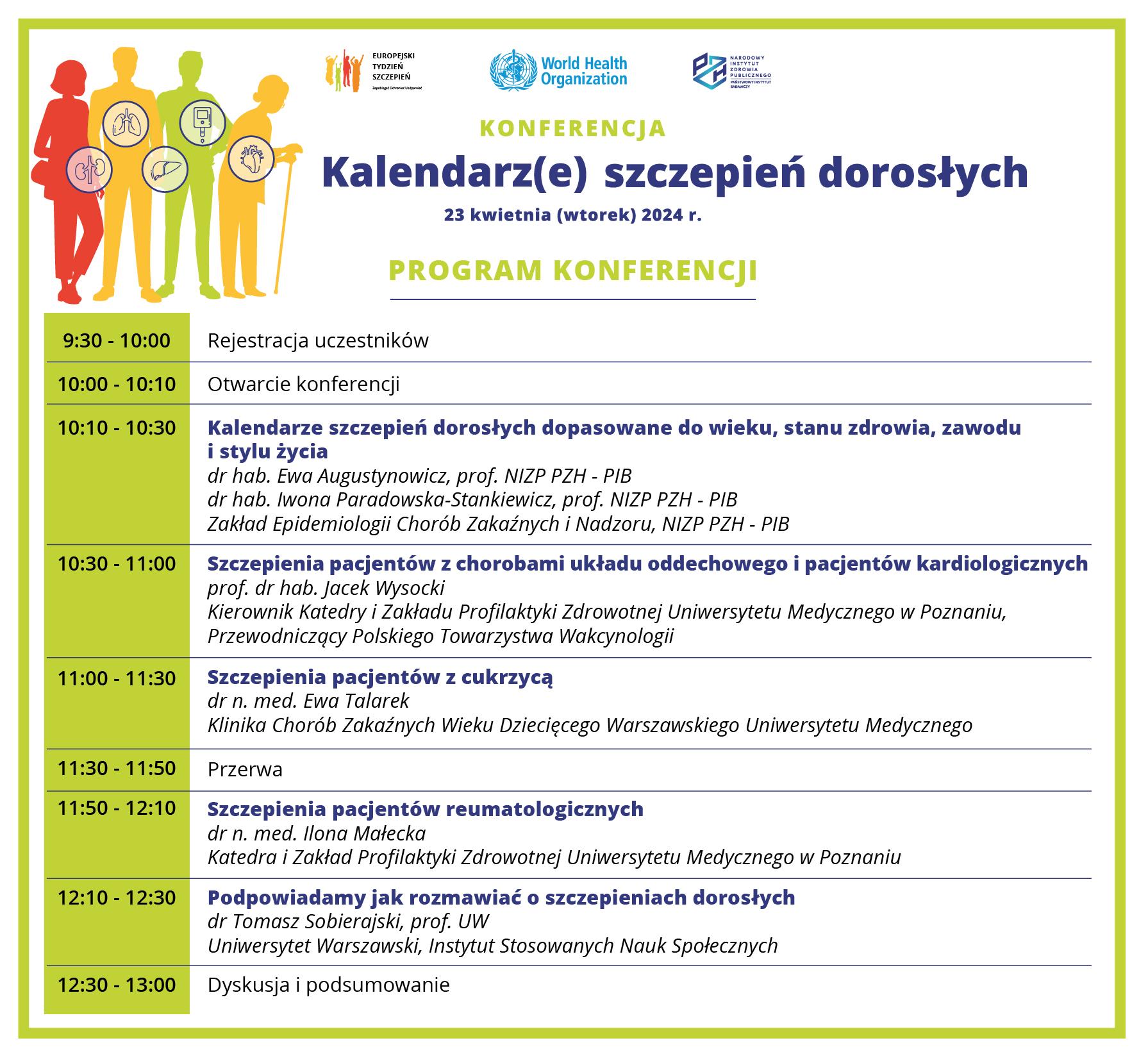 Jednocześnie, w imieniu Narodowego Instytutu Zdrowia Publicznego PZH - Państwowego Instytutu Badawczego przesyłam program i zapraszam do obejrzenia w dniu 23.04.2024 r. w godzinach 10.00 – 13.00 konferencji „Kalendarz(e) szczepień dorosłych”, zorganizowanej we współpracy z WHO z okazji Europejskiego Tygodnia Szczepień. Linki do transmisji znajdują się na stronach: