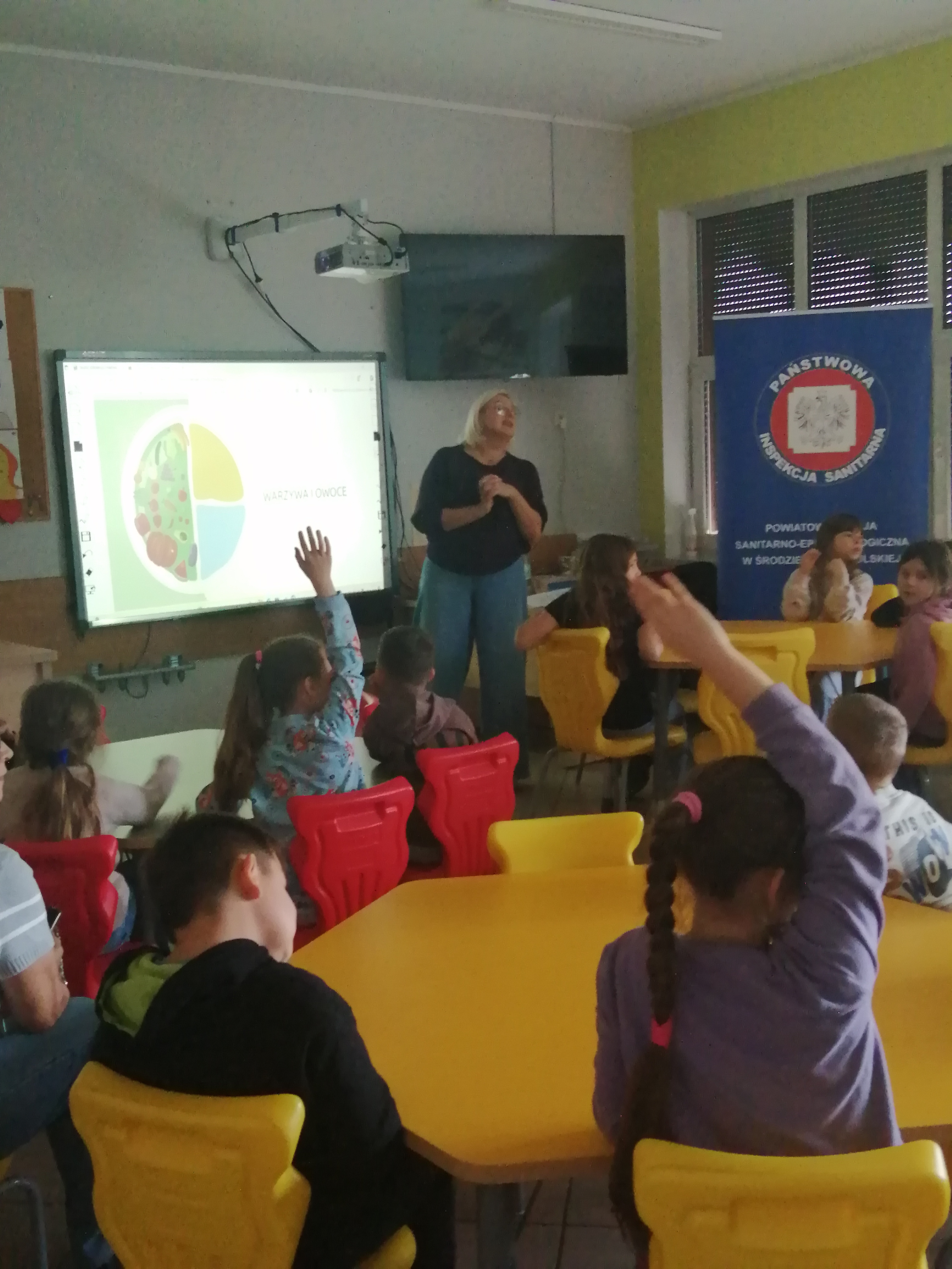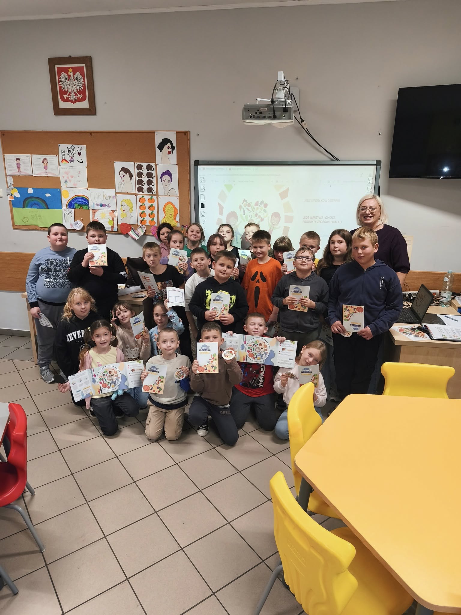 W dniu 23.10.2025 r. kontynuując zajęcia w ramach realizacji I edycji projektu edukacyjnego „Talerz zdrowego żywienia” w roku szkolnym 2025/2026 spotkaliśmy się z uczniami z klasy II i III ze Szkoły Podstawowej im. Gen. J.H. Dąbrowskiego w Starkówcu Piątkowskim. Podczas zajęć uczniowie dowiedzieli się o zasadach prawidłowego odżywiania, przedstawiono umiejętność odczytywania schematu „Talerz zdrowego żywienia” oraz odróżnienia produktów zdrowych dla organizmu od tych niekorzystnych. Uczniowie aktywnie brali udział w zajęciach poprzez udzielanie odpowiedzi, uczestnictwo w zagadkach. Wszystkie dzieci otrzymały broszurkę edukacyjną „Talerz zdrowego żywienia”, magnes z logo projektu a cała grupa dyplom za udział w zajęciach na temat prawidłowego odżywiania. Celem realizowanego projektu jest budowanie właściwych nawyków żywieniowych u dzieci.