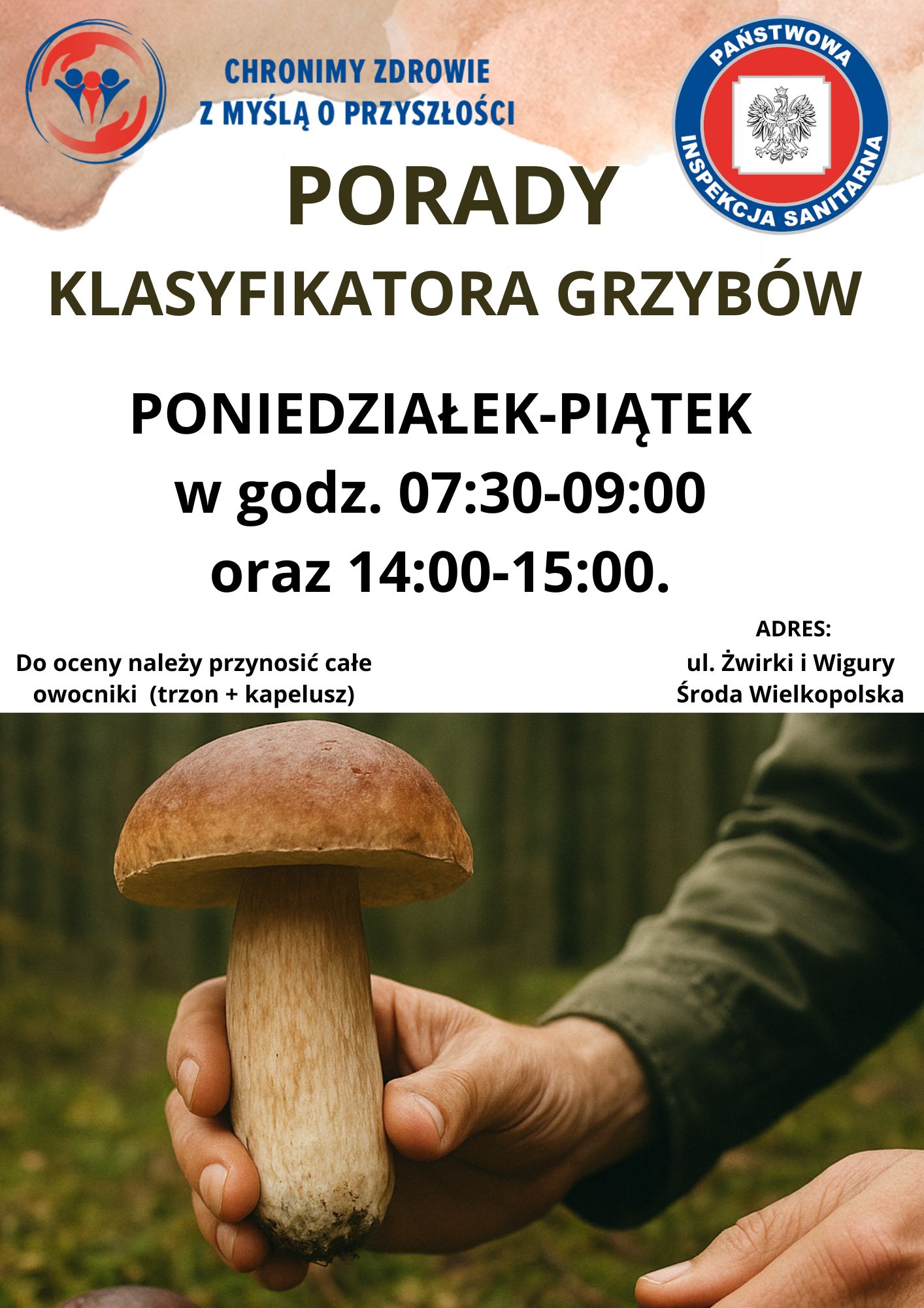 Klasyfikator grzybów udziela porad grzybowych w zakresie określenia przynależności gatunkowej grzybów świeżych, od poniedziałku do piątku w godz. 7.30 – 9.30 w Powiatowej Stacji Sanitarno – Epidemiologicznej w Środzie Wielkopolskiej, ul. Żwirki i Wigury 1 (piętro I)