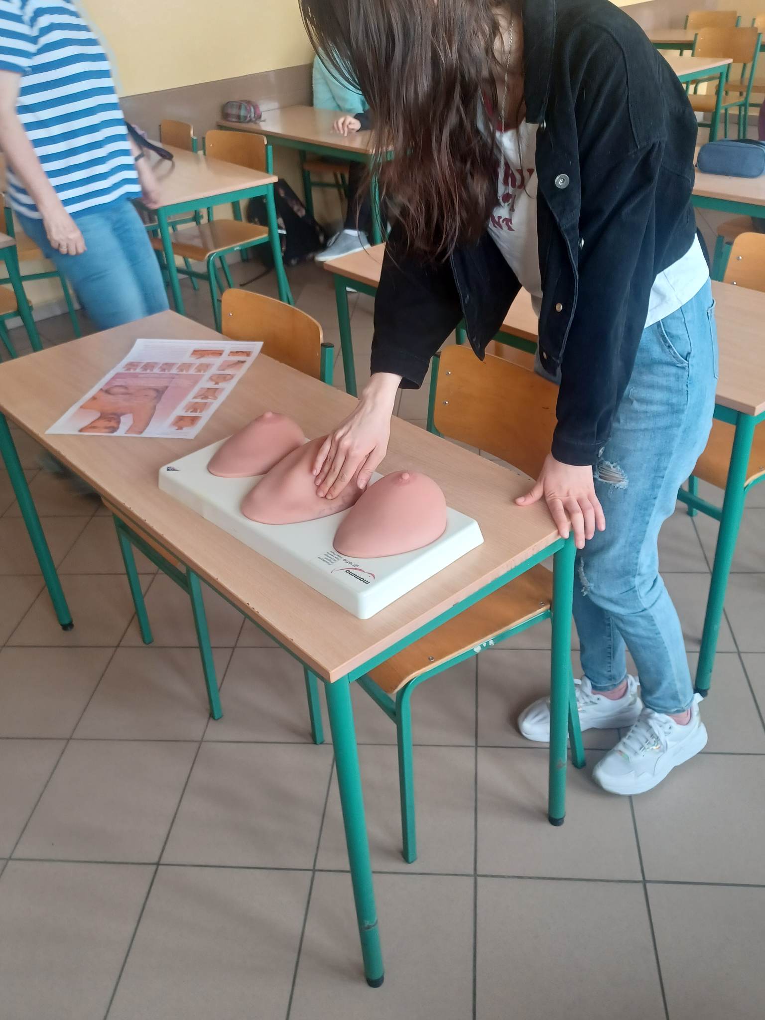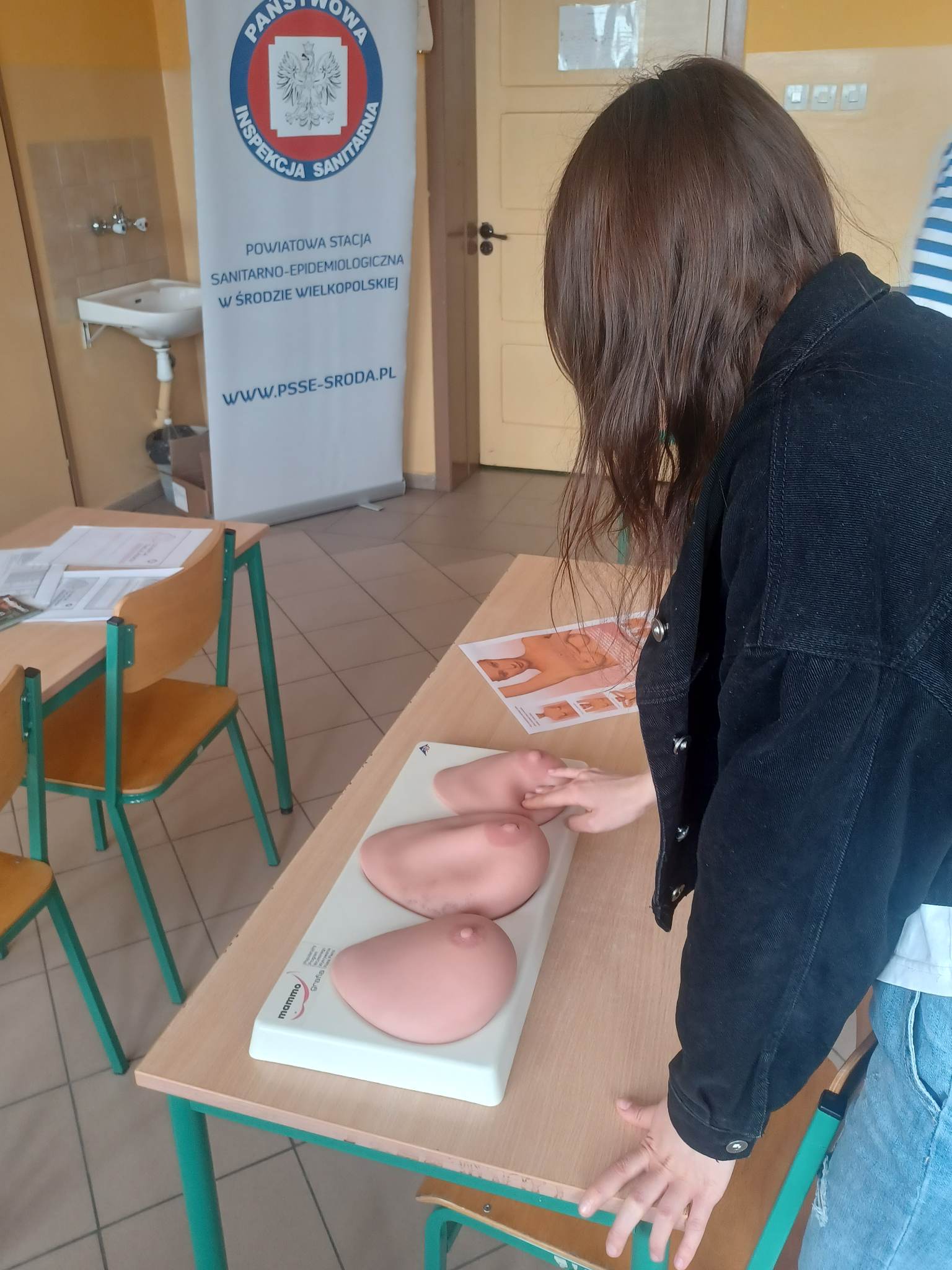 Państwowy Powiatowy Inspektor Sanitarny w Środzie Wielkopolskiej informuje, że w Centrum Kształcenia Zawodowego i Ustawicznego w Środzie Wielkopolskiej w ramach realizacji projektu edukacyjnego pt. „Co kryją Twoje piesi?” odbyło się szkolenie połączonego z nauką samobadania piersi na fantomach. W szkoleniu uczestniczyli uczniowie dwóch klas: III Td i IV Td. Podczas szkolenia omówiono epidemiologię występowania nowotworów w Polsce, patogenezę, czynniki ryzyka i objawy raka piesi, profilaktykę raka piersi. W drugiej części odbył się pokaz nauki samobadania piersi z użyciem fantomu.