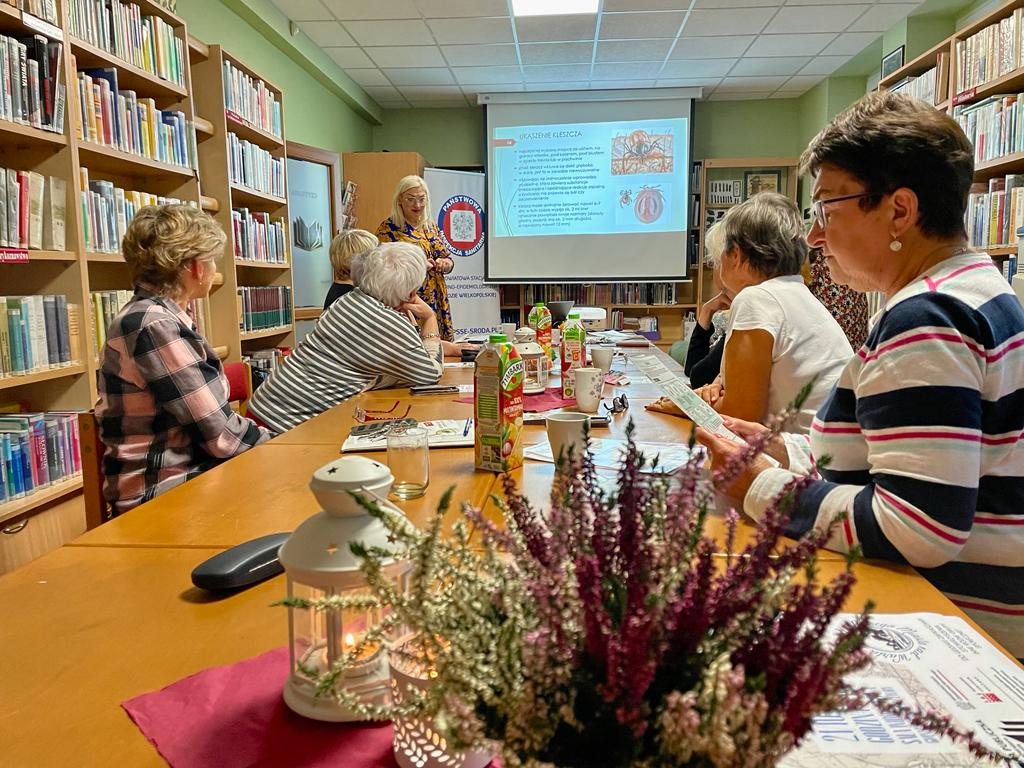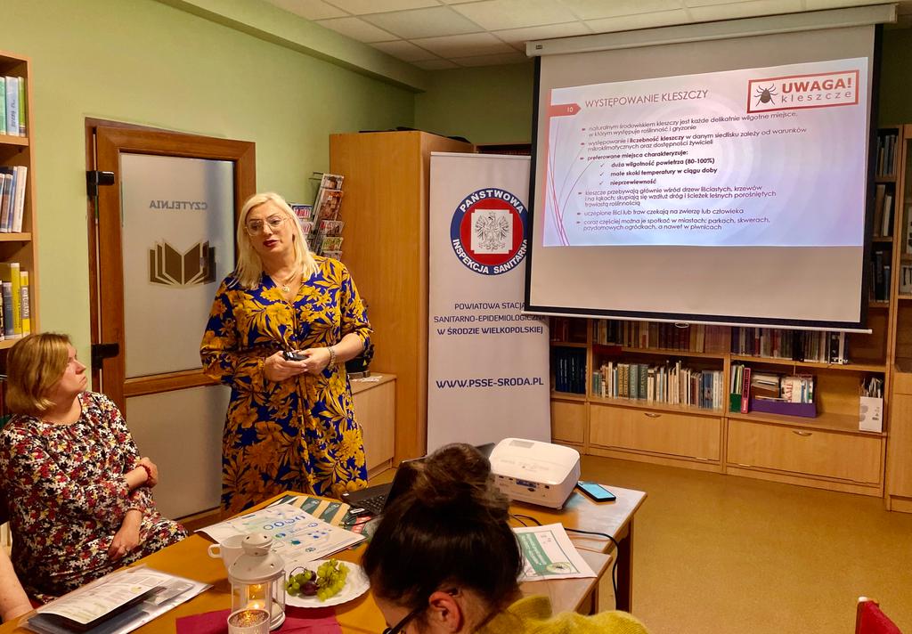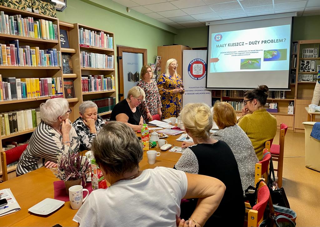 Państwowy Powiatowy Inspektor Sanitarny w Środzie Wielkopolskiej informuje, że w dniu 12.10.2023 r. w Bibliotece Publicznej Gminy Nowe Miasto nad Wartą odbyło się szkolenie w ramach prowadzonej profilaktyki chorób odkleszczowych przeprowadzone przez pracowników Higieny Dzieci i Młodzieży oraz Oświaty Zdrowotnej i Promocji Zdrowia. Uczestniczki – panie z Koła Gospodyń Wiejskich w Nowym Mieście nad Wartą, dowiedziały się, gdzie występują i jak żerują kleszcze, a także jak zmniejszyć ryzyko ukąszenia, stosując repelenty. Zaprezentowano również prawidłowe sposoby usuwania kleszczy za pomocą kleszczołapek, pęsety, lassa.