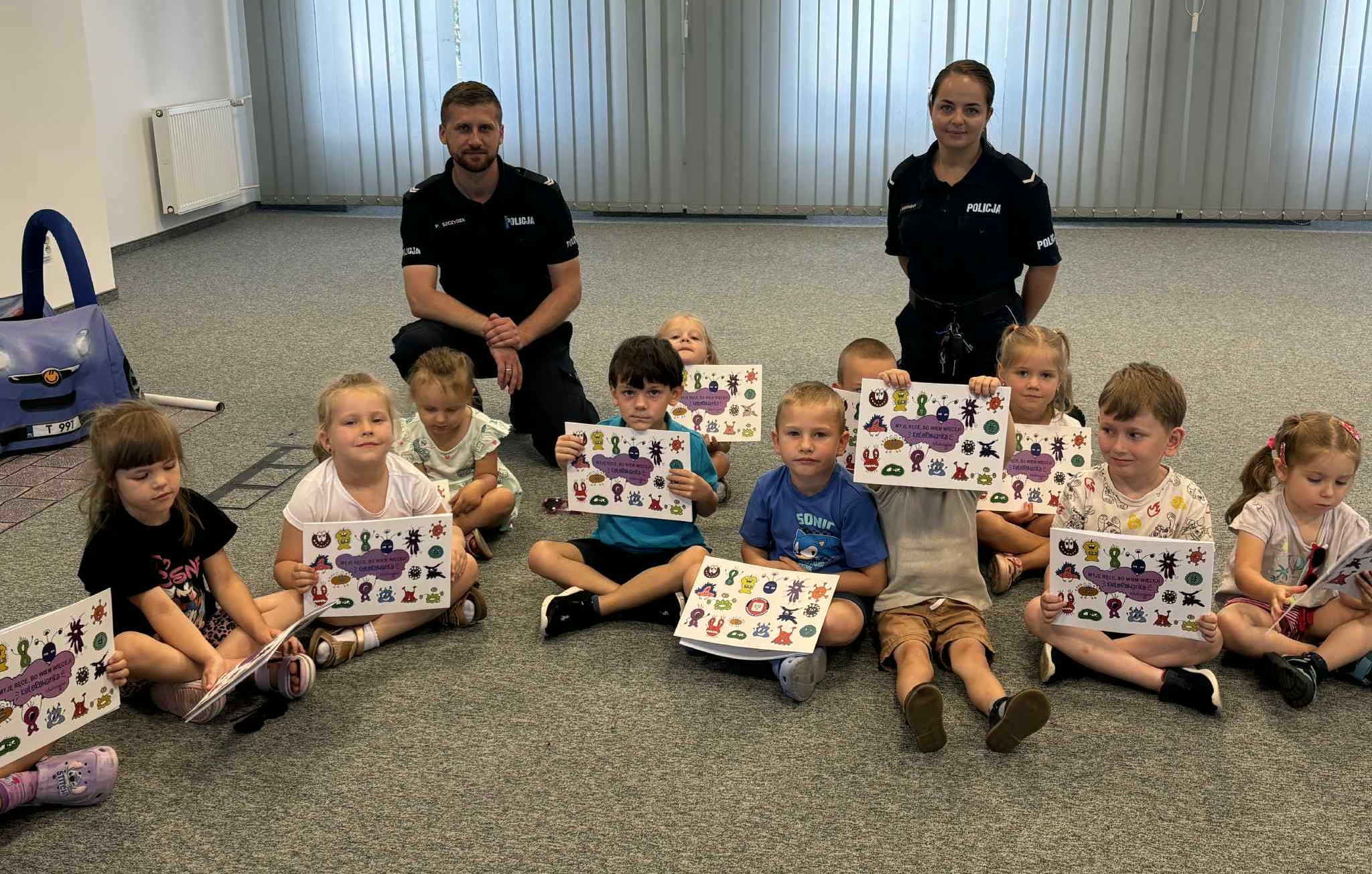 Podczas wizyty mogły nie tylko zobaczyć, jak wygląda praca funkcjonariuszy, ale również wziąć udział w wyjątkowych zajęciach edukacyjnych. Po zwiedzaniu komendy spotkaliśmy się w sali im. por. Zdzisława Rachtana ps. „Halny”, gdzie przedstawicielka Państwowej Inspekcji Sanitarnej poprowadziła zajęcia edukacyjne – oczywiście w formie zabawy! Dzieci dowiedziały się, jak prawidłowo myć ręce, kiedy warto to robić i dlaczego jest to takie ważne dla zdrowia. Nie zabrakło też radości z nauki wierszyka „Czyściocha”, który pomoże najmłodszym zapamiętać zasady higieny w codziennym życiu! Nasze wspólne działania to efekt bardzo dobrej współpracy między Komendą Powiatową Policji a Inspekcją Sanitarną. Na zakończenie każde dziecko otrzymało edukacyjną książeczkę „Myję ręce, bo wiem więcej” i wróciło do przedszkola bogatsze o wiedzę na temat bezpieczeństwa, zdrowia i pracy policjantów. Dziękujemy za zaproszenie i wspólnie spędzony czas!