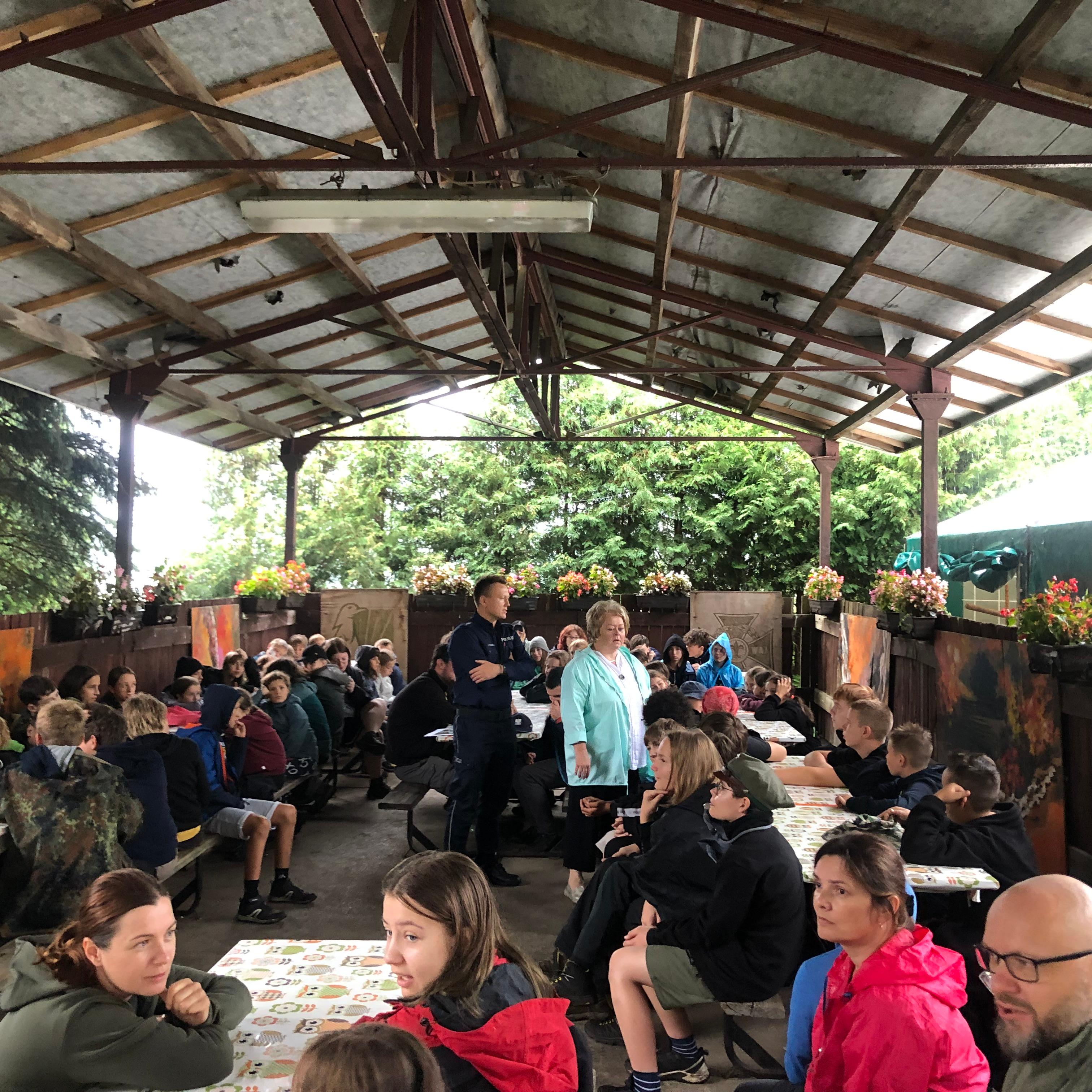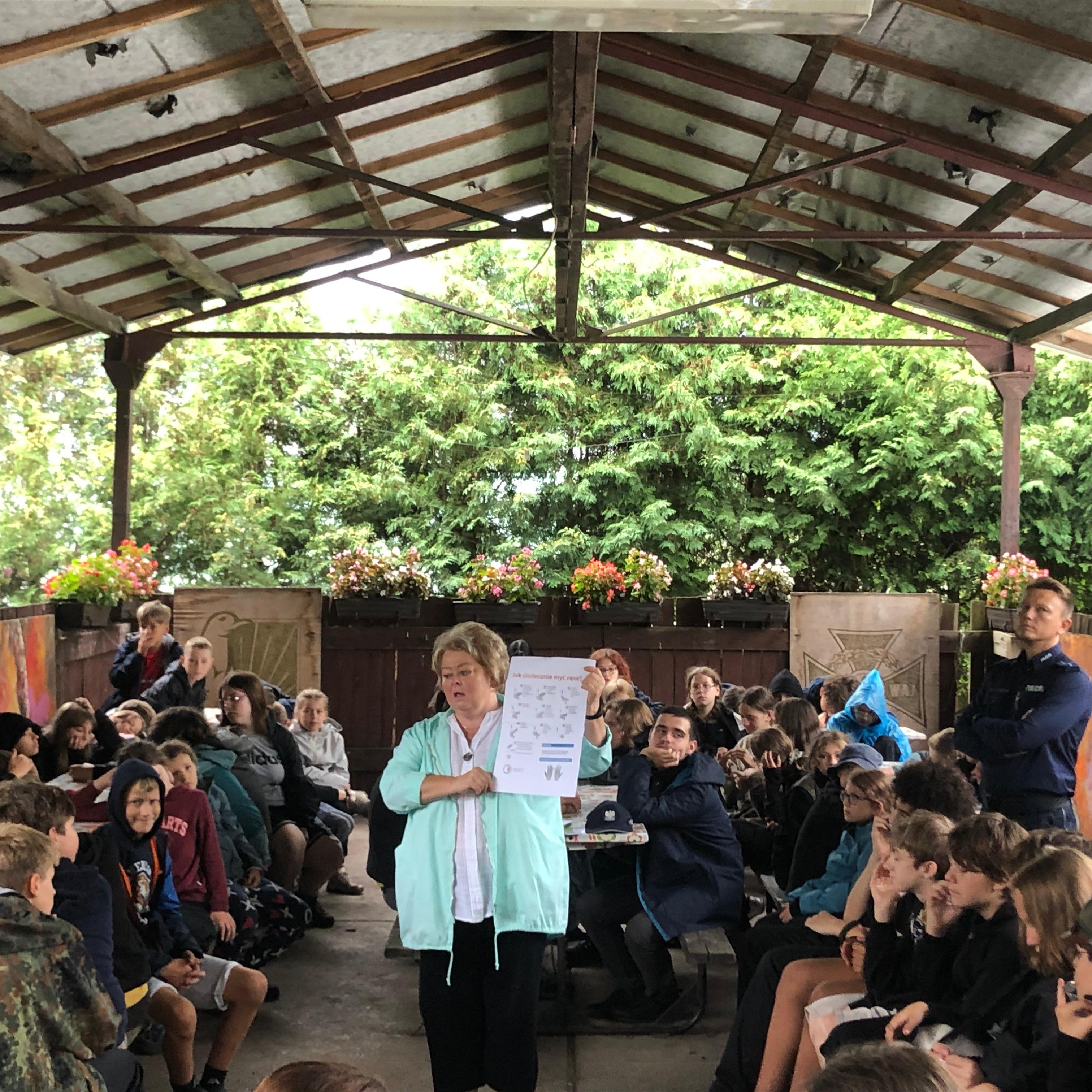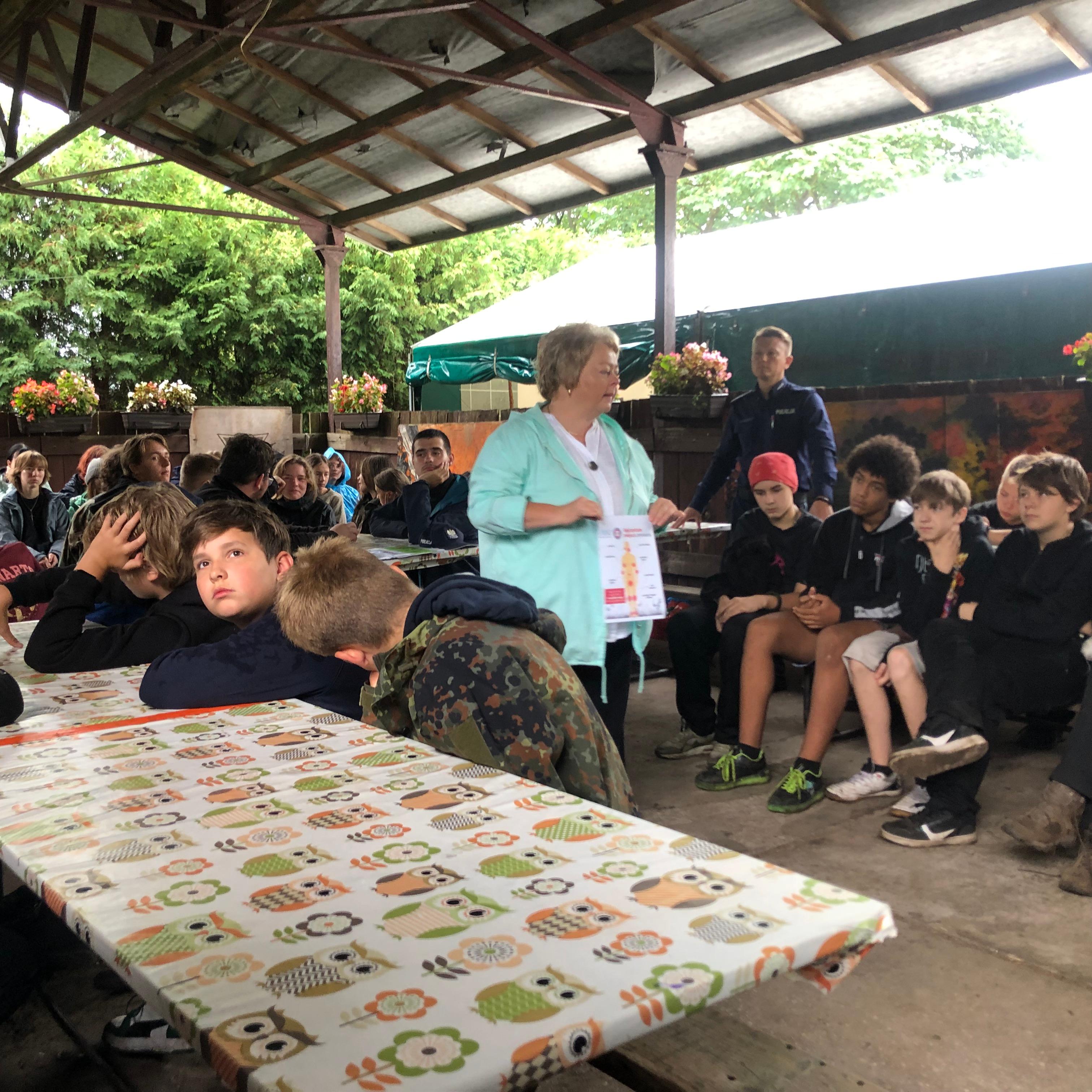 Na spotkaniu poruszono zagadnienia dotyczące higieny mycia rąk, zaprezentowano i szczegółowo omówiono instrukcję mycia rąk. Przedstawiono zasady bezpiecznego wypoczynku w lesie i nad wodą. Dużo uwagi poświęcono chorobom odkleszczowym, zachowaniom podczas upałów, mówiono jak przetrwać upały, czym ugasić pragnienie. Zachęcano do stosowania kremów z filtrem, chronienia głowy i oczu przed słońcem oraz unikania ekspozycji na słońce w godzinach 11.00 – 15.00. Funkcjonariusz KPP, również dzielił się swoja wiedzą z uczestnikami obozu zwracając uwagę na konieczność prawidłowego zachowania podczas poruszania się po drogach, zarówno przez pieszych, jak i rowerzystów. Podkreślał jak ważna dla bezpieczeństwa jest kąpiel w miejscach do tego przeznaczonych, przestrzegał przed zabawą na tzw. „dzikich kąpieliskach”.