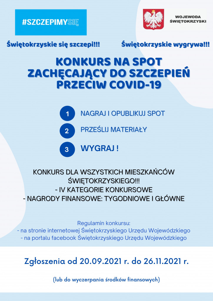 Państwowy Powiatowy Inspektor Sanitarny w Starachowicach zaprasza do udziału w konkursie ogłoszonym przez Wojewodę Świętokrzyskiego na spot lub materiał filmowy zachęcający do szczepień mieszkańców województwa świętokrzyskiego i informujący o korzyściach płynących ze szczepienia przeciwko COVID-19.