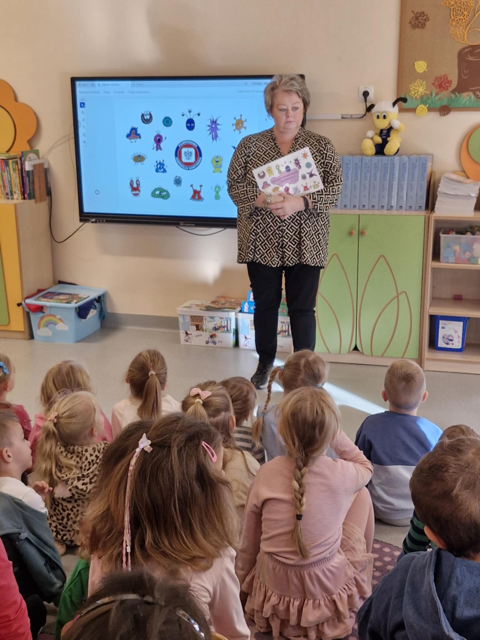 Przedszkolaki dowiedziały się jakie zagrożenia dla zdrowia stanowią drobnoustroje chorobotwórcze, poznały informację w jaki sposób zarazki przenoszone są przez brudne ręce, utrwaliły nawyk mycia rąk w odpowiednich sytuacjach oraz prawidłowy sposób mycia rąk. Rozmawiano również o higienie jam ustnej, prawidłowym szczotkowaniu zębów. Na koniec dzieci obejrzały bajkę edukacyjną „Dr Ząbek i legenda Zębolandii”, która miała na celu uświadomić dzieciom, że systematycznie wykonywane zabiegi higieniczne, racjonalne odżywianie i okresowe kontrole zębów przez stomatologa są najskuteczniejszym działaniem profilaktycznym. Na zakończenie odbyła się dyskusja, dzieci zadawały pytania i otrzymały karty edukacyjne do pokolorowania.