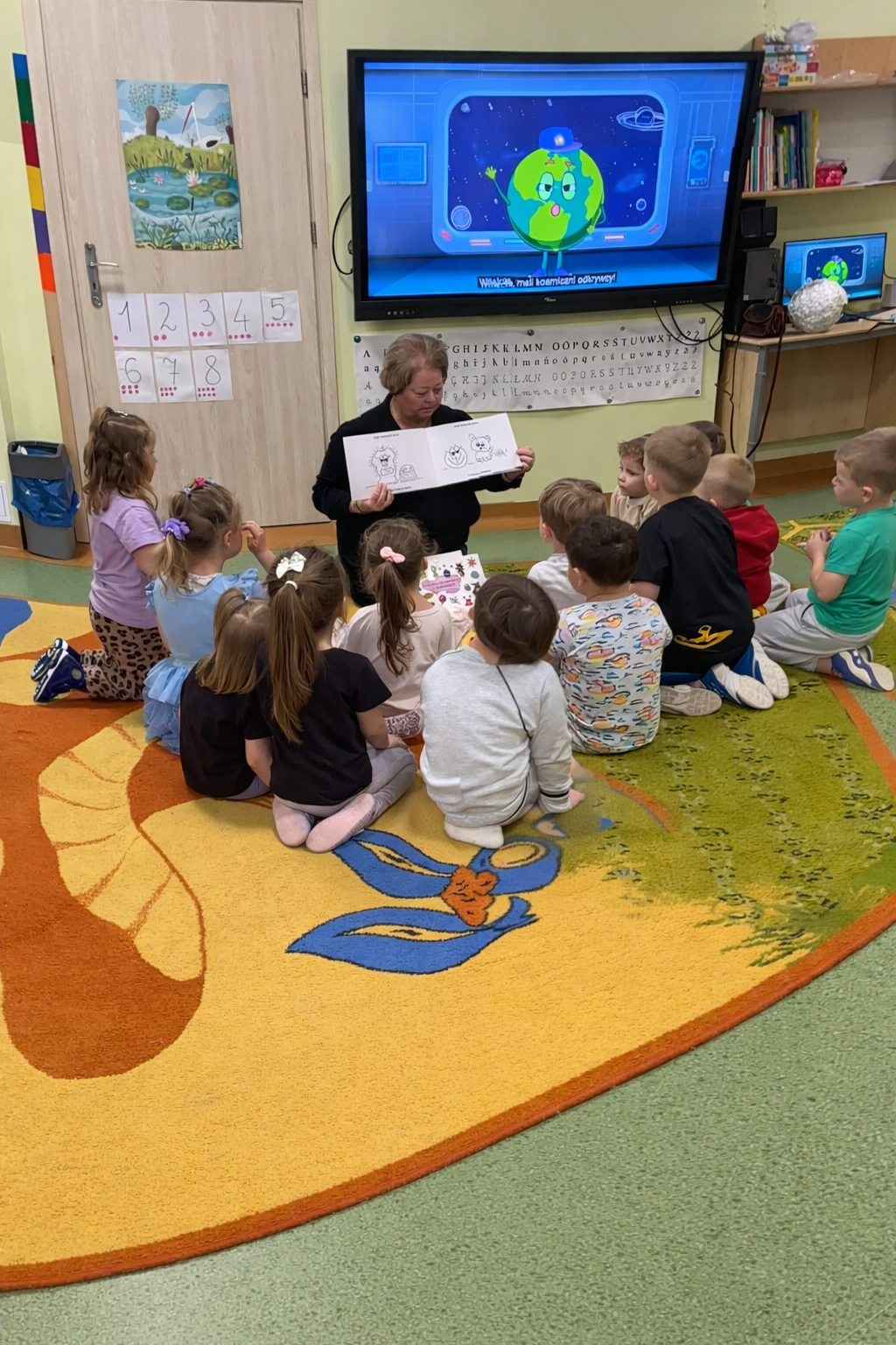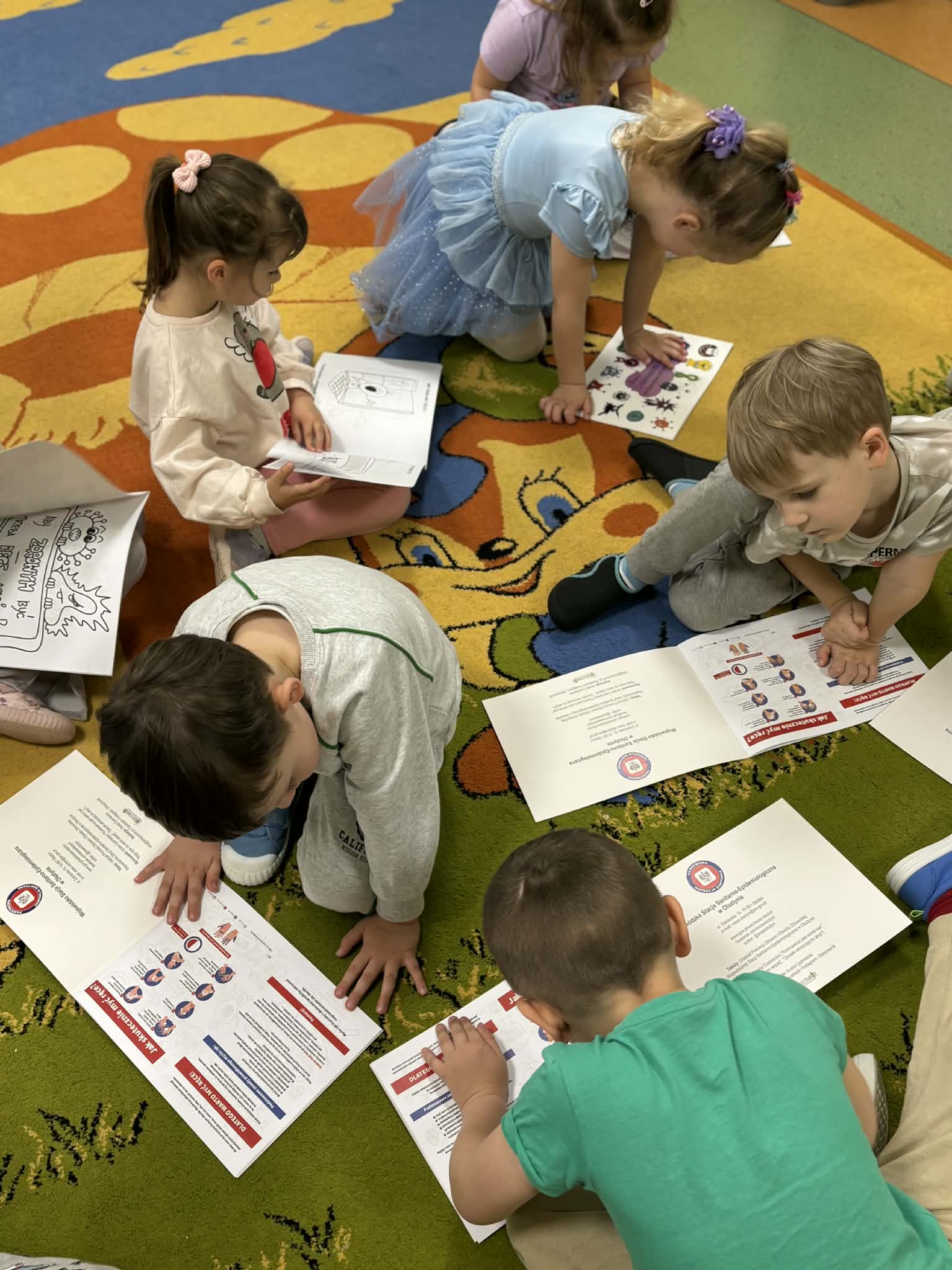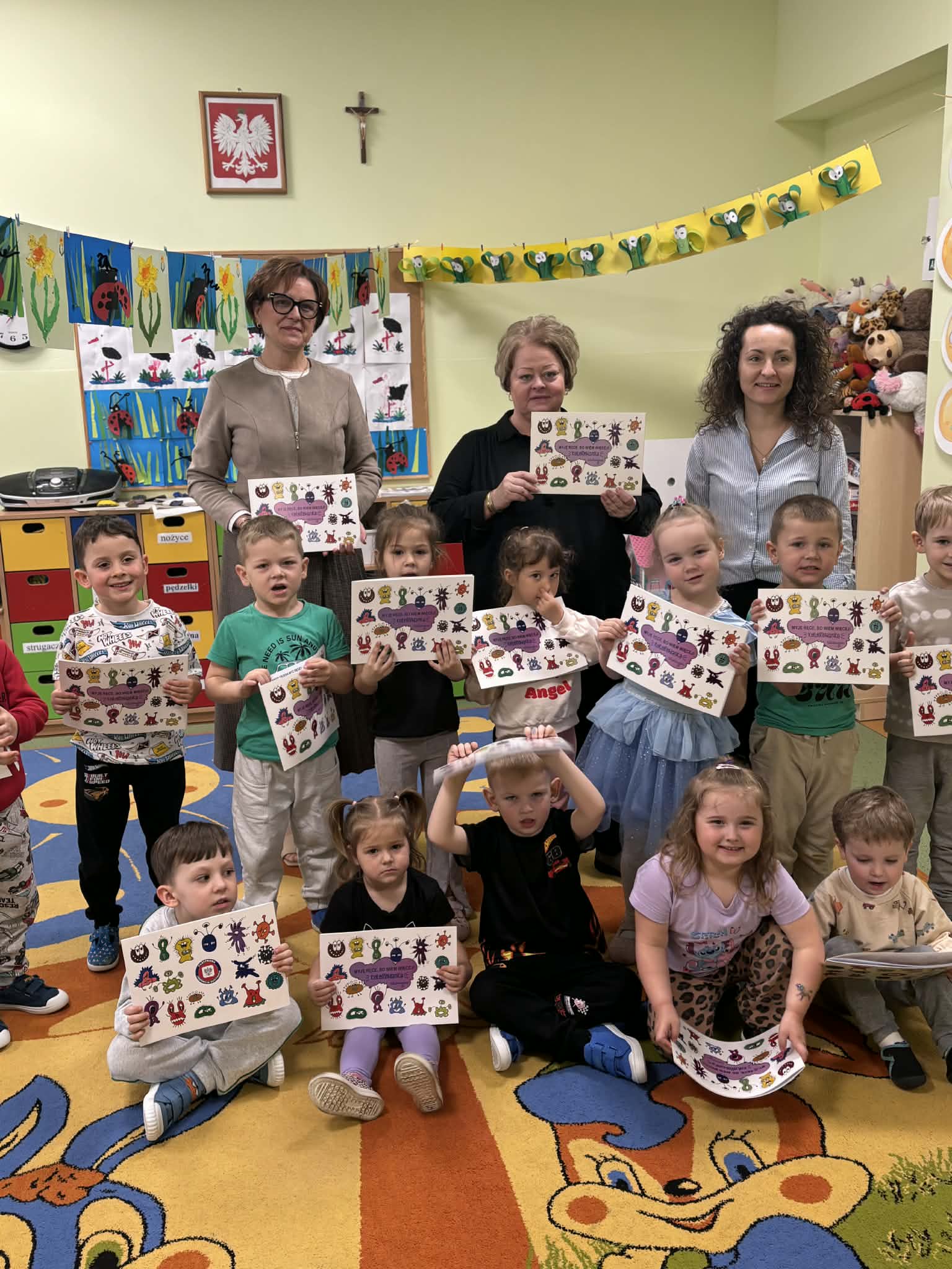 Podczas spotkania dzieci w sposób dostosowany do ich wieku poznały podstawowe zasady dbania o higienę rąk. Omówiono, dlaczego mycie rąk jest tak ważne, jakie drobnoustroje mogą znajdować się na dłoniach oraz w jakich sytuacjach należy szczególnie pamiętać o ich myciu (m.in. przed jedzeniem, po skorzystaniu z toalety, po powrocie z placu zabaw). Prowadząca zaprezentował także prawidłową technikę mycia rąk, zwracając uwagę na dokładność oraz odpowiedni czas trwania tej czynności. Dzieci aktywnie uczestniczyły w zajęciach – chętnie odpowiadały na pytania, dzieliły się swoimi doświadczeniami. Spotkanie miało formę interaktywną i było prowadzone w sposób atrakcyjny, z wykorzystaniem elementów zabawy, co sprzyjało lepszemu przyswajaniu wiedzy przez najmłodszych. Dzieci wykazały duże zainteresowanie tematem oraz zaangażowanie w proponowane aktywności. Na zakończenie spotkania przedszkolaki otrzymały kolorowanki edukacyjne pod tytułem „Myję ręce, bo wiem więcej”, które stanowiły utrwalenie zdobytych wiadomości oraz zachętę do codziennego stosowania zasad higieny. Spotkanie przebiegło w miłej, przyjaznej atmosferze i było wartościowym elementem działań profilaktycznych realizowanych w przedszkolu.