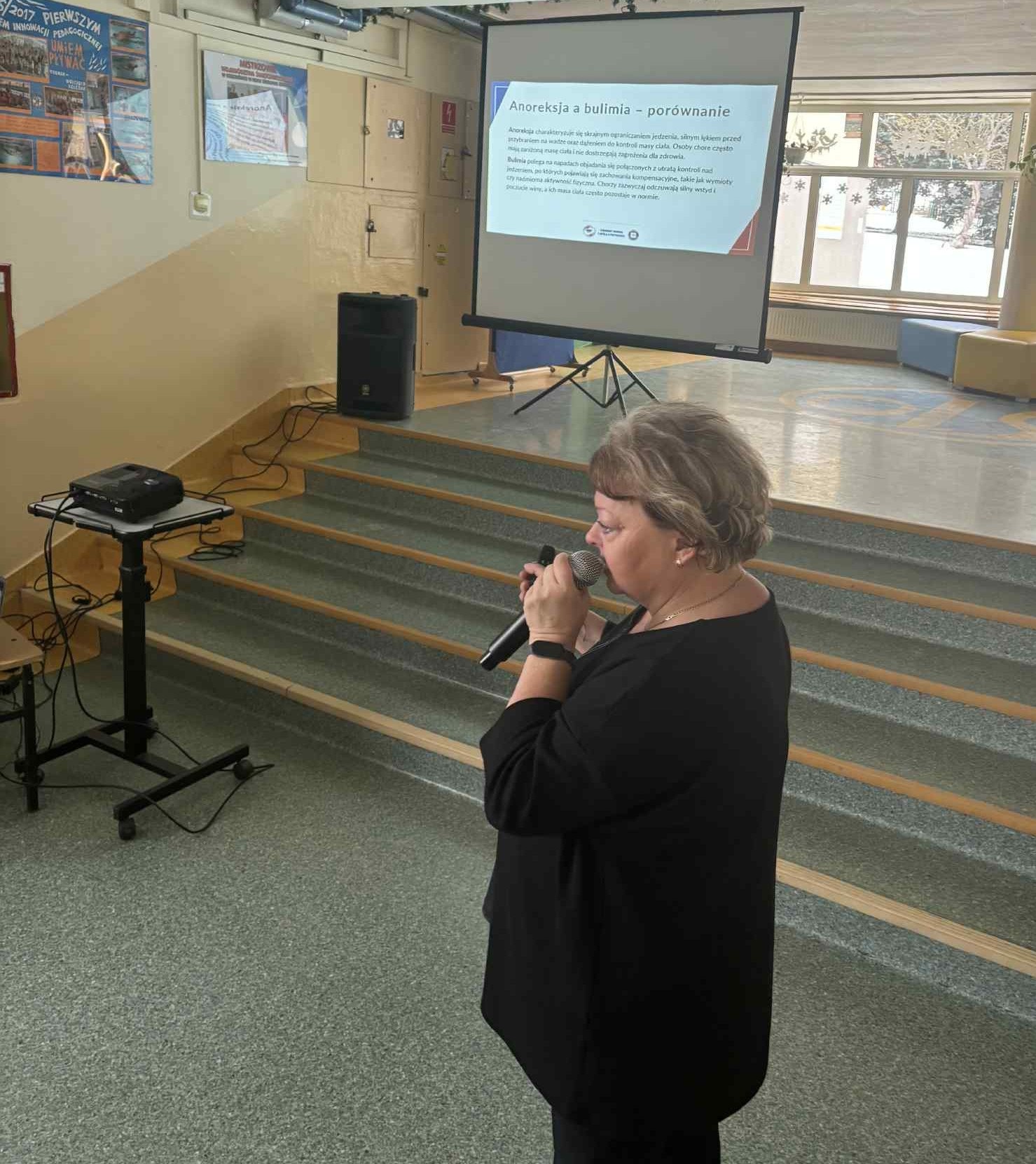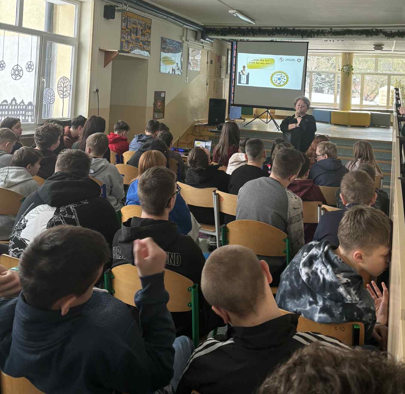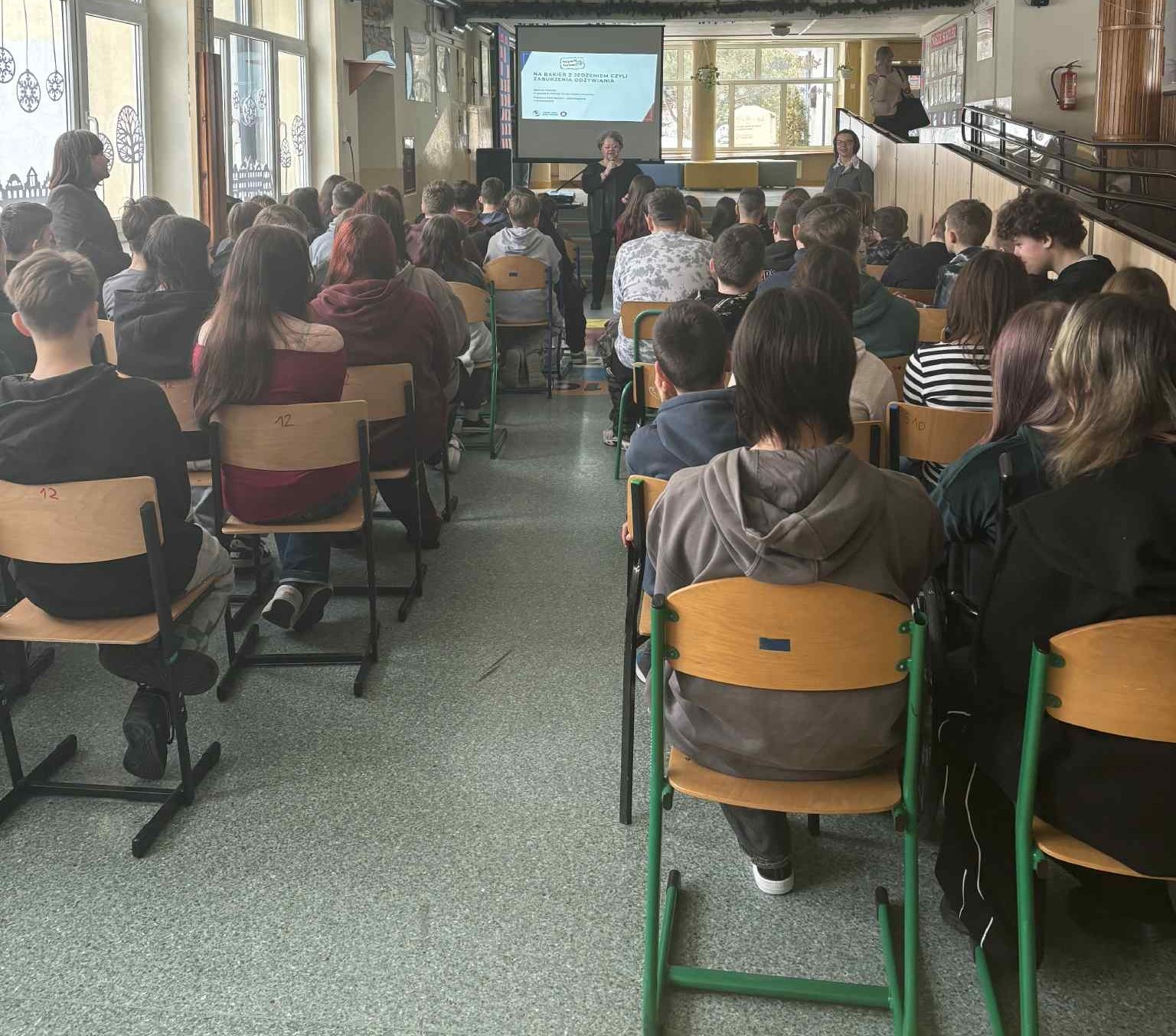 Tematyka zajęć obejmowała zasady prawidłowego odżywiania, zaburzenia odżywiania oraz rolę aktywności fizycznej jako kluczowego elementu dbałości o zdrowie. Uczniom zaprezentowano wykład multimedialny pt. „Na bakier z jedzeniem, czyli zaburzenia odżywiania”. W trakcie spotkania szczegółowo omówiono pojęcie zdrowia oraz czynniki warunkujące jego utrzymanie. Przybliżono problematykę zaburzeń odżywiania, takich jak anoreksja, bulimia oraz otyłość, a także dokonano analizy możliwych powikłań zdrowotnych wynikających z tych schorzeń. Zwrócono szczególną uwagę na korzyści płynące z regularnej aktywności fizycznej, podkreślono również, że odżywianie stanowi jedną z najważniejszych sfer życia człowieka, mającą bezpośredni wpływ na samopoczucie, sprawność fizyczną i psychiczną oraz jakość codziennego funkcjonowania. Na zakończenie spotkania uczniowie zostali zapoznani z zasadami racjonalnego odżywiania, opartymi na koncepcji talerza zdrowia, który w czytelny sposób obrazuje proporcje poszczególnych grup produktów w codziennej diecie. Spotkanie miało na celu kształtowanie prawidłowych postaw prozdrowotnych, zwiększenie świadomości młodzieży na temat zagrożeń wynikających z nieprawidłowych nawyków żywieniowych oraz zachęcenie uczniów do podejmowania świadomych, odpowiedzialnych wyborów sprzyjających zachowaniu zdrowia na długie lata.