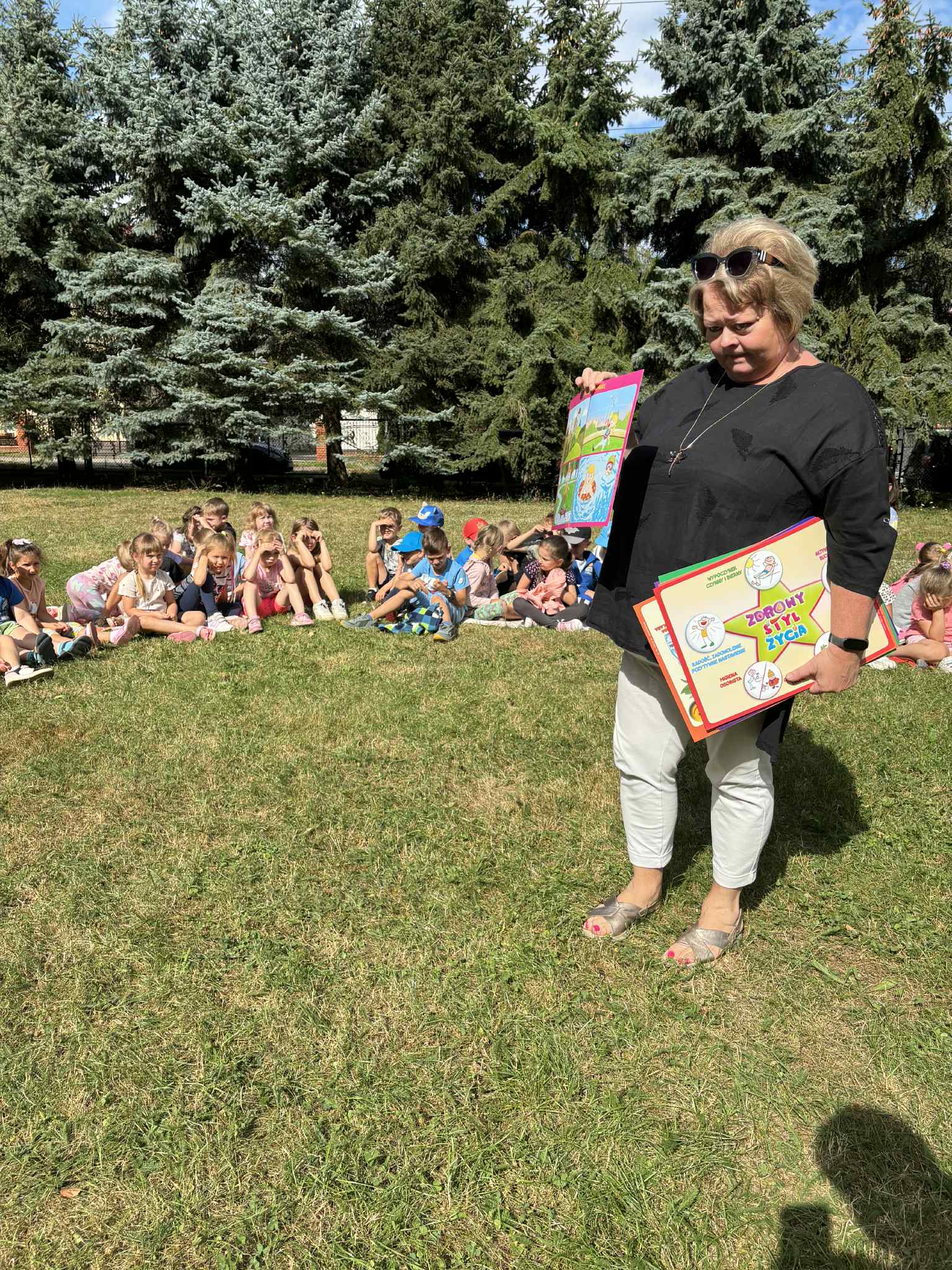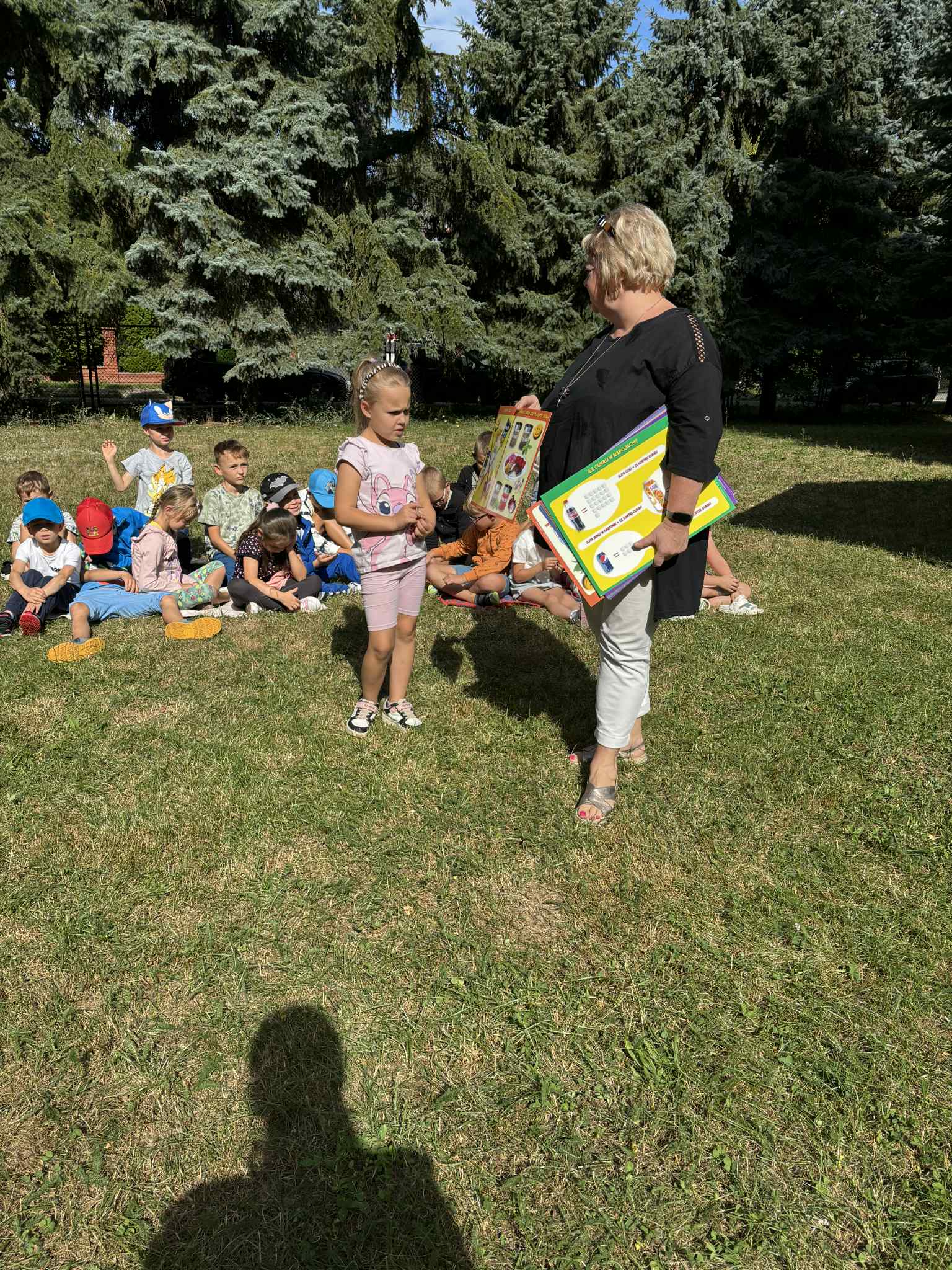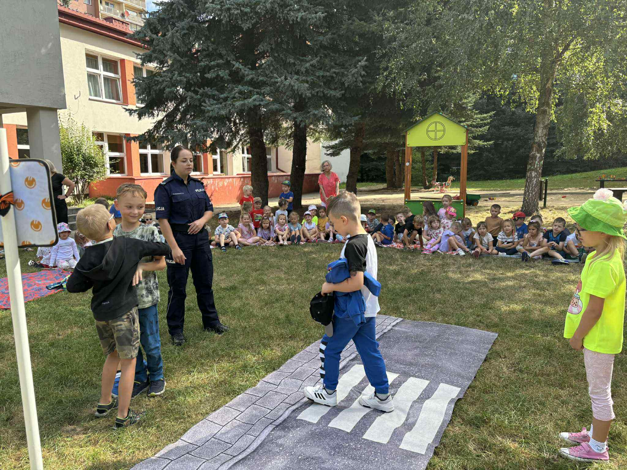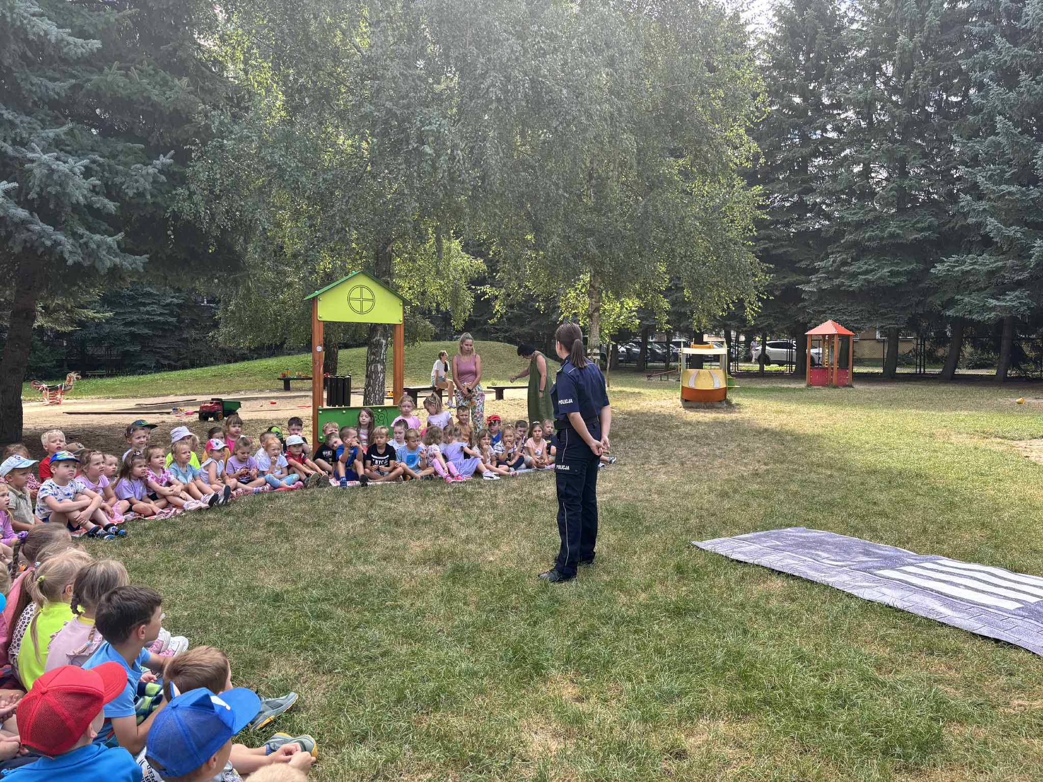 Spotkanie miało na celu edukację najmłodszych dzieci na temat zdrowia i bezpieczeństwa. Przedszkolaki miały okazję poznać zasady prawidłowego mycia rąk, przedstawiono im dlaczego tak ważna jest higiena, szczególnie w czasie letnich dni, dowiedziały się, dlaczego tak istotne jest mycie rąk przed jedzeniem, po zabawie czy po skorzystaniu z toalety. Pokazano im krok po kroku, jak należy myć ręce. Podczas spotkania poruszono również temat zdrowego odżywiania – dzieci dowiedziały się, jak ważne jest jedzenie warzyw i owoców każdego dnia. Przedszkolaki uczyły się, które produkty są dobre dla zdrowia i dlaczego warto unikać nadmiaru słodyczy oraz słodzonych napojów. Policjantka tłumaczyła dzieciom, jak bezpiecznie przechodzić przez pasy. Wspólnie z najmłodszymi ćwiczyła zatrzymywanie się przed przejściem, spoglądanie w lewo, potem w prawo, a następnie jeszcze raz w lewo – zanim postawią pierwszy krok na jezdni. Zajęcia były pełne uśmiechu i radości – maluchy aktywnie uczestniczyły w zabawach, a dzięki takim działaniom, mogły poczuć się odpowiedzialne za swoje zdrowie i bezpieczeństwo. Cieszymy się, że mogliśmy podzielić się wiedzą z najmłodszymi i mamy nadzieję, że wszystkie rady będą dla nich pomocne w codziennym dbaniu o zdrowie i higienę!