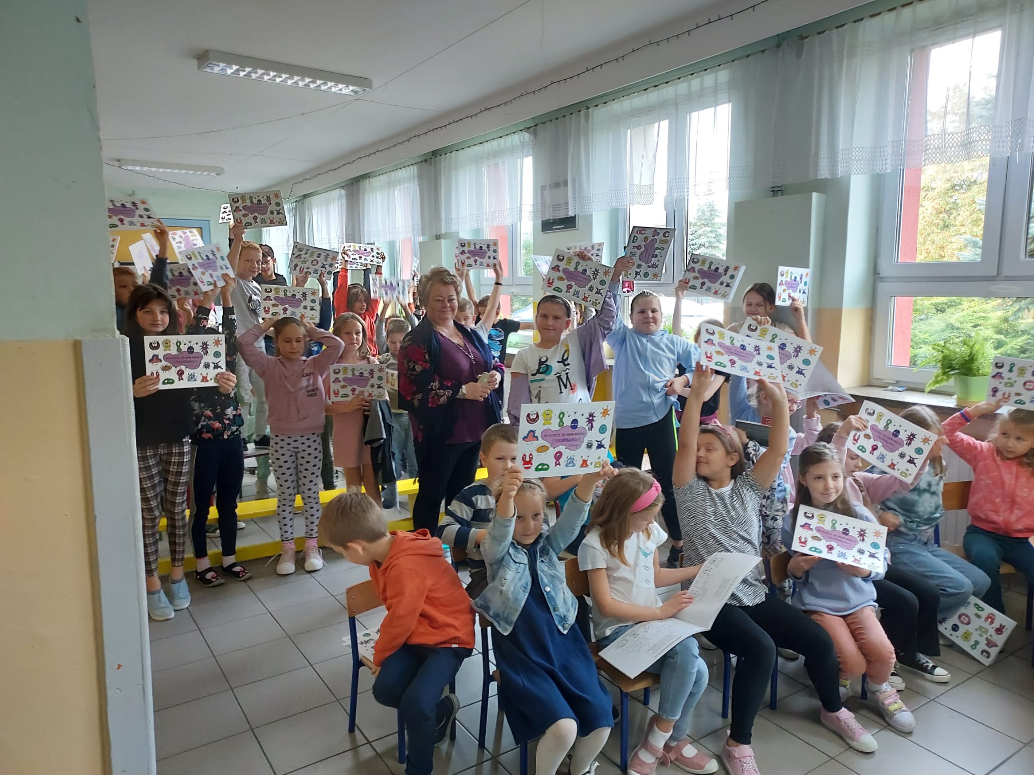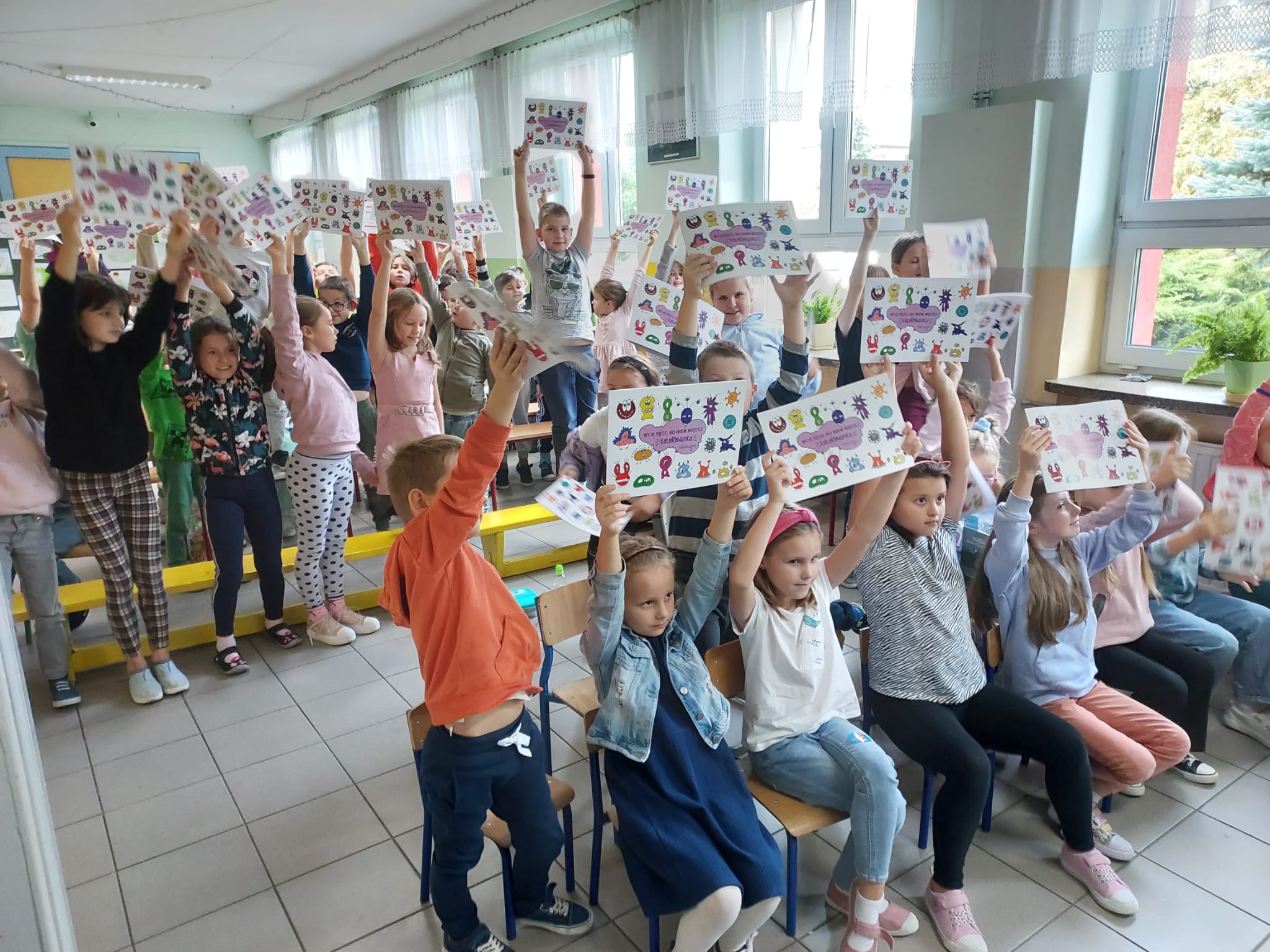 Zapoznano dzieci z tematyką higieny mycia rąk, mówiono o tym, jak poprawnie i dokładnie myć ręce podkreślając jest to jedno z kluczowych działań profilaktycznych. Rozmawiano na temat zagrożeń jakie powodują bakterie obecne na naszych rękach, które w konsekwencji mogą być przyczyną licznych chorób. Przestrzegano uczestników, iż wystarczy odruchowo dotknąć nieumytymi dłońmi okolic oczu, nosa czy ust i jesteśmy narażeni na ogromne ryzyko infekcji. Podkreślono, iż mycie rąk to najprostsza i jedna z najbardziej skutecznych metod zapobiegania chorobom „brudnych rąk” dlatego tak ważne jest to, by myć ręce regularnie i poprawnie z zastosowaniem prawidłowej techniki. Na podstawie kolorowanek edukacyjnych „Myję ręce, bo wiem więcej” pokazano dzieciom instrukcje mycia rąk. Na początek woda, odpowiednia ilość mydła, dokładne mycie przestrzeni między palcami, kciuki, wewnętrzna strona dłoni, dokładne opłukanie i wytarcie rąk do sucha. Tak właśnie myjemy ręce przynajmniej przez 30 sekund, ten czas jest odpowiedni, żeby rączki były czyste. Dzieci aktywnie uczestniczyły w spotkaniu, chętnie odpowiadały na zadawane pytania. Na koniec każde dziecko otrzymało kolorowankę edukacyjną, aby mogło pokazać rodzicom i podczas zajęć lekcyjnych z nauczycielami utrwalić zdobytą wiedzę.