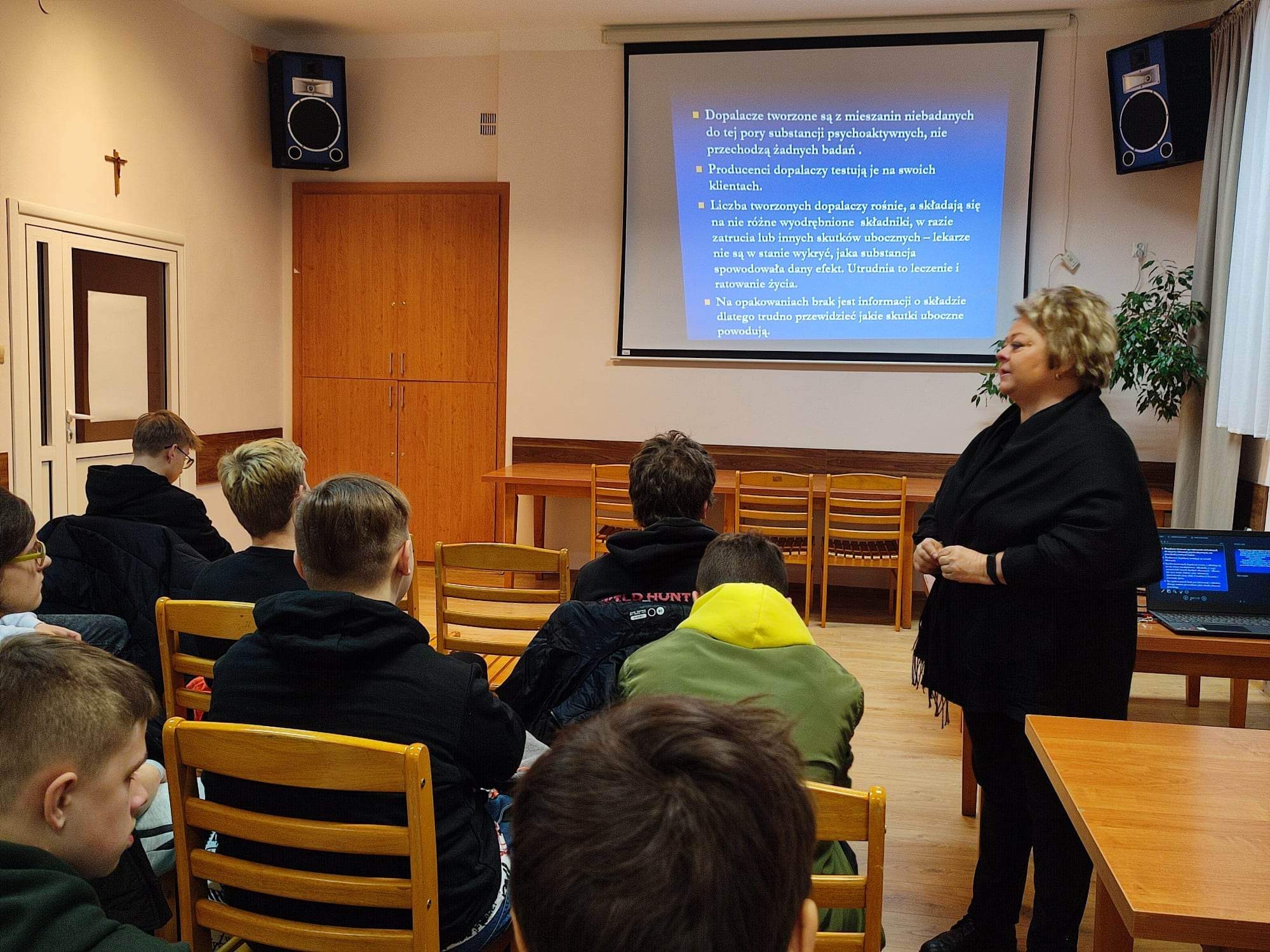 Omówiono mechanizm uzależnienia. skutki zażywania środków odurzających i dopalaczy przez młodych ludzi, wskazano, iż nie ma jednego wzorca reakcji na przyjętą substancję – tolerowana przez organizm jednego człowieka, dla innego może być groźną w skutkach trucizną. Młodzież dowiedziała się o konsekwencjach zdrowotnych, psychologicznych, społecznych i prawnych wynikających z zażywania środków odurzających. Mówiono również o sytuacjach w jakich młodzież najczęściej sięga po niedozwolone środki oraz celach, jakimi kierują się handlarze tych środków. Zaprezentowano spoty edukacyjne integralnie związane