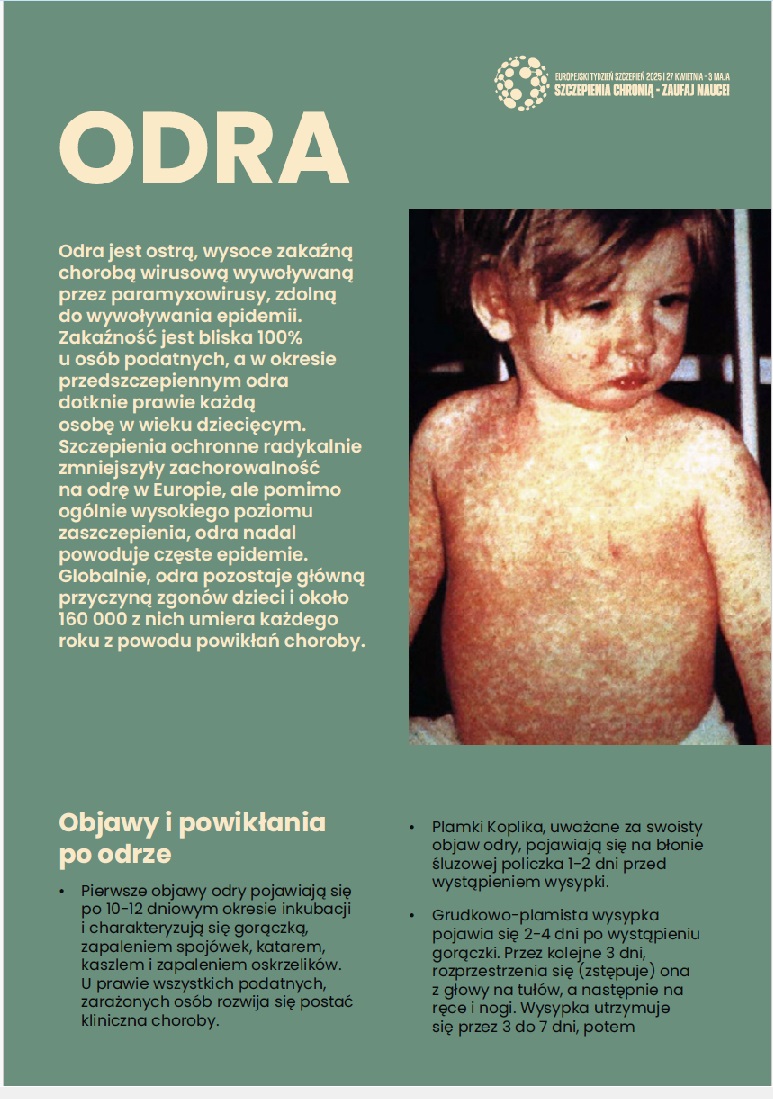 Odra to ostra, wirusowa choroba zakaźna, która bardzo łatwo się rozprzestrzenia wśród nieuodpornionych osób w każdym wieku i może powodować epidemię. Nie należy jej lekceważyć ponieważ powikłania z nią związane mogą być bardzo groźne. Źródłem zakażenia jest chory człowiek. Zakażenie szerzy się drogą kropelkową oraz przez bezpośrednią styczność z wydzieliną z jamy nosowo-gardłowej chorej osoby. Objawy występują po 10-12 dniach od zakażenia. Na 2-4 dni przed pojawieniem się charakterystycznej wysypki występuje gorączka, złe samopoczucie, zapalenie spojówek, katar, kaszel. Wraz z rozwojem choroby temperatura wzrasta do 39-41°C. W jamie ustnej pojawiają się białe wykwity otoczone czerwoną linią (plamki Koplika), a następnie czerwona wysypka stopniowo zlewa się w plamy i obejmuje całą głowę i ciało. Około 30% zachorowań przebiega z powikłaniami szczególnie wśród dzieci do 5 roku życia i dorosłych w wieku powyżej 20 lat. Najczęstsze powikłania to zapalenie ucha środkowego, które prowadzi do utraty słuchu, biegunka, zapalenie płuc, ostre zapalenie mózgu prowadzące do obrzęku mózgu, zaburzenia wzroku prowadzące do ślepoty, rzadkie ciężkie uszkodzenia mózgu znane jako podostre stwardniające zapalenie mózgu (SSPE), którego objawy pojawiają się kilka lat po chorobie. Odra jest najbardziej niebezpieczna dla dzieci do 5 lat oraz osób z zaburzeniami układu odporności. Co czwarta chora osoba wymaga hospitalizacji. Jedna na 1000 chorych umiera w przebiegu choroby.
