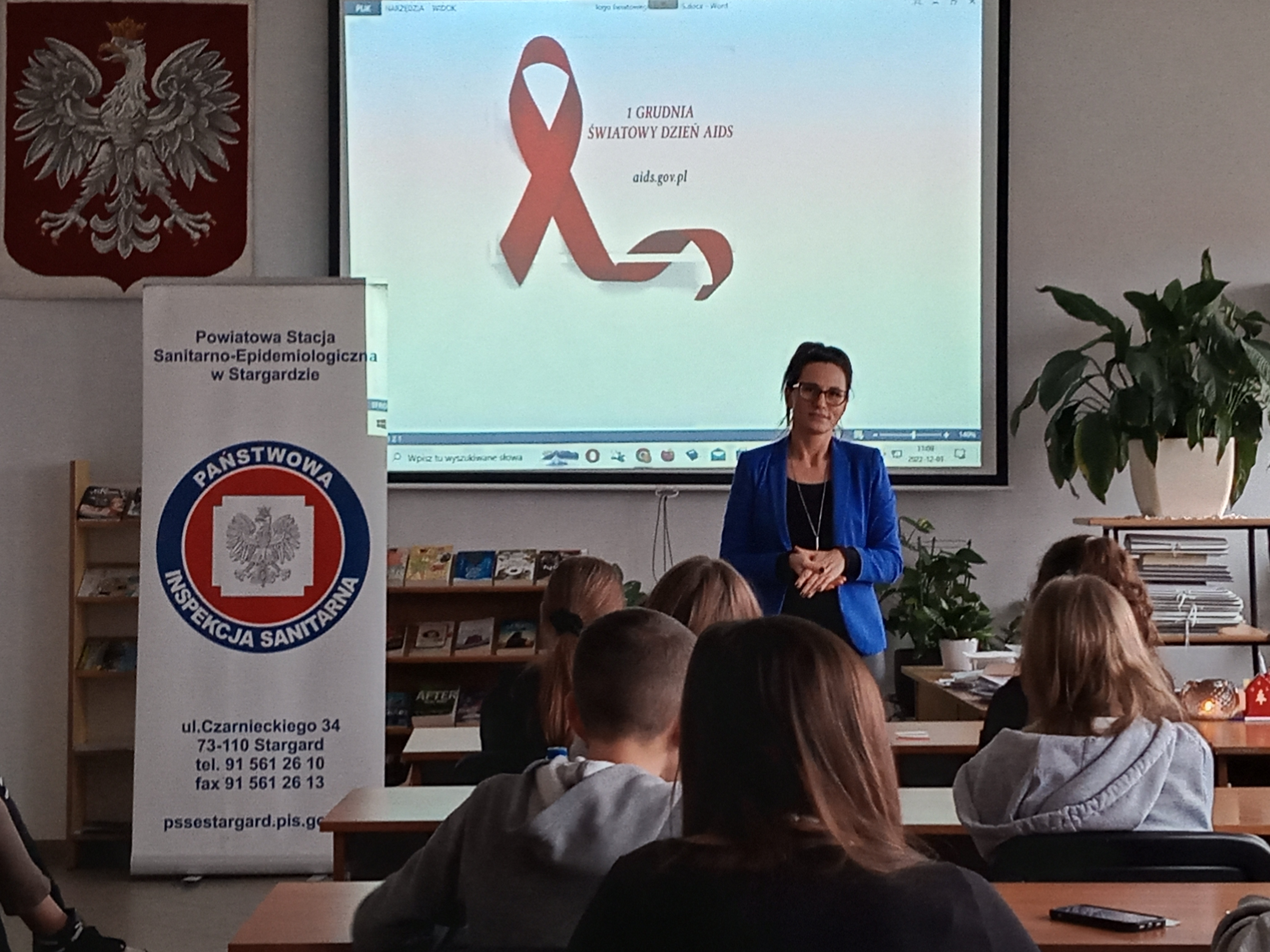 W środę 23 listopada 2022r. z uczniami klasy branżowej w Zespole Szkół nr 1 w Stargardzie oraz 01 grudnia 2022 w Zespole Szkół Budowlano – Technicznych w Stargardzie z uczniami klas o profilu fryzjerskim, starszy asystent ds. oświaty zdrowotnej i promocji zdrowia Powiatowej Stacji Sanitarno - Epidemiologicznej w Stargardzie Ewelina Wardziak, przeprowadziła prelekcje połączoną z warsztatami , w związku obchodami Światowego Dnia AIDS 01 grudnia 2022r. Podczas zajęć młodzież poznała konsekwencje ryzykownych zachowań oraz definicję HIV/AIDS i drogi zakażenia. Młodzież chętnie brała udział w zajęciach, zadawała sensowne , ciekawe pytania, dzięki czemu spotkanie było bardzo efektywne.