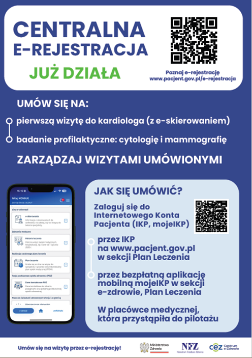 Skorzystaj z centralnej e-rejestracji na Internetowym Koncie Pacjenta lub w aplikacji mojeIKP. Pilotażowa rejestracja potrwa do końca 2025 r..