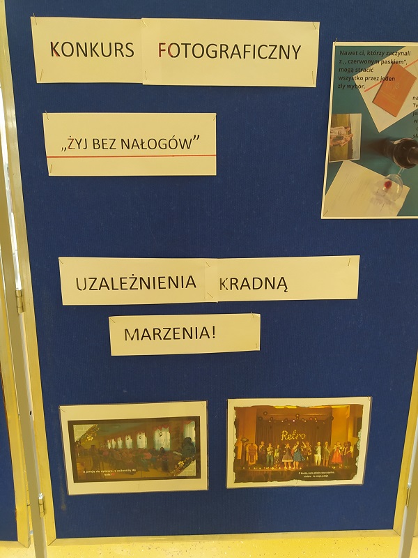 - aktywizowanie uczniów do pracy twórczej promującej zdrowy styl życia wolny od używek i uzależnień związanych z zażywaniem substancji psychoaktywnych zawartych w wyrobach alkoholowych, tytoniowych (w tym e-papierosów), narkotykach i dopalaczach;