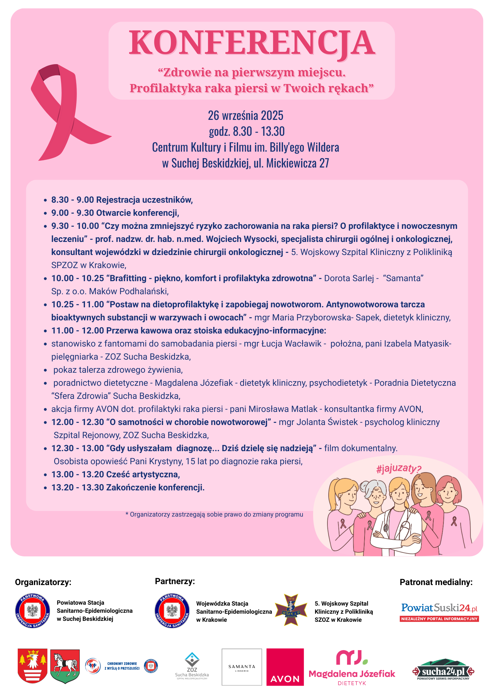 W dniu 26 września 2025 roku (piątek) w godz. 8.30 – 13.30, w sali widowiskowej Centrum Kultury i Filmu im. Bille’go Wildera w Suchej Beskidzkiej, ul. Adama Mickiewicza 27 odbędzie się konferencja „Zdrowie na pierwszym miejscu. Profilaktyka raka piersi w Twoich rękach”.