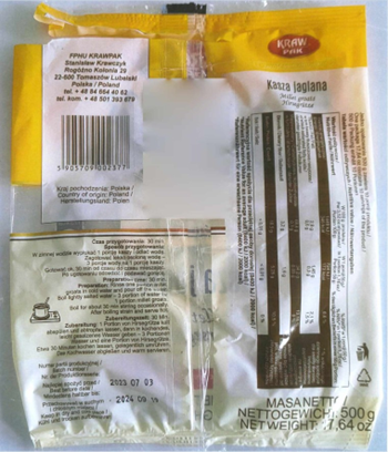 W wyniku działań urzędowych Państwowej Inspekcji Sanitarnej wykryto przekroczenie najwyższego dopuszczalnego poziomu (NDP) pestycydu - chlorpiryfosu w niżej wymienionej partii kaszy jaglanej.