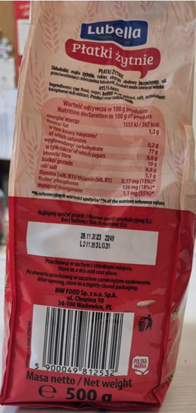 Ostrzeżenie publiczne dotyczące żywności: Wysoki poziom akryloamidu w określonych partiach płatków żytnich