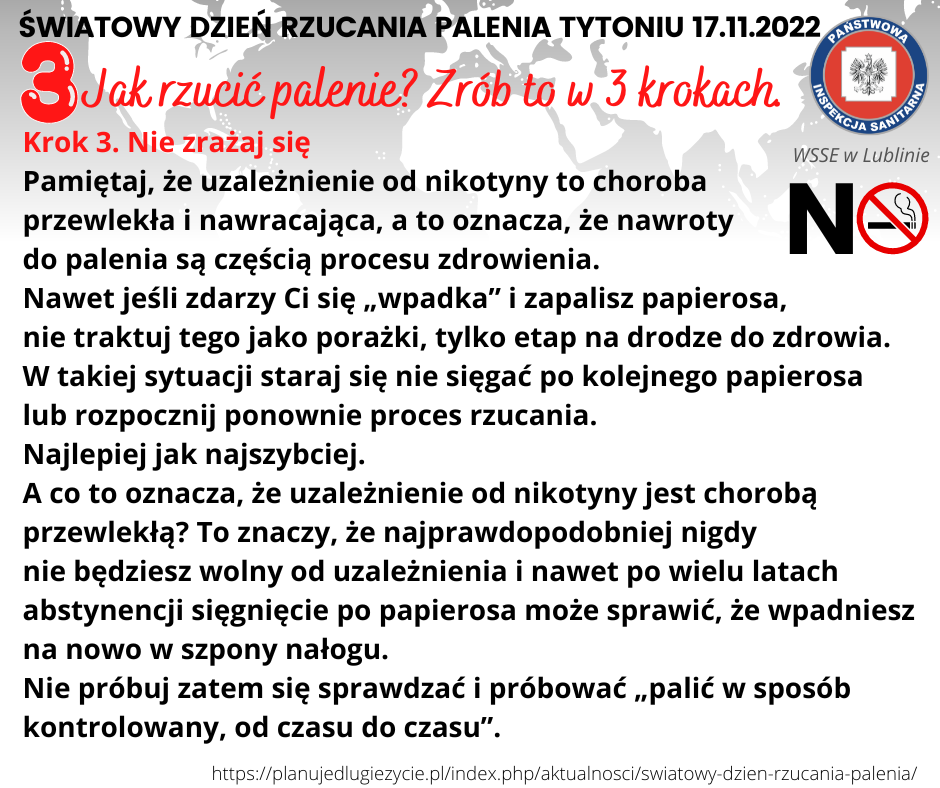 Uzależnienie od nikotyny jest chorobą, dlatego rzucanie palenia nie zawsze przebiega łatwo. Skorzystaj z profesjonalnej pomocy, by zwalczyć uzależnienie. Oferuje ją Ogólnopolska Telefoniczna Poradnia Pomocy Palącym działająca przy Narodowym Instytucie Onkologii w Warszawie pod telefonami 801 108 108 oraz 22 211 80 15. Konsultanci są dostępni od poniedziałku do piątku w godzinach 09:00 – 21:00 oraz w soboty w godzinach 9:00–15.00.