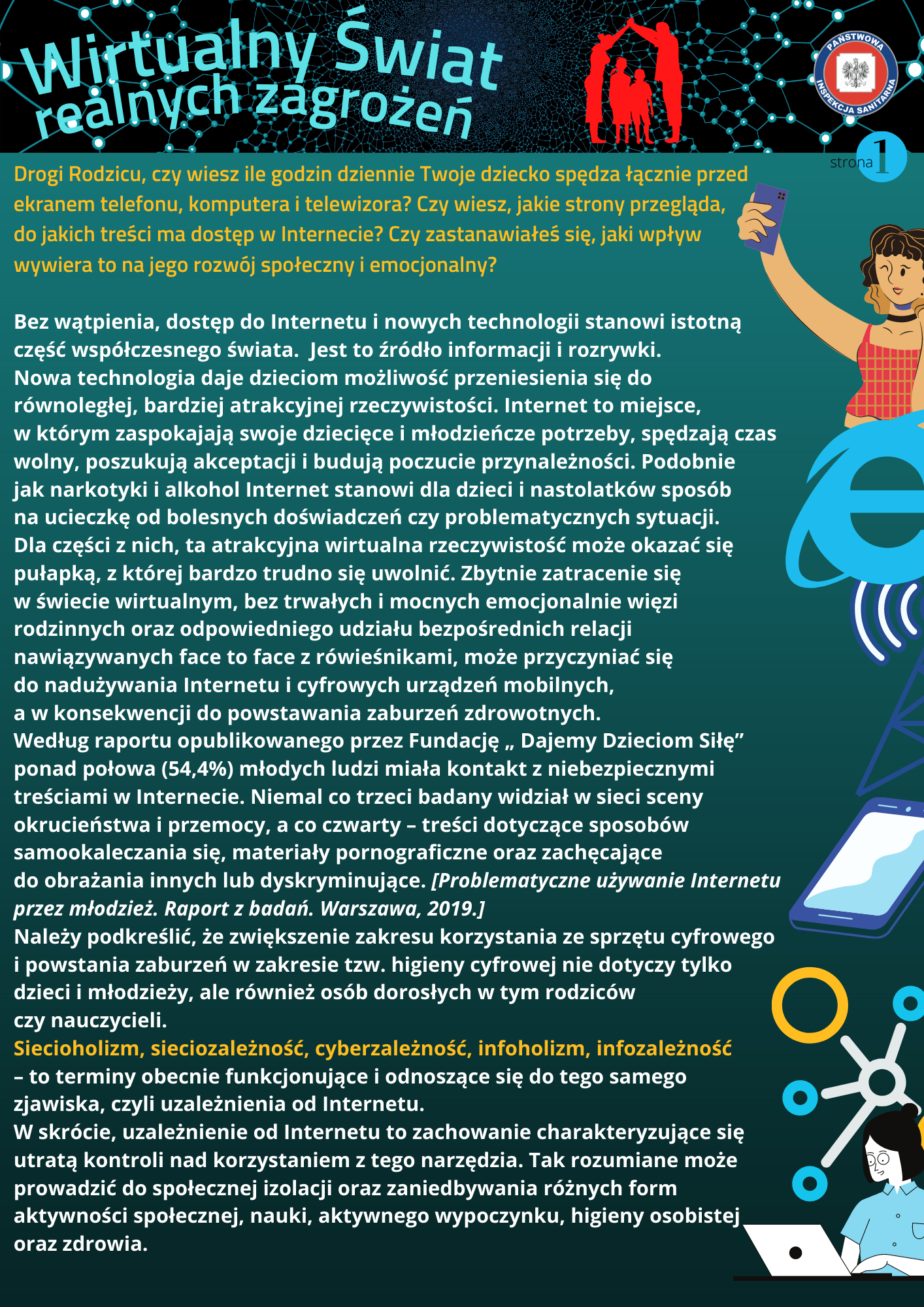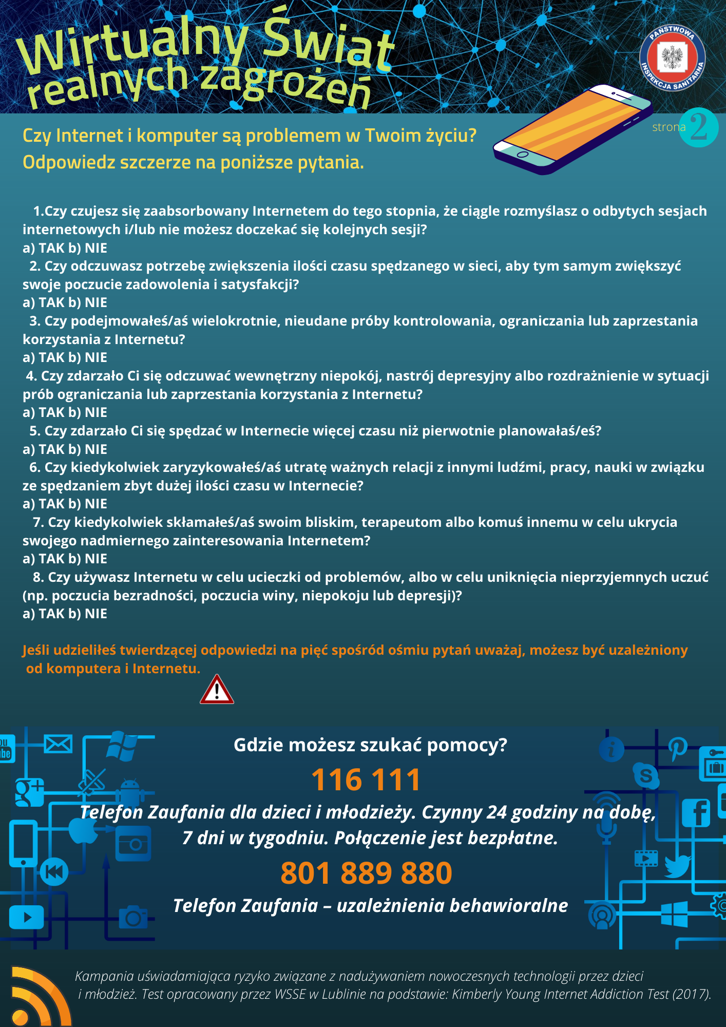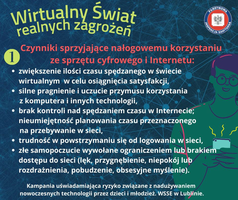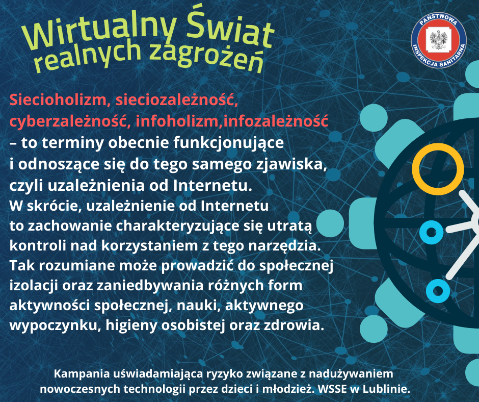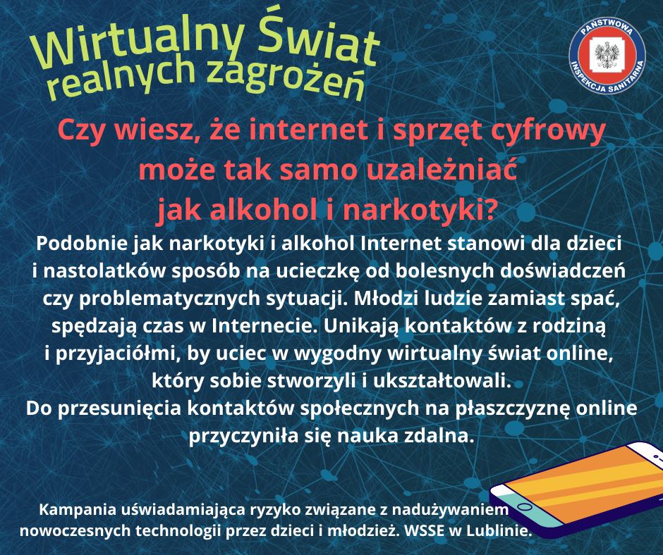 Materiały zaprezentowane na tej stronie mają na na celu uświadomienie ryzyka związanego z nadużywaniem nowoczesnych technologii, a zostały one opracowane przez Wojewódzką Stację Sanitarno-Epidemiologiczną w Lublinie.