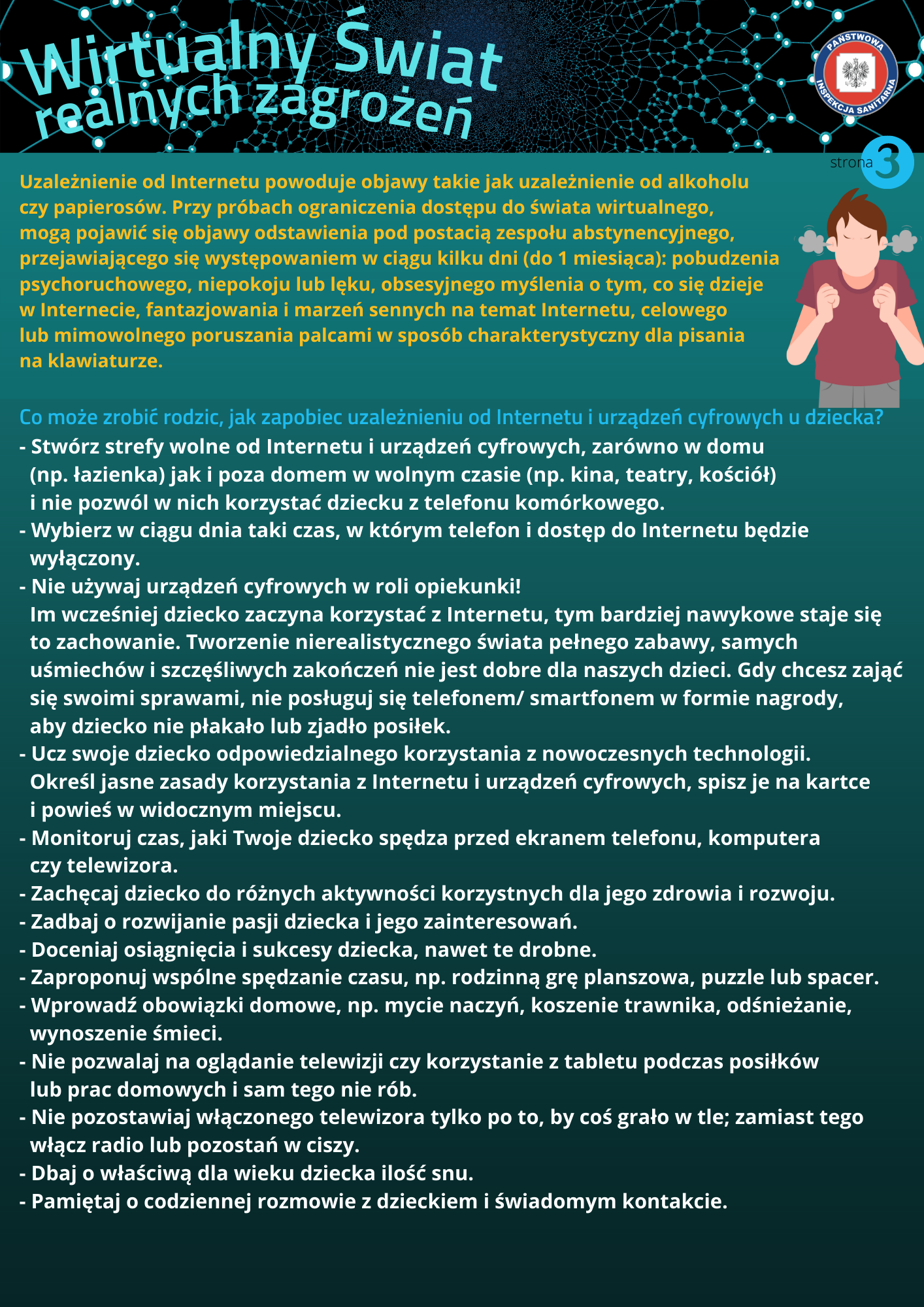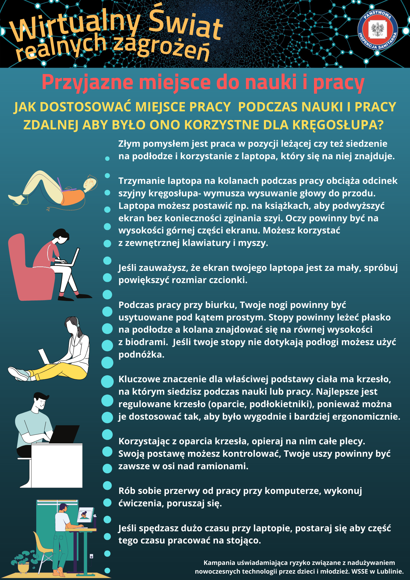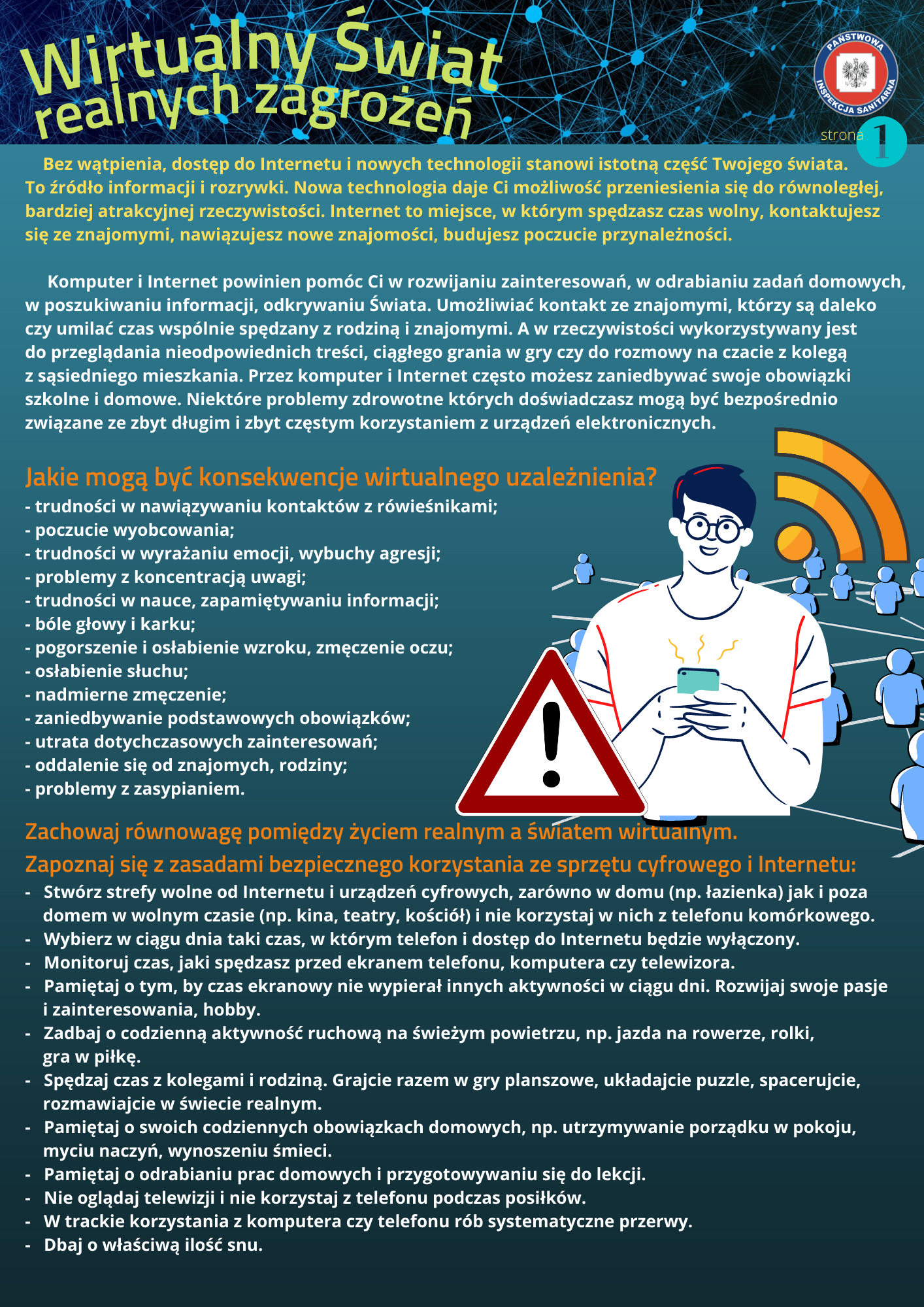 Materiały zaprezentowane na tej stronie mają na na celu uświadomienie ryzyka związanego z nadużywaniem nowoczesnych technologii, a zostały one opracowane przez Wojewódzką Stację Sanitarno-Epidemiologiczną w Lublinie.