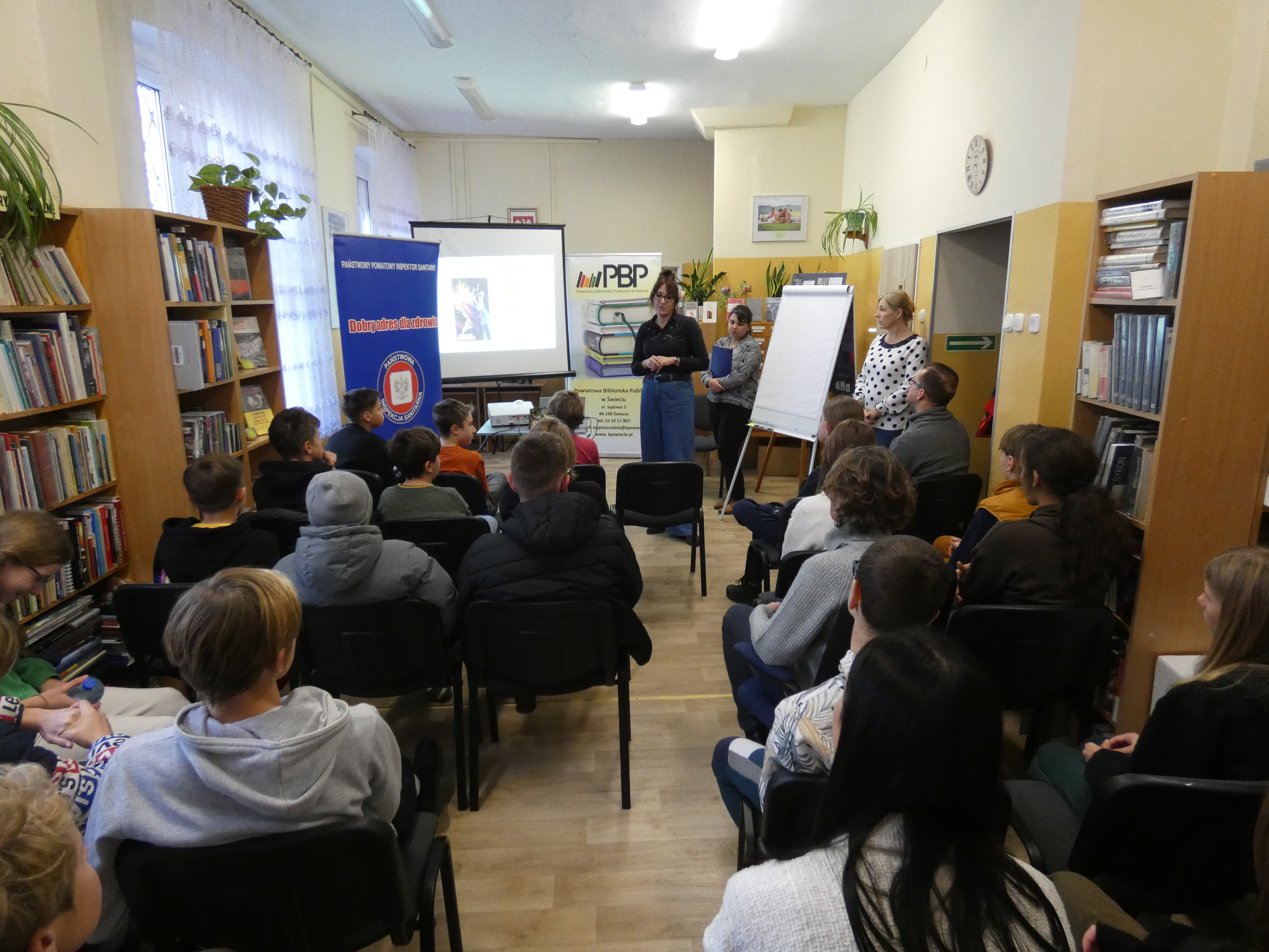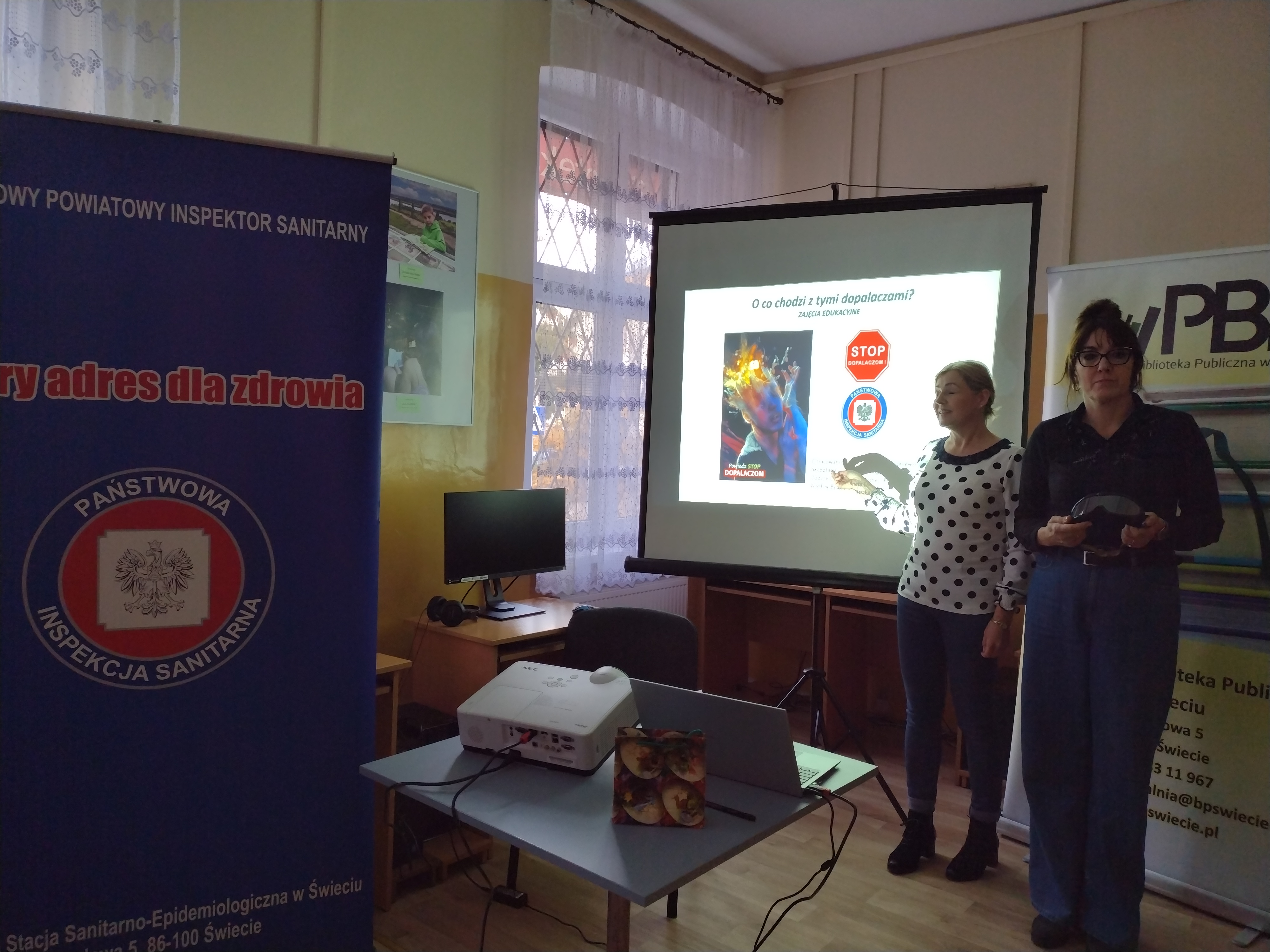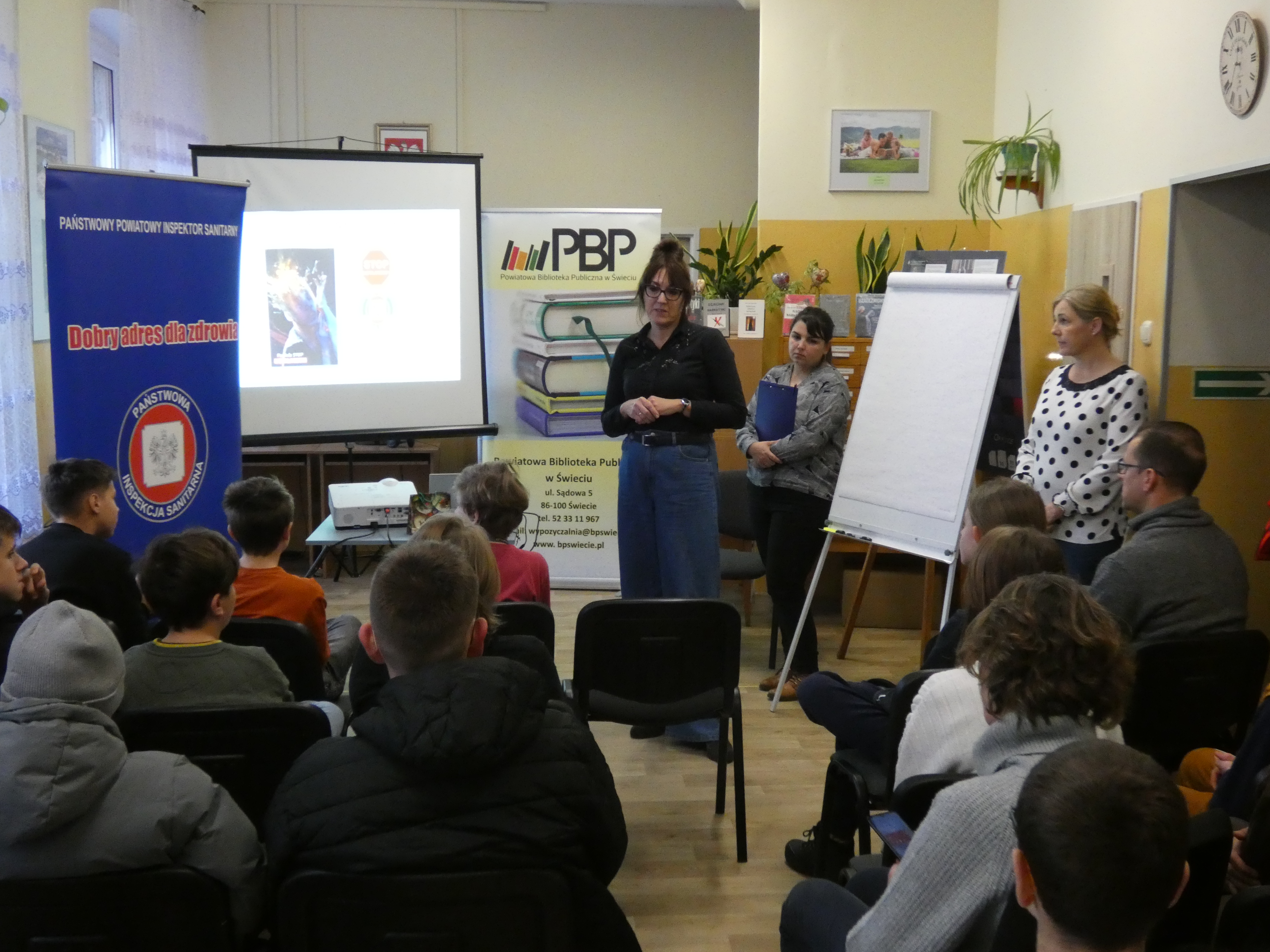 Powiatowa Stacja Sanitarno -Epidemiologiczna w Świeciu wspólnie z Powiatową Biblioteką Publiczną w Świeciu zorganizowały w dniu 12.12.2022r. spotkanie z młodzieżą poświęcone profilaktyce uzależnień i życia wolnego od substancji psychoaktywnych ze szczególnym uwzględnieniem dopalaczy.
