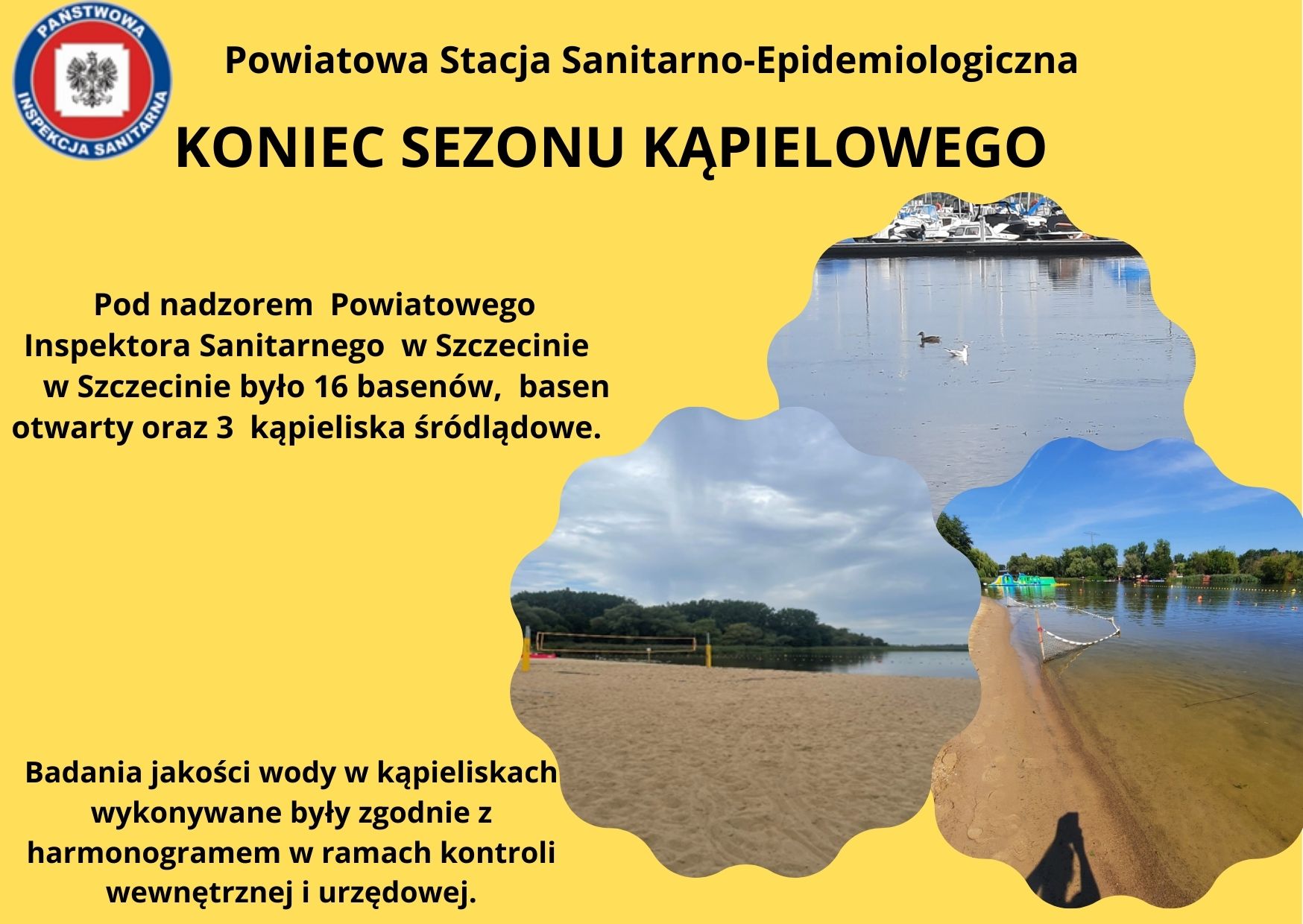 Państwowy Powiatowy Inspektor Sanitarny w Szczecinie informuje, iż trakcie trwania sezonu kąpielowego 2023 r. na terenie miasta Szczecin pod nadzorem organów Inspekcji Sanitarnej było 16 basenów, 3 kąpieliska oraz 1 basen otwarty: