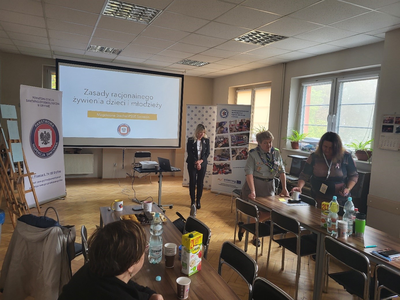 W dniu 23.10.2022r pracownicy sekcji Oświaty Zdrowotnej i Promocji Zdrowia z Powiatowej Stacji Sanitarno-Epidemiologicznej w Szczecinie Magdalena Stachel i Izabela Wojtal przeprowadziły w wykłady z zakresu „Zasad racjonalnego odżywiania dla dzieci i młodzieży” oraz wykład na temat realizacji programów profilaktyki nadwagi i otyłości „Trzymaj Formę!” a także zakresu wyboru produktów eko pt. „Skąd się biorą produkty ekologiczne”. Wykłady odbyły się w Komendzie Chorągwi Zachodniopomorskiej ZHP w Szczecinie. Łączna liczba uczestników 40 osób.