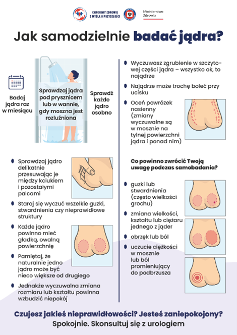 samobadanie jąder raz w miesiącu (najlepiej po kąpieli lub prysznicu),