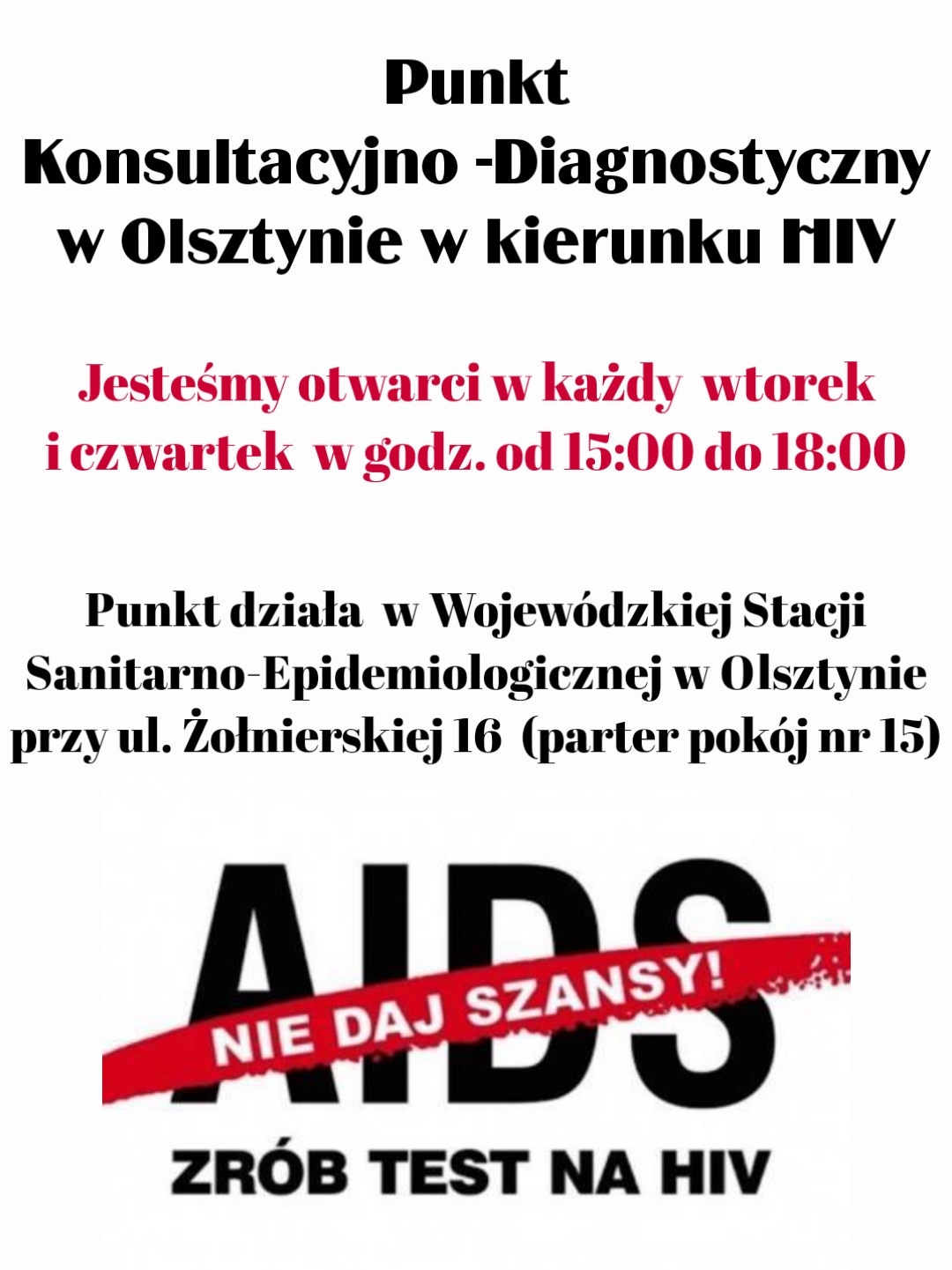 Zaproszenie walentynkowe do Punktów Konsultacyjno-Diagnostycznych w kierunku HIV 14.02.2022 PUNKTY KONSULTACYJNO-DIAGNOSTYCZNE gdzie bezpłatnie, anonimowo i bez skierowania można wykonać testy na HIV https://aids.gov.pl/pkd/ Zdjęcia (1) Pokaż zdjęcie 1 z galerii.