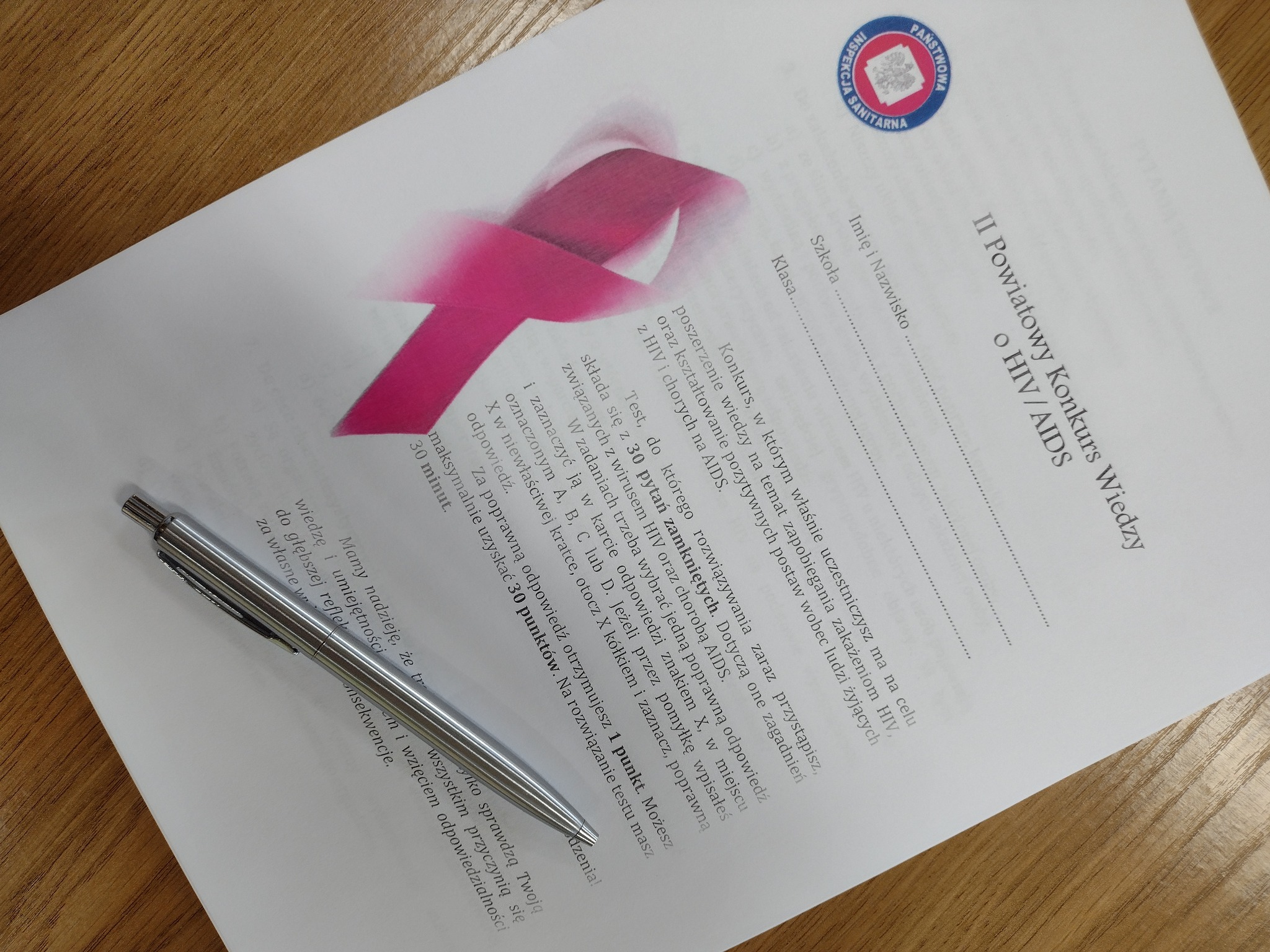 Państwowy Powiatowy Inspektor Sanitarny w Szydłowcu w ramach obchodów Światowego Dnia AIDS zorganizował konkurs wiedzy skierowany do uczniów szkół ponadpodstawowych. W konkursie wzięło udział 41 uczniów. Więcej informacji o konkursie w mediach społecznościowych PSSE w Szydłowcu pod adresem https://www.facebook.com/psse.szydlowiec/posts/pfbid0moUEaukM18qZMfNzRsS4G7wVPG2nz6kb2kdWXec1aWwg1tL91tyJkF1Ywcoi14rgl