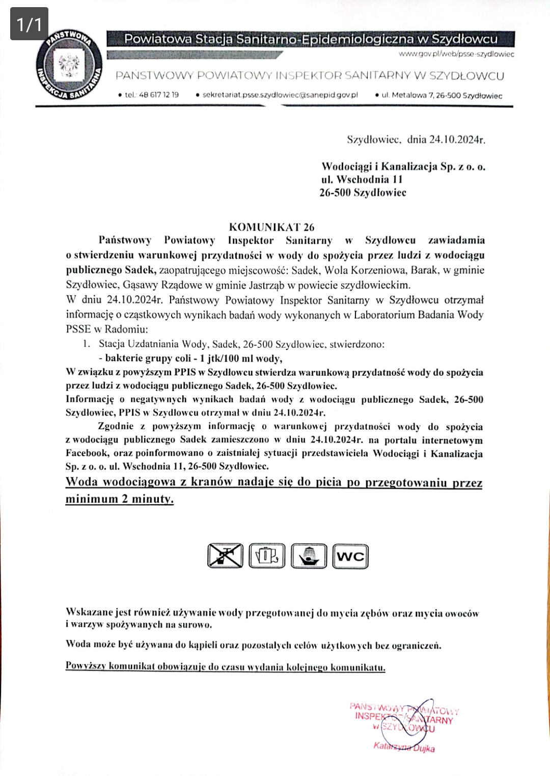 Zgodnie z powyższym informację o warunkowej przydatności wody do spożycia z wodociągu publicznego Sadek zamieszczono w dniu 24.10.2024r. na portalu internetowym Facebook, oraz poinformowano o zaistniałej sytuacji przedstawiciela Wodociągi i Kanalizacja Sp. z o. o. ul. Wschodnia 11, 26-500 Szydłowiec.