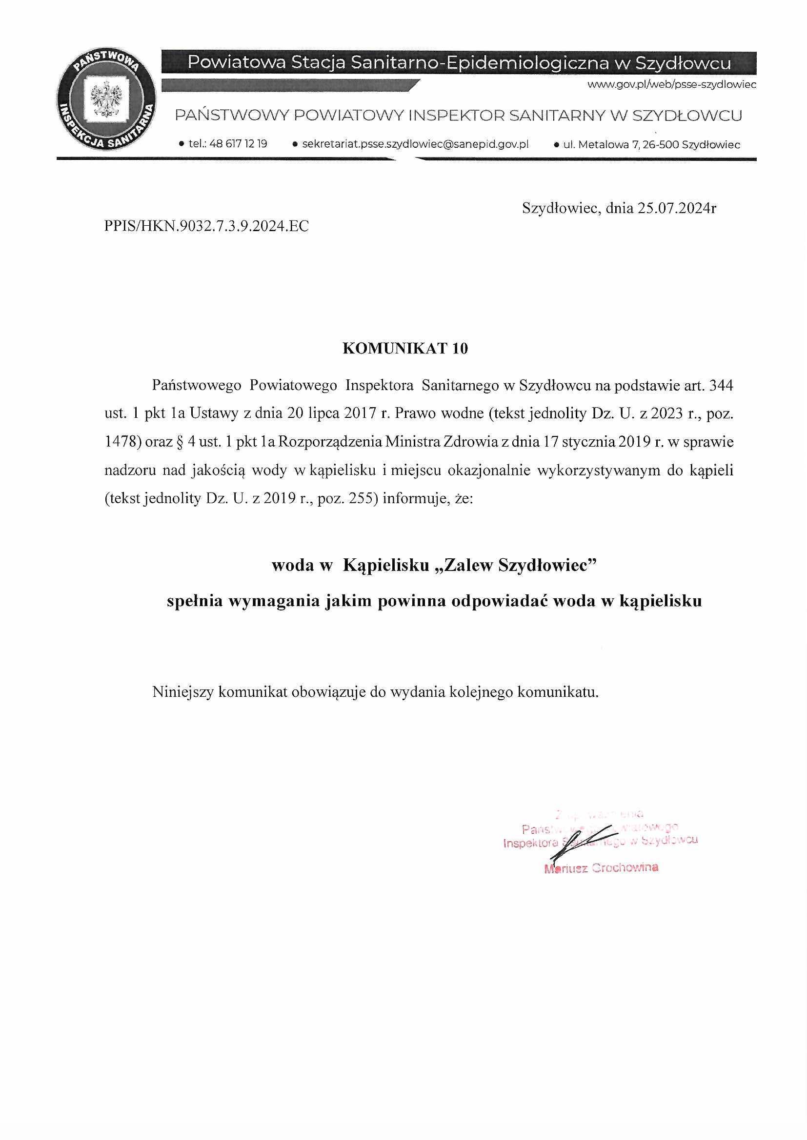Państwowego Powiatowego Inspektora Sanitarnego w Szydłowcu na podstawie art. 344 ust. 1 pkt 1a Ustawy z dnia 20 lipca 2017 r. Prawo wodne (tekst jednolity Dz. U. z 2023 r., poz. 1478) oraz § 4 ust. 1 pkt 1a Rozporządzenia Ministra Zdrowia z dnia 17 stycznia 2019 r. w sprawie nadzoru nad jakością wody w kąpielisku i miejscu okazjonalnie wykorzystywanym do kąpieli (tekst jednolity Dz. U. z 2019 r., poz. 255) informuje, że: