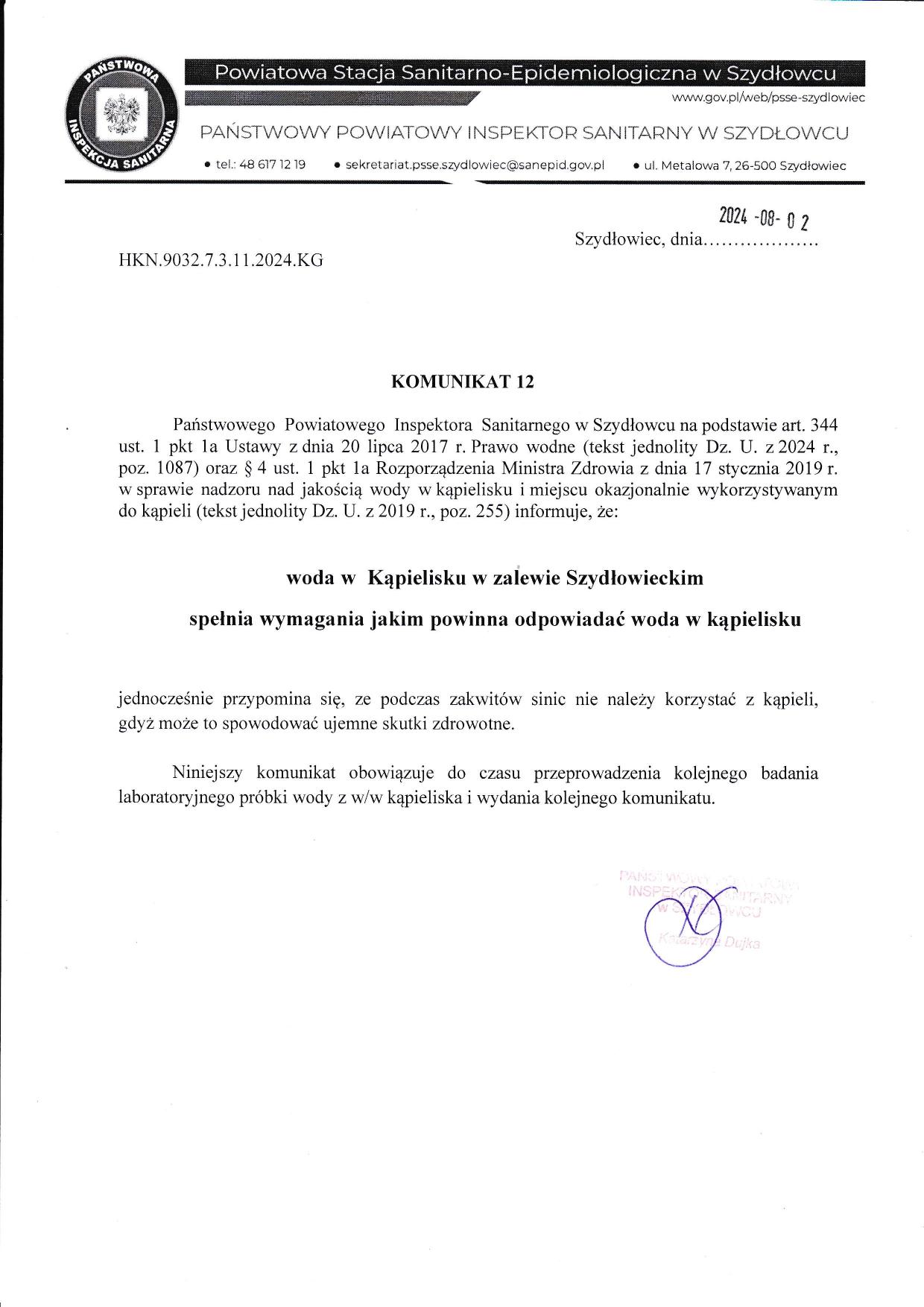 Niniejszy komunikat obowiązuje do czasu przeprowadzenia kolejnego badania laboratoryjnego próbki wody z w/w kąpieliska i wydania kolejnego komunikatu.