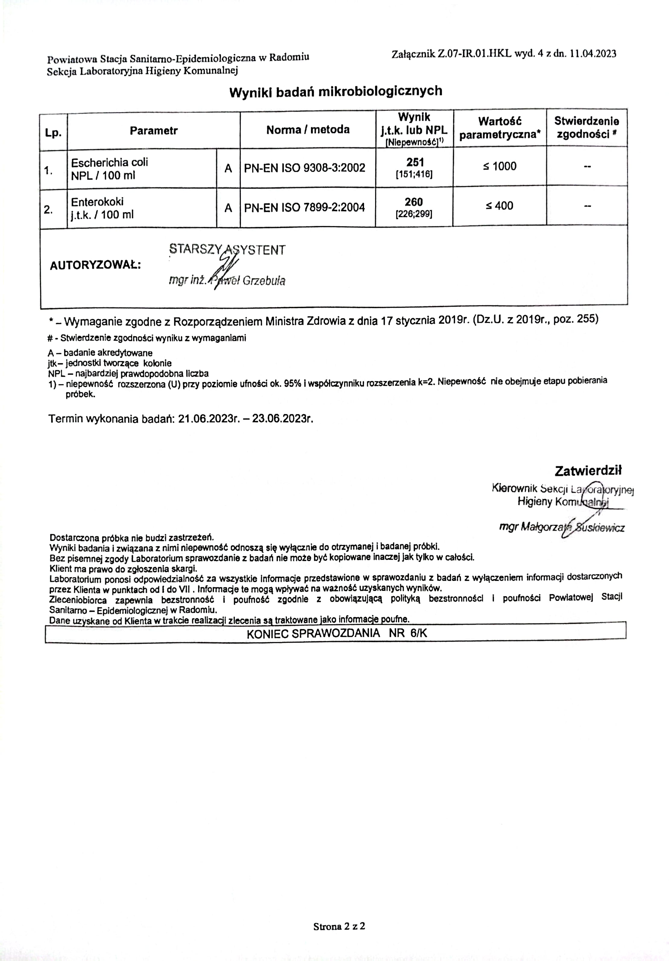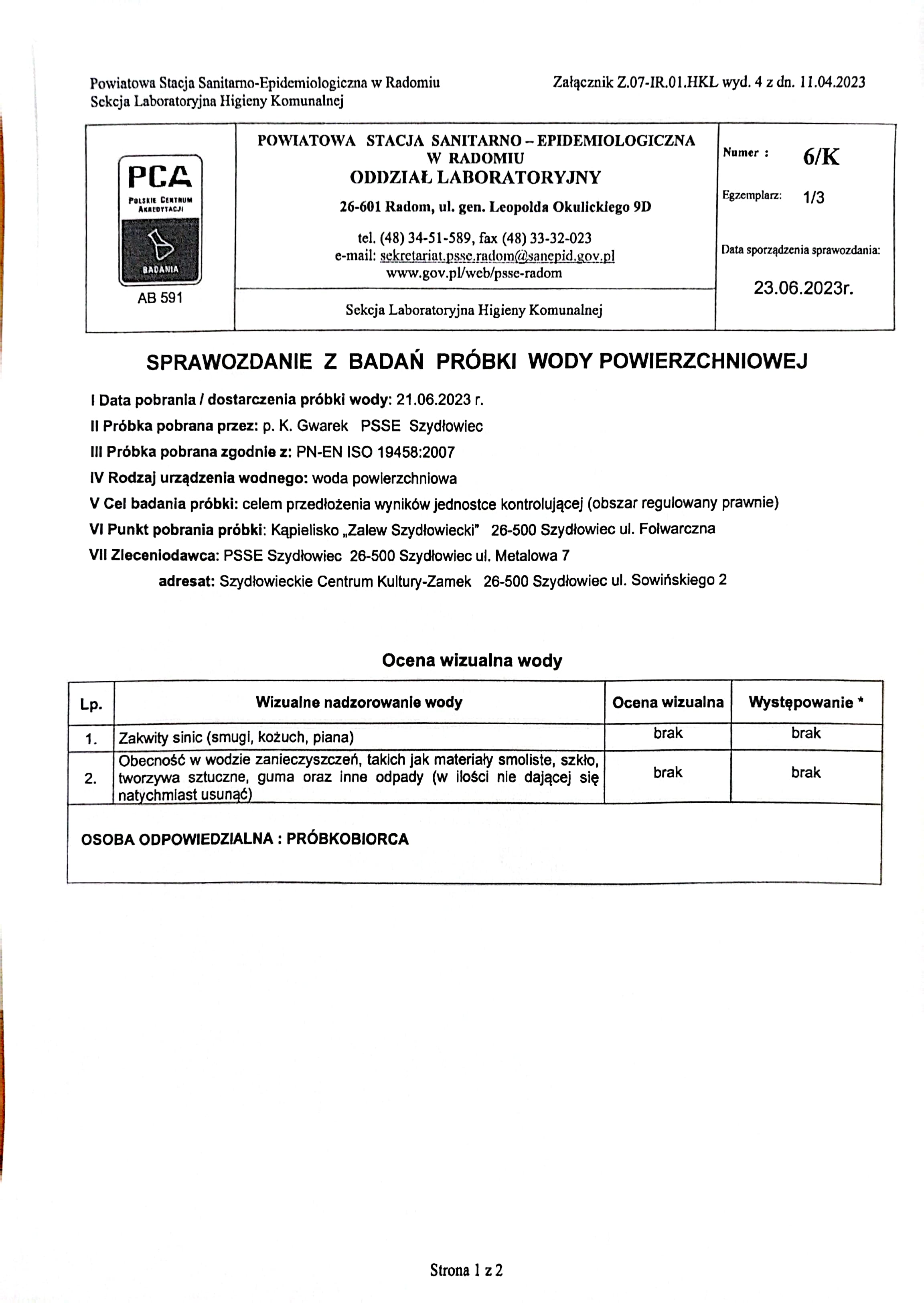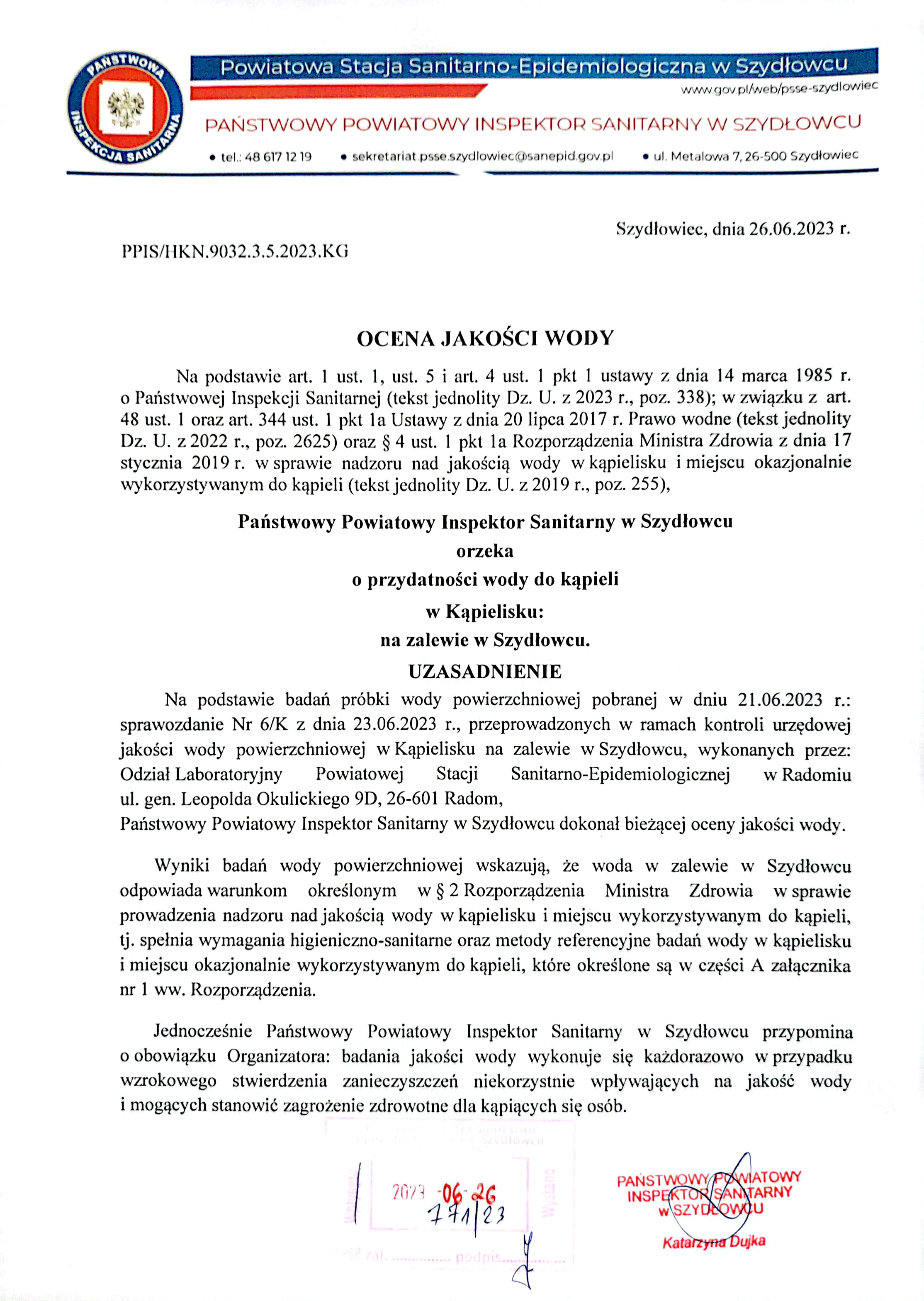 Komunikat Nr 16 PPIS w Szydłowcu wraz z opinią w sprawie jakości wody w kąpielisku na zalewie szydłowieckim