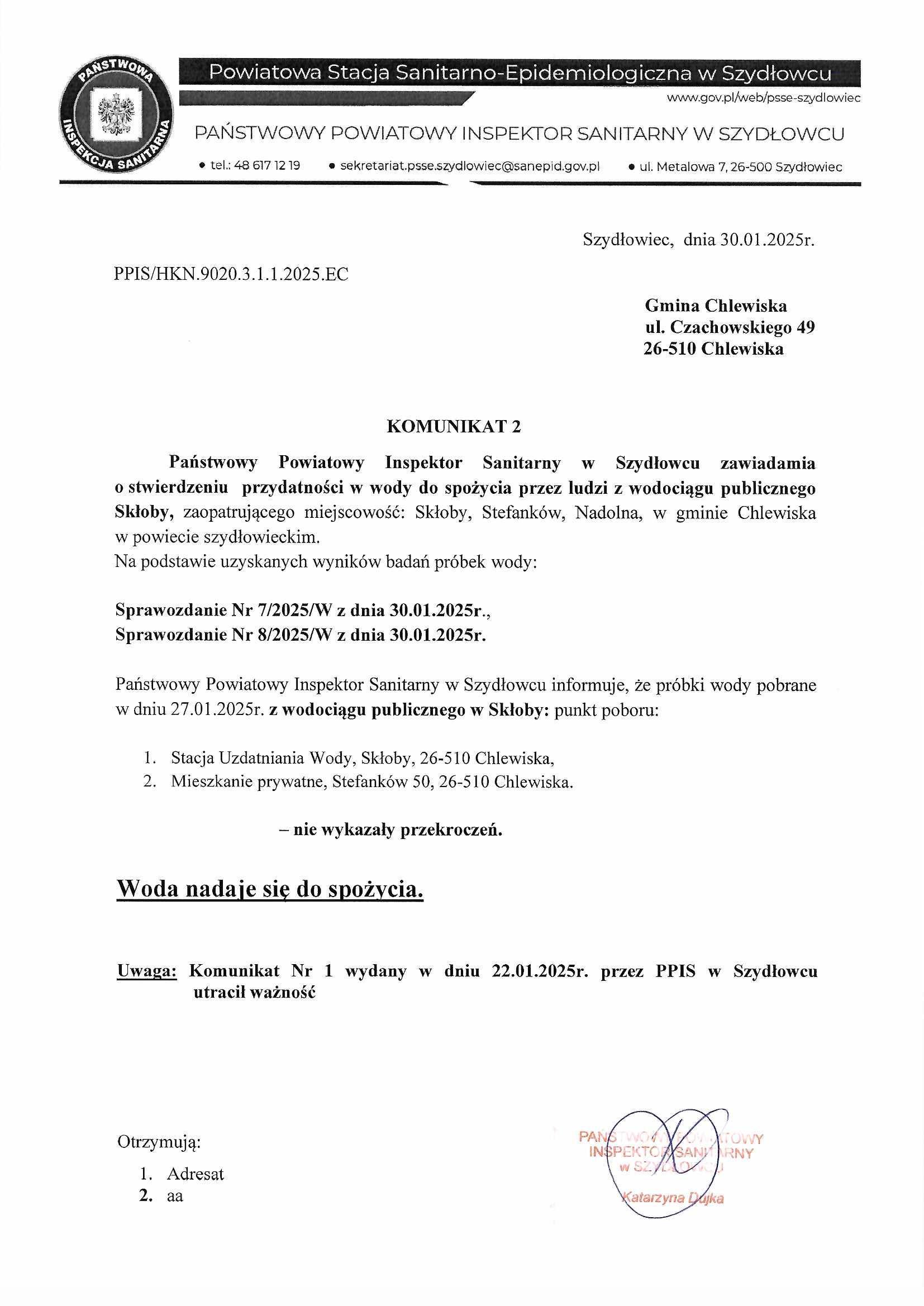 Uwaga: Komunikat Nr 1 wydany w dniu 22.01.2025r. przez PPIS w Szydłowcu utracił ważność