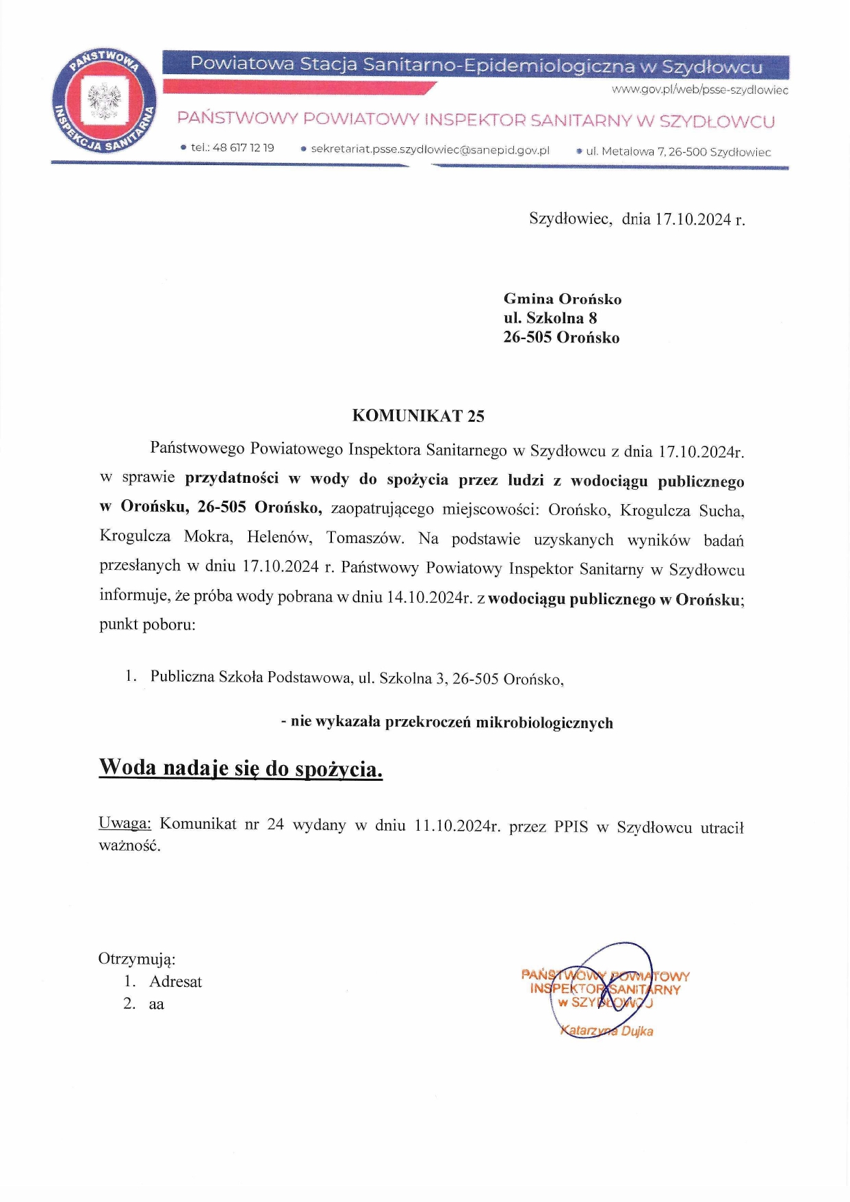 Państwowego Powiatowego Inspektora Sanitarnego w Szydłowcu z dnia 17.10.2024r. w sprawie przydatności w wody do spożycia przez ludzi z wodociągu publicznego w Orońsku, 26-505 Orońsko, zaopatrującego miejscowości: Orońsko, Krogulcza Sucha, Krogulcza Mokra, Helenów, Tomaszów. Na podstawie uzyskanych wyników badań przesłanych w dniu 17.10.2024 r. Państwowy Powiatowy Inspektor Sanitarny w Szydłowcu informuje, że próba wody pobrana w dniu 14.10.2024r. z wodociągu publicznego w Orońsku; punkt poboru: