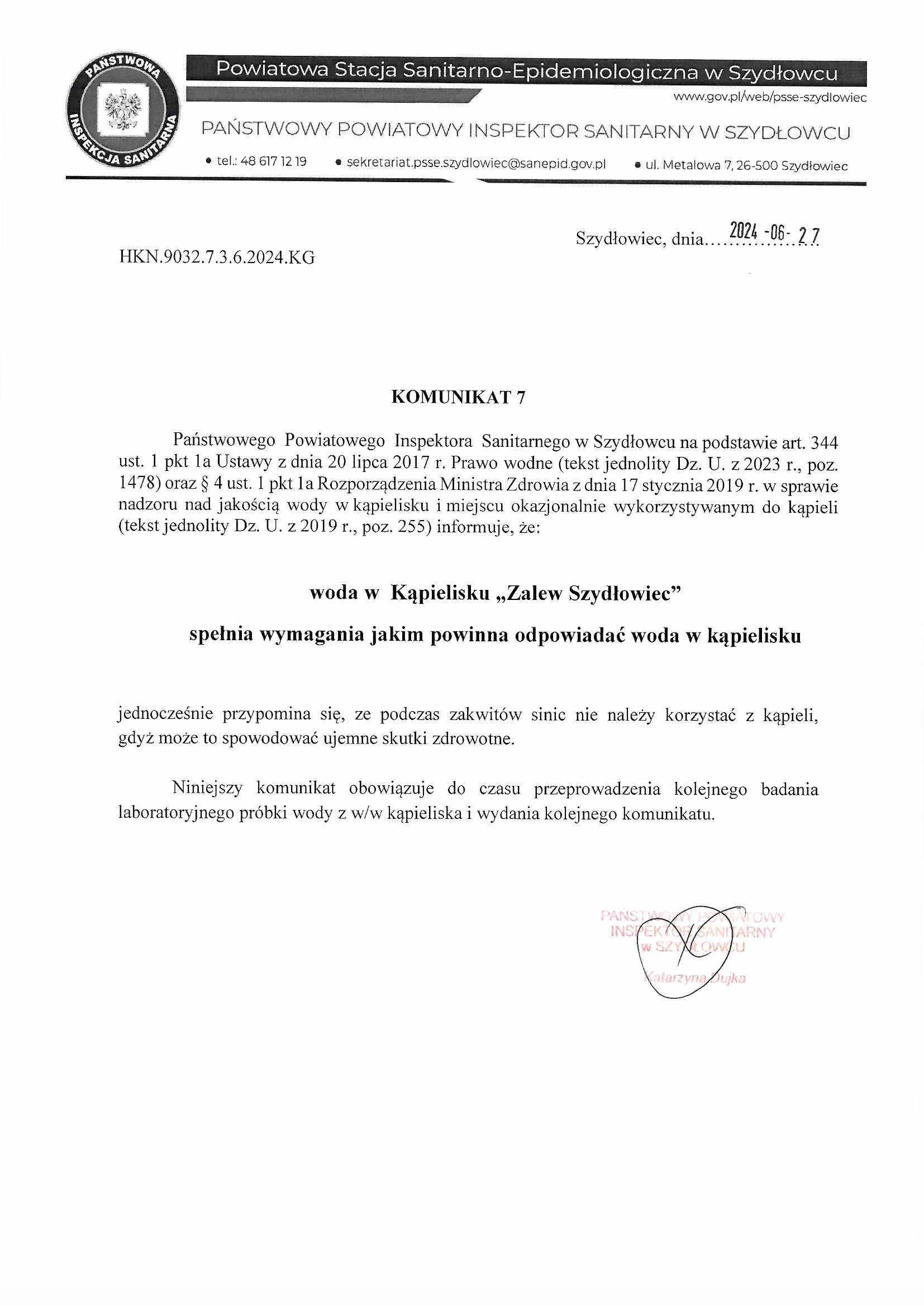 Państwowego Powiatowego Inspektora Sanitarnego w Szydłowcu na podstawie art. 344 ust. 1 pkt 1a Ustawy z dnia 20 lipca 2017 r. Prawo wodne (tekst jednolity Dz. U. z 2023 r., poz. 1478) oraz § 4 ust. 1 pkt 1a Rozporządzenia Ministra Zdrowia z dnia 17 stycznia 2019 r. w sprawie nadzoru nad jakością wody w kąpielisku i miejscu okazjonalnie wykorzystywanym do kąpieli (tekst jednolity Dz. U. z 2019 r., poz. 255) informuje, że:
