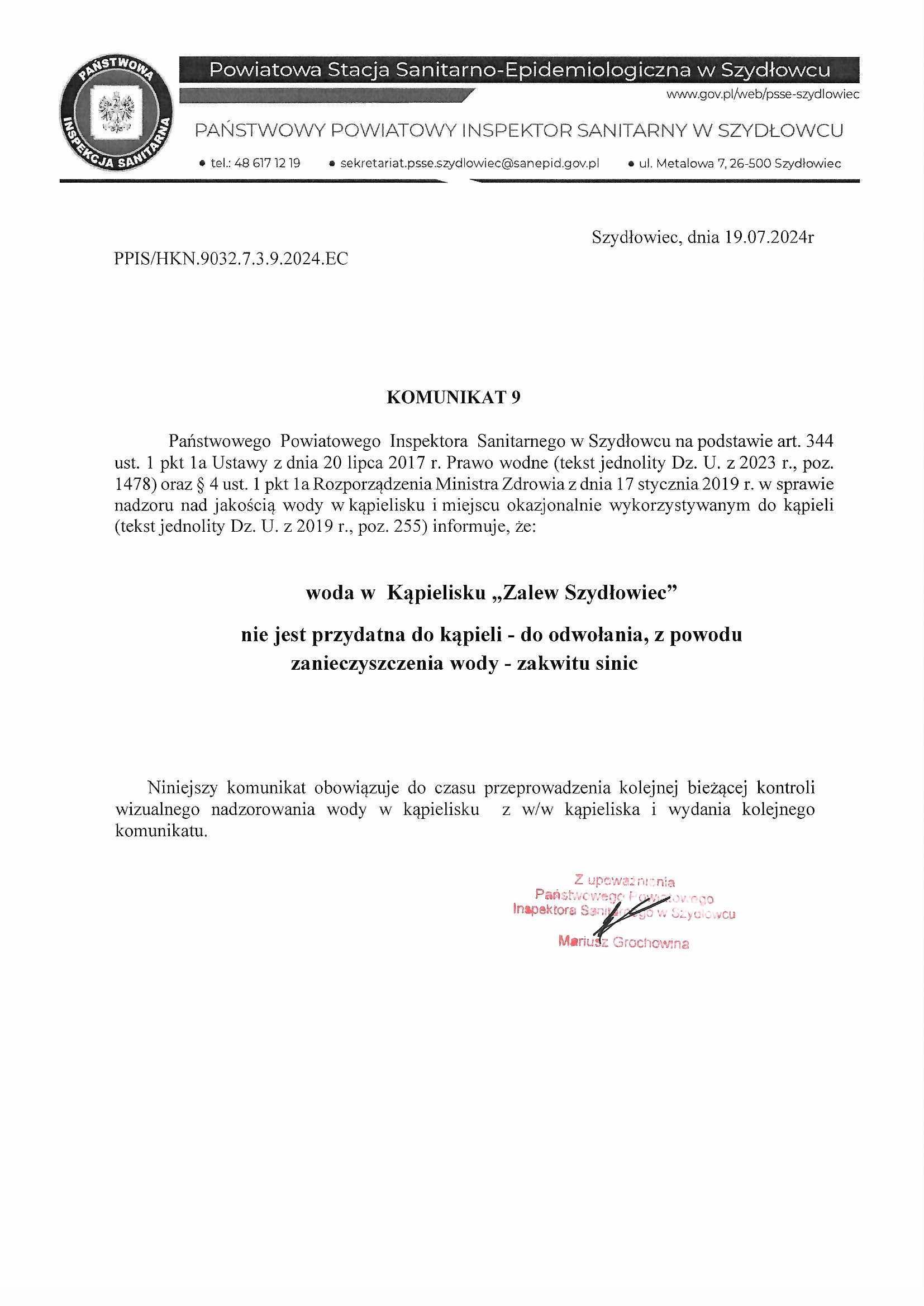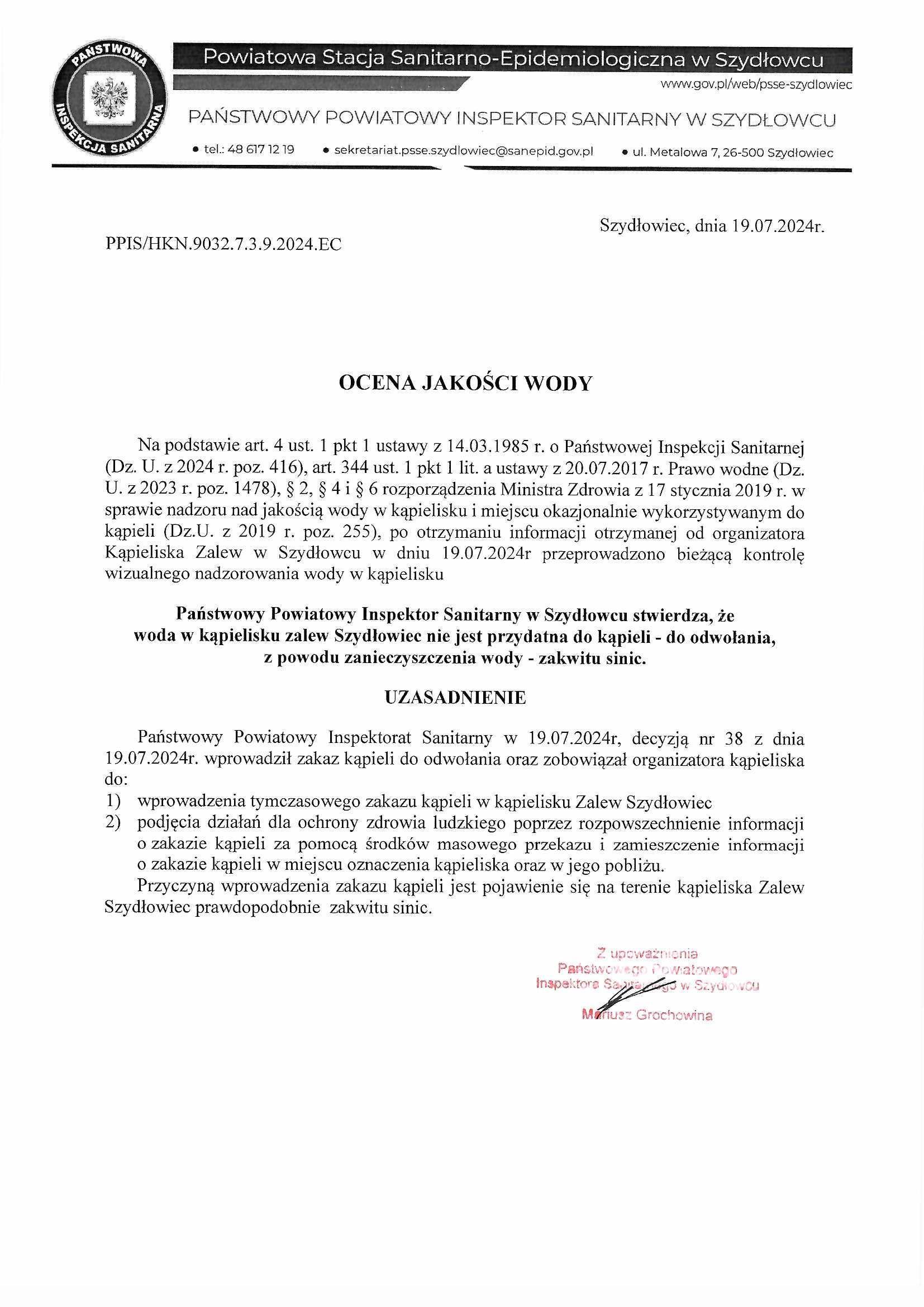 Państwowy Powiatowy Inspektora Sanitarnego w Szydłowcu na podstawie art. 344 ust. 1 pkt 1a Ustawy z dnia 20 lipca 2017 r. Prawo wodne (tekst jednolity Dz. U. z 2023 r., poz. 1478) oraz § 4 ust. 1 pkt 1a Rozporządzenia Ministra Zdrowia z dnia 17 stycznia 2019 r. w sprawie systemu nadzoru nad wodą w kąpielisku i miejscu okazjonalnie dostępnym do kąpieli (tekst jednolity Dz. U. z 2019 r., poz. 255) dostępny, że: