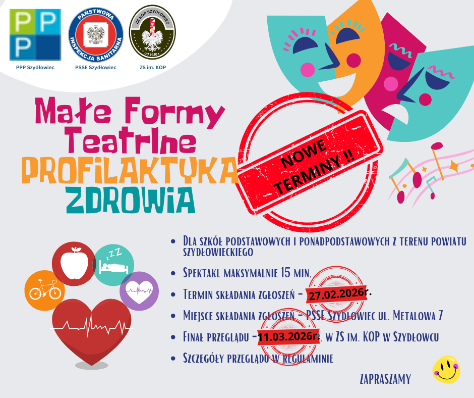 Powiatowa Stacja Sanitarno Epidemiologiczna w Szydłowcu, Poradnia Psychologiczno–Pedagogiczna w Szydłowcu oraz Zespół Szkół im. Korpusu Ochrony Pogranicza w Szydłowcu serdecznie zapraszają uczniów z powiatu szydłowieckiego do wzięcia udziału w konkursie „Małe Formy Teatralne – Profilaktyka Zdrowia”