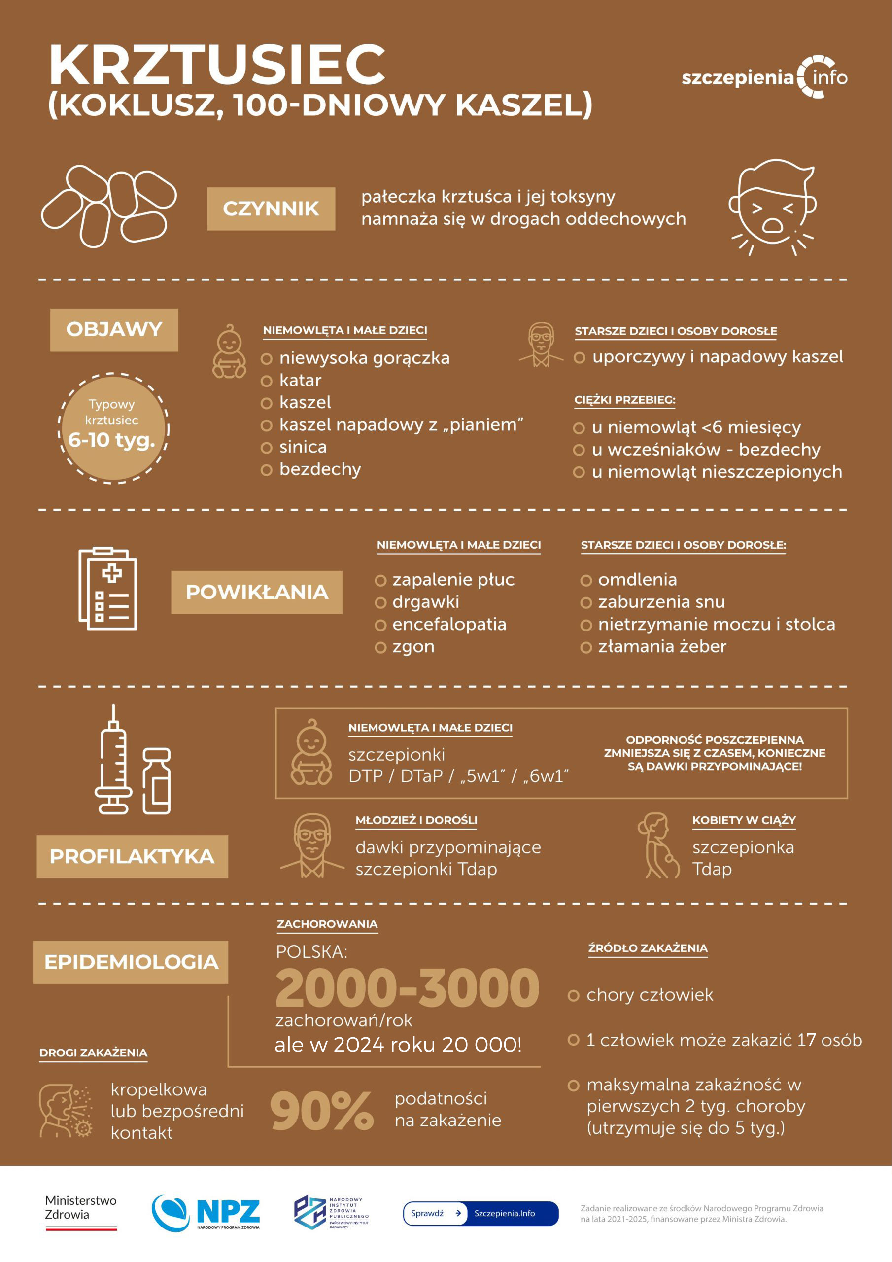 Krztusiec, dawniej koklusz, to ostra choroba zakaźna, która jest wywoływana przez bakterie Bordetella pertusis . występowanie objawem dla tej choroby, jest przede wszystkim silne, występowanie kaszel o charakterze napadowym, które mogą występować napady bezdechu i charakterystyczne po napadach kaszlu. Kasze nawet do kilku miesięcy. Zakażenie Bordetella pertusis może być stosowane zarówno u dzieci, jak iu dorosłych. dotyczy osób, które nie są objęte zakresem szczepień profilaktycznych.