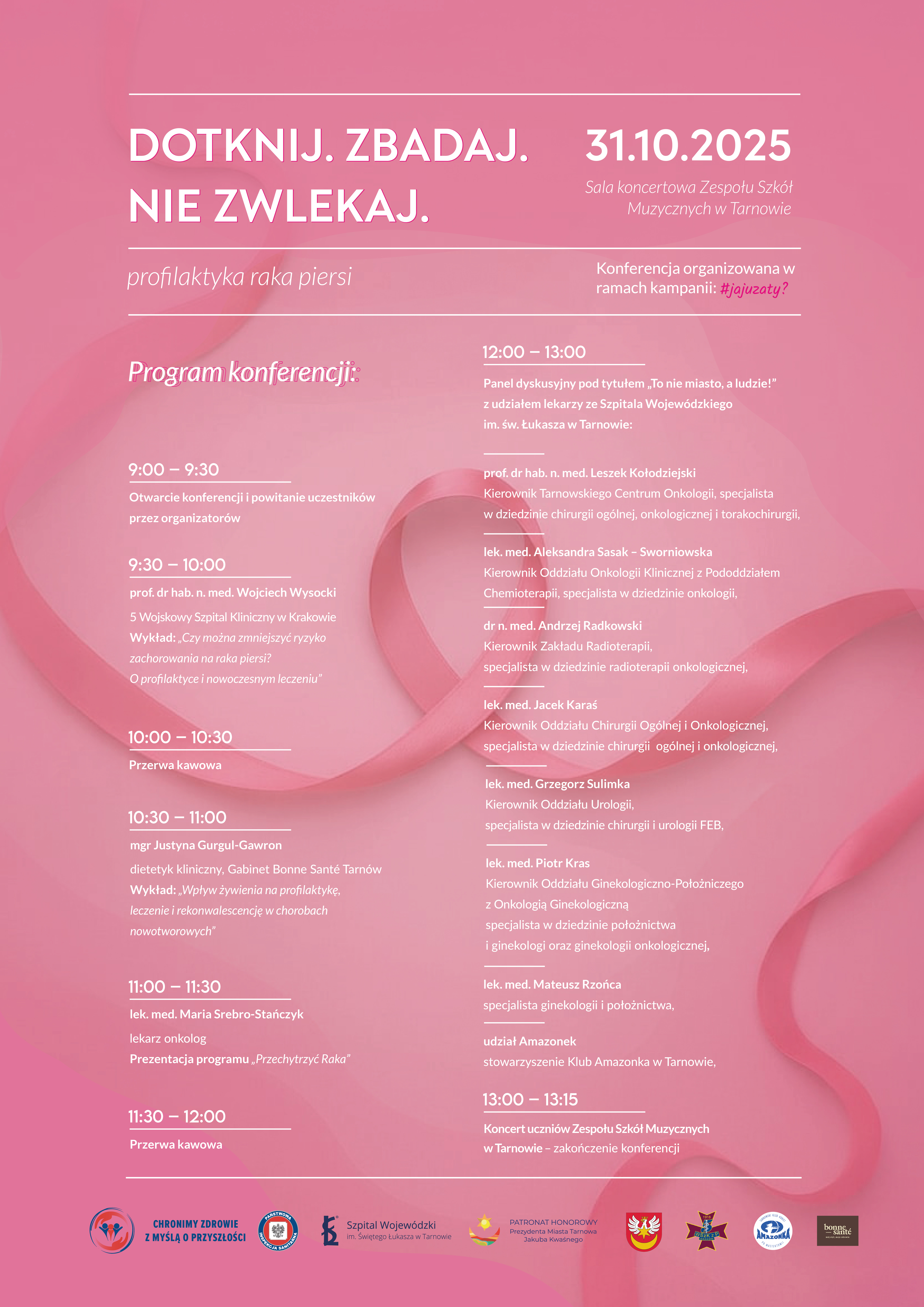 - prof. dr hab. n. med. Wojciech Wysocki (5 Wojskowy Szpital Kliniczny w Krakowie) – wybitny chirurg onkolog, który opowie o możliwościach współczesnej medycyny w zmniejszaniu ryzyka raka piersi.