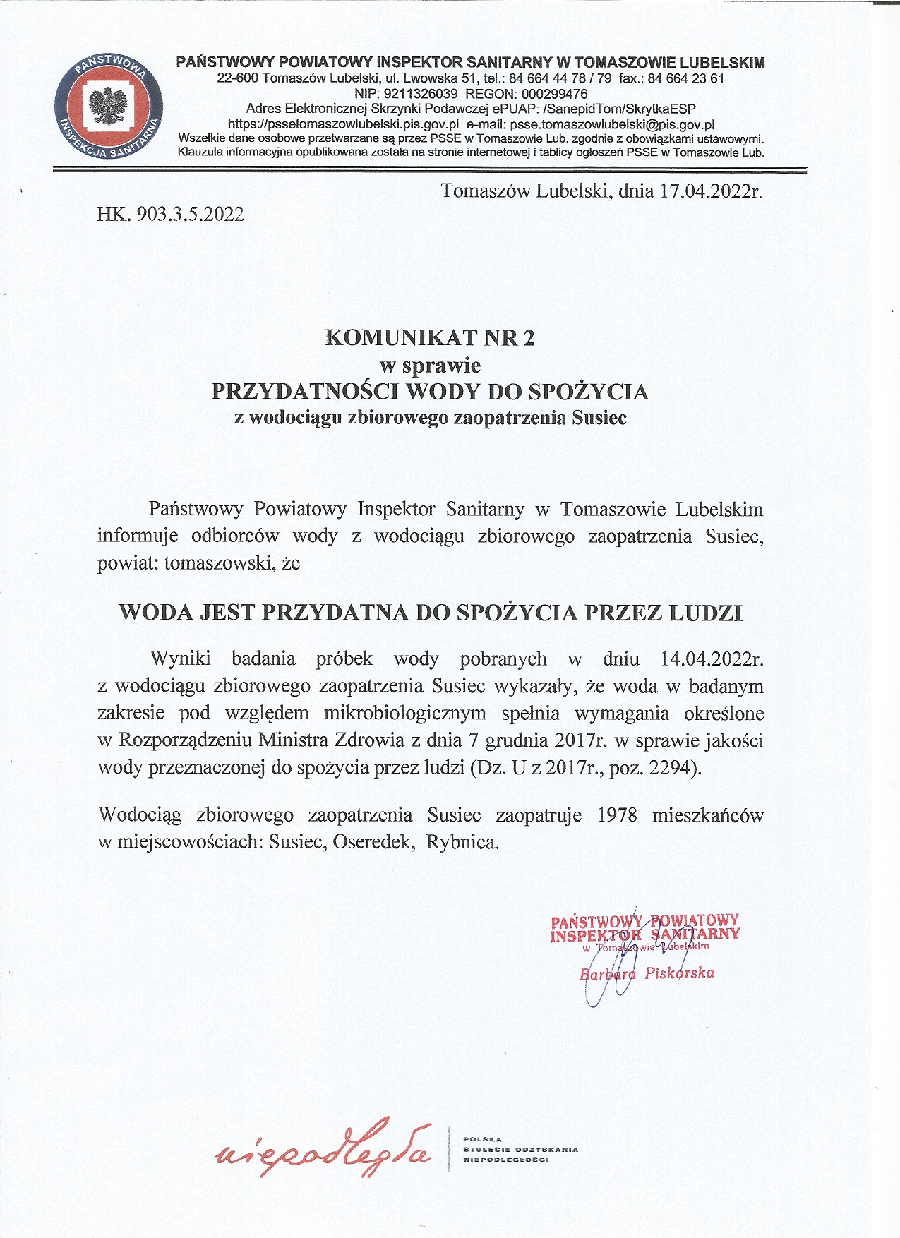 Komunikat Nr2 z dnia 17.04.2022r. w sprawie przydatności wody do spożycia z wodociągu zbiorowego zaopatrzenia w wodę Susiec