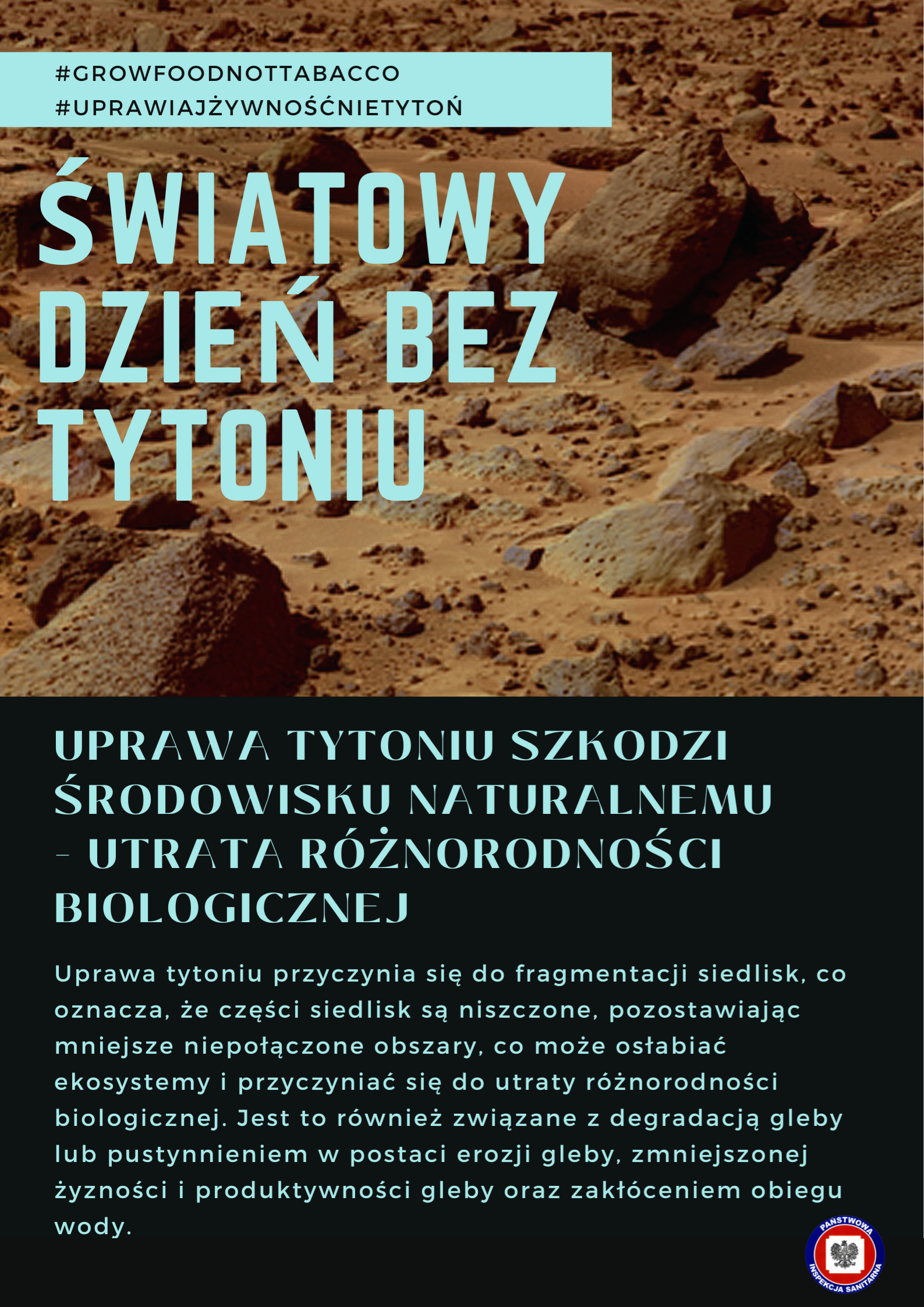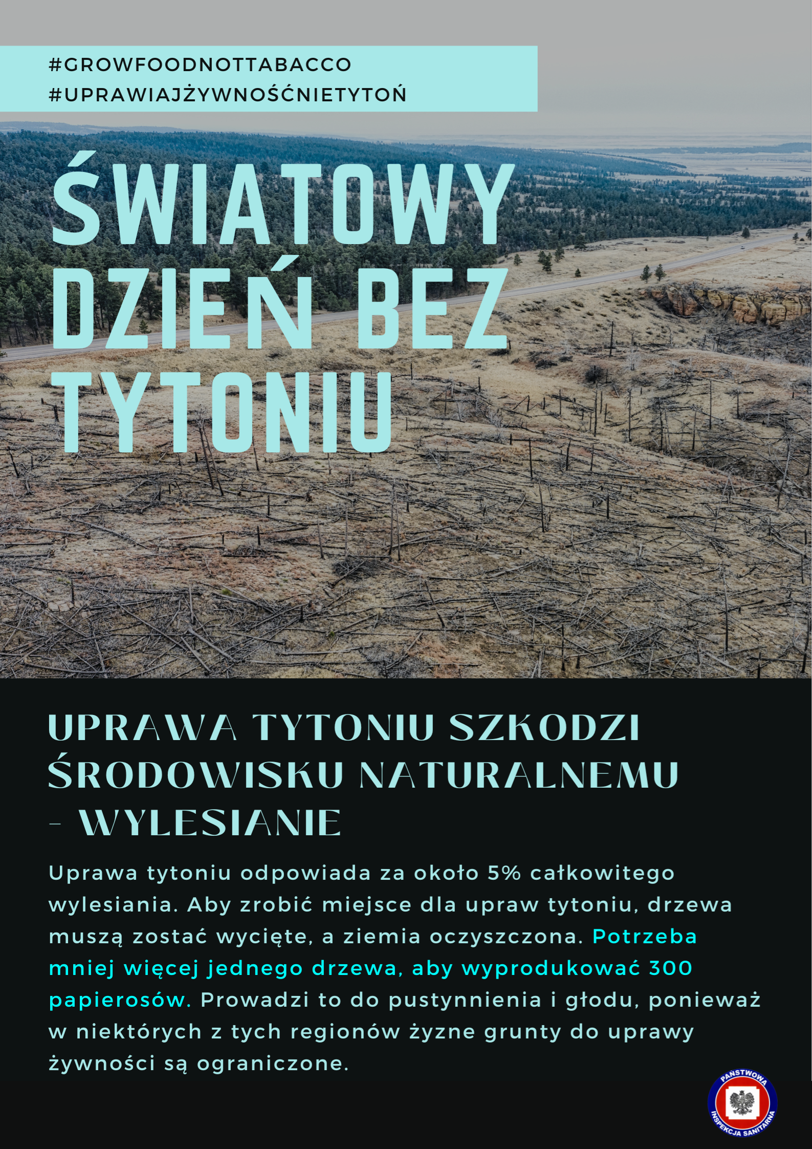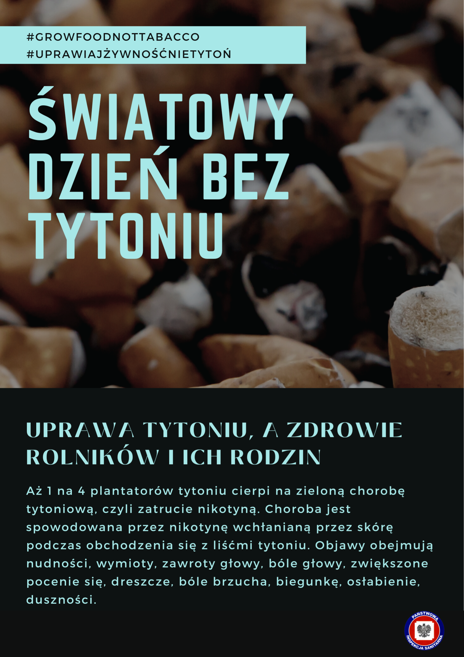 Tegorocznym obchodom Światowego Dnia bez Tytoniu przyświeca hasło „Uprawiaj żywność, nie tytoń”. Uprawa tytoniu szkodzi naszemu zdrowiu, zdrowiu rolników i zdrowiu planety. Przemysł tytoniowy blokuje próby zastąpienia uprawy tytoniu innymi uprawami, przyczyniając się do światowego kryzysu żywnościowego.