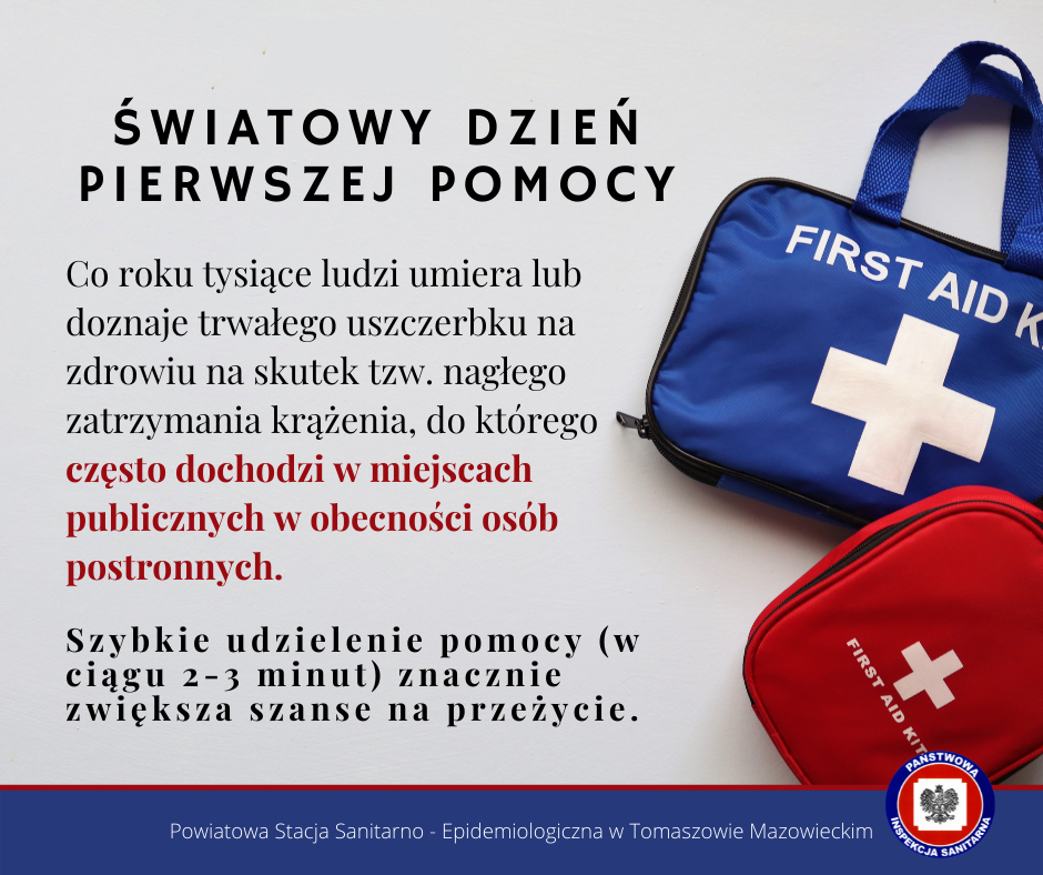 Światowy Dzień Pierwszej Pomocy obchodzony w drugą sobotę września – ustanowiony został w 2000 roku z inicjatywy Międzynarodowego Ruchu Czerwonego Krzyża. Święto to ma na celu uświadomienie, jak ważna jest umiejętność udzielenia pierwszej pomocy, a także promowanie akcji edukacyjnych wśród obywateli.