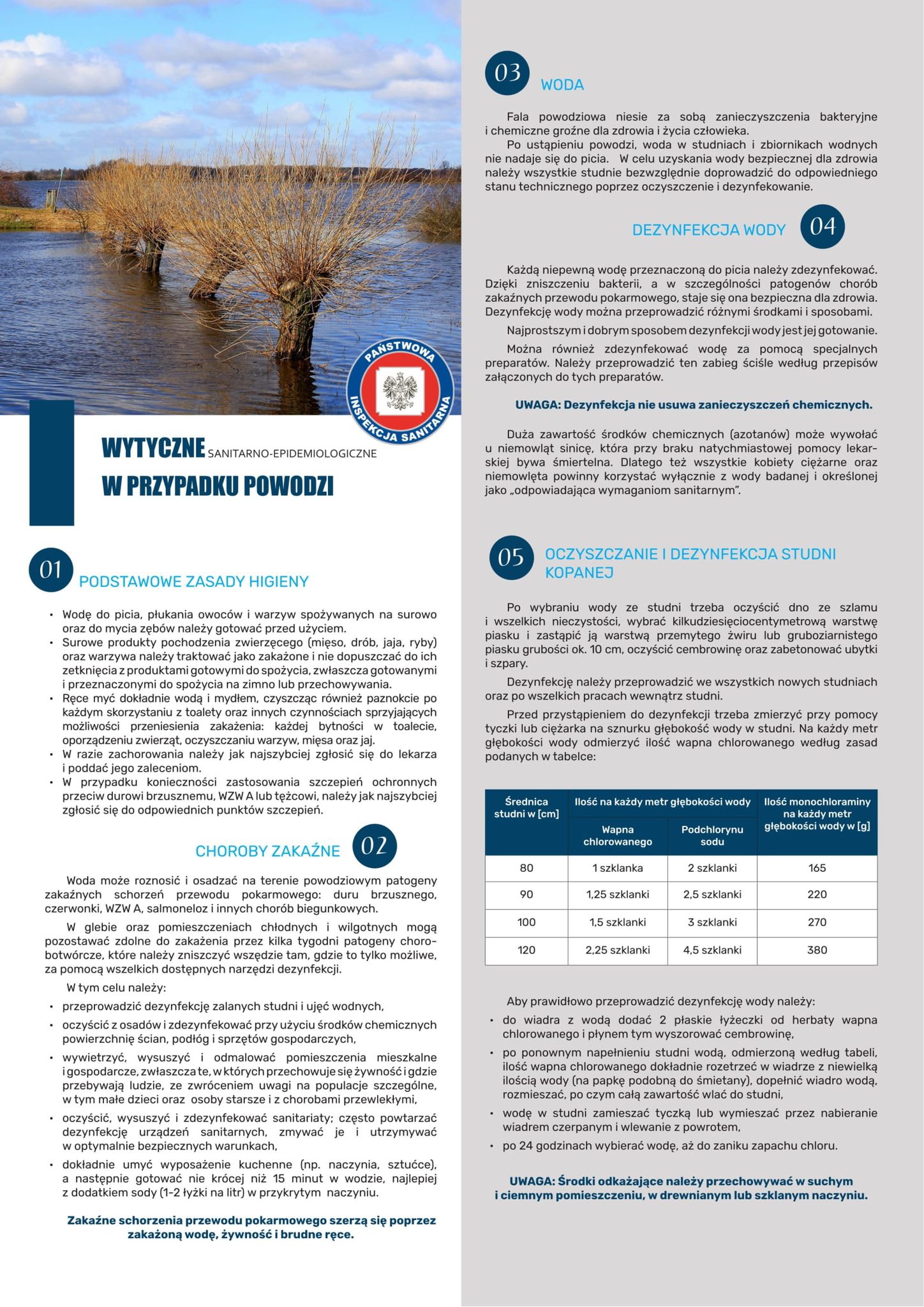 Fala powodziowa niesie ze sobą zanieczyszczenia biologiczne, fizyczne i chemiczne groźne dla zdrowia i życia ludzi i zwierząt. W trakcie powodzi i po opadnięciu wody, studnie i zbiorniki wodne nie mogą być źródłem wody do picia. W celu uzyskania wody bezpiecznej dla zdrowia należy bezwzględnie wszystkie studnie doprowadzić do odpowiedniego stanu technicznego tj. oczyścić je, zdezynfekować, a następnie potwierdzić badaniami przydatność wody do spożycia.