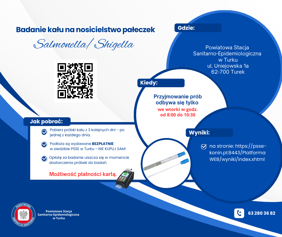 Kał na nosicielstwo pałeczek Salmonella/Shigella przyjmowany jest w wymazówkach z podłożem transportowym (próbki kału pobrane z 3 kolejnych dni - po jednej z każdego dnia), podłoża są wydawane bezpłatnie w siedzibie PSSE w Turku.
