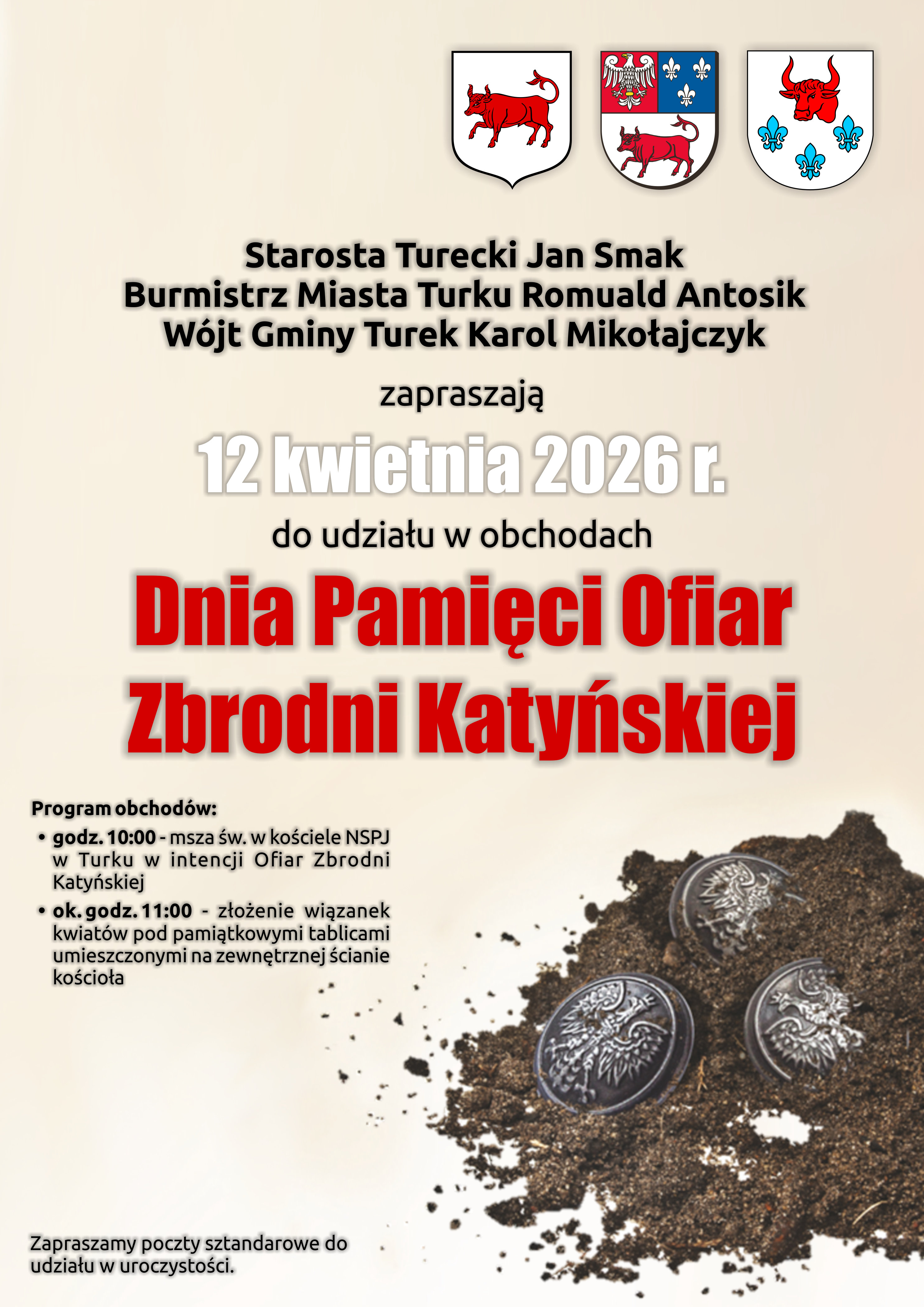 Starosta Turecki Jan Smak, Burmistrz Miasta Turku Romuald Antosik, Wójt Gminy Turek Karol Mikołajczyk zapraszają na uroczyste obchody Dnia Pamięci Ofiar Zbrodni Katyńskiej, które odbędą się 12 kwietnia 2026 roku w Turku.